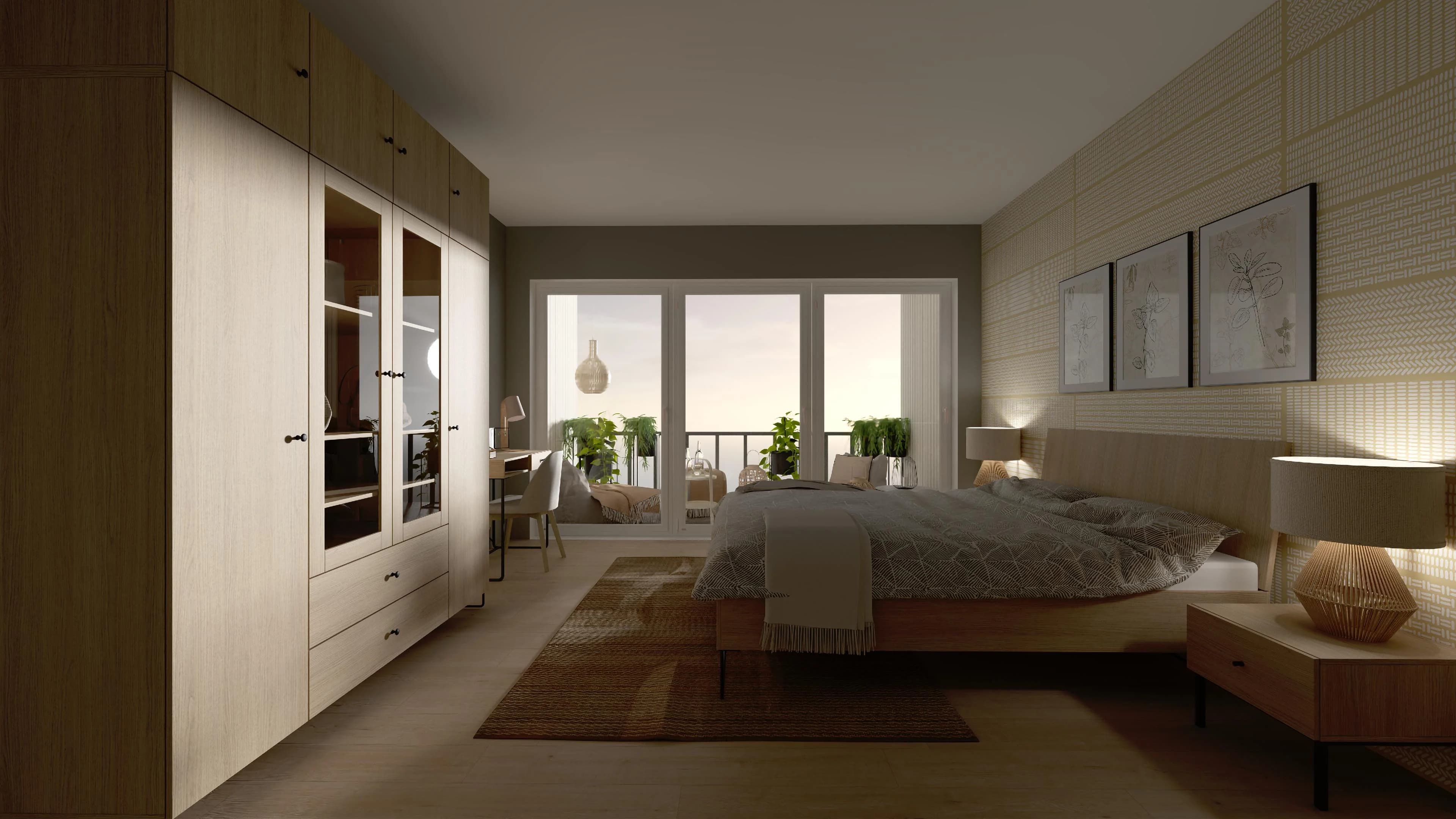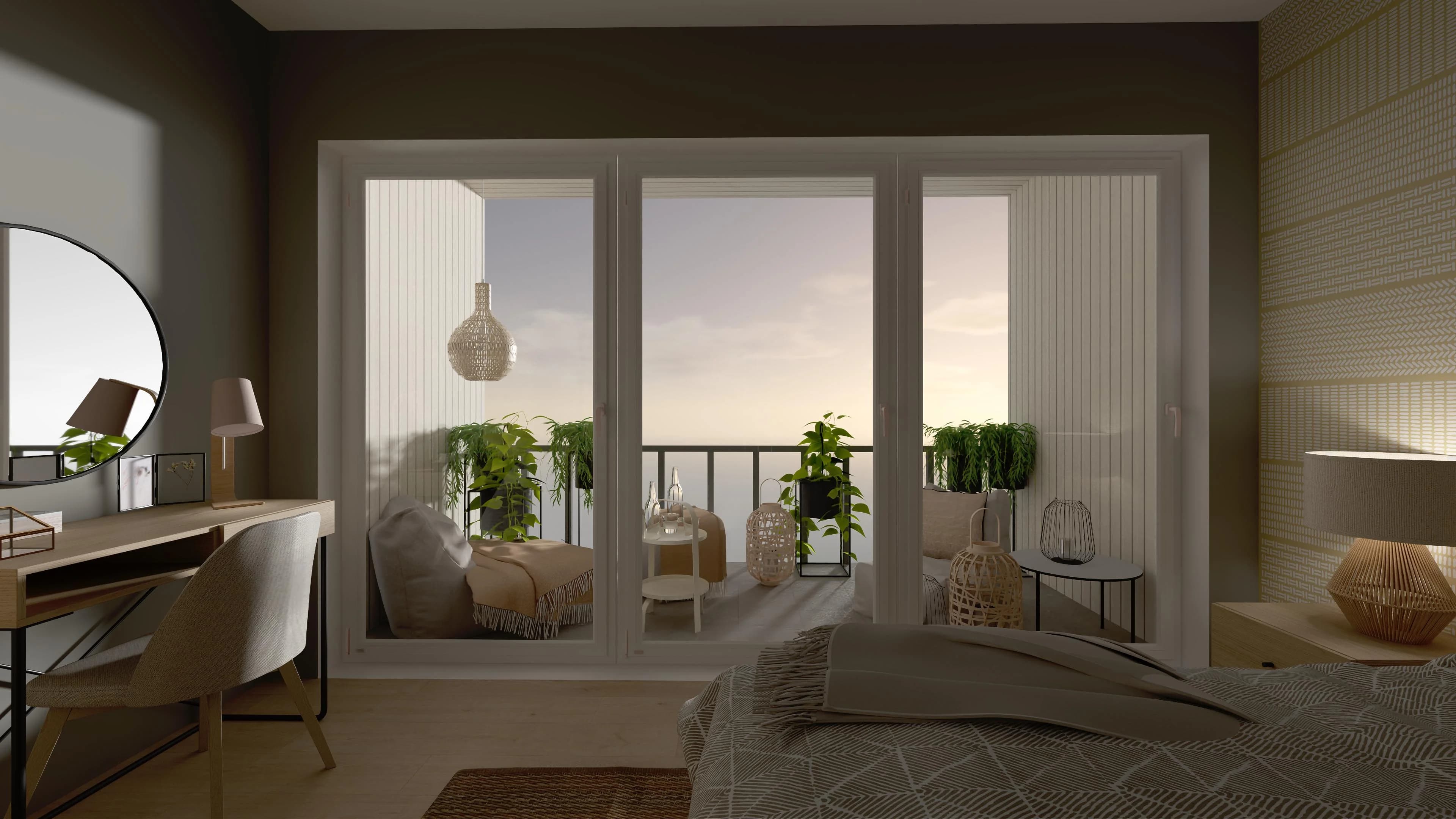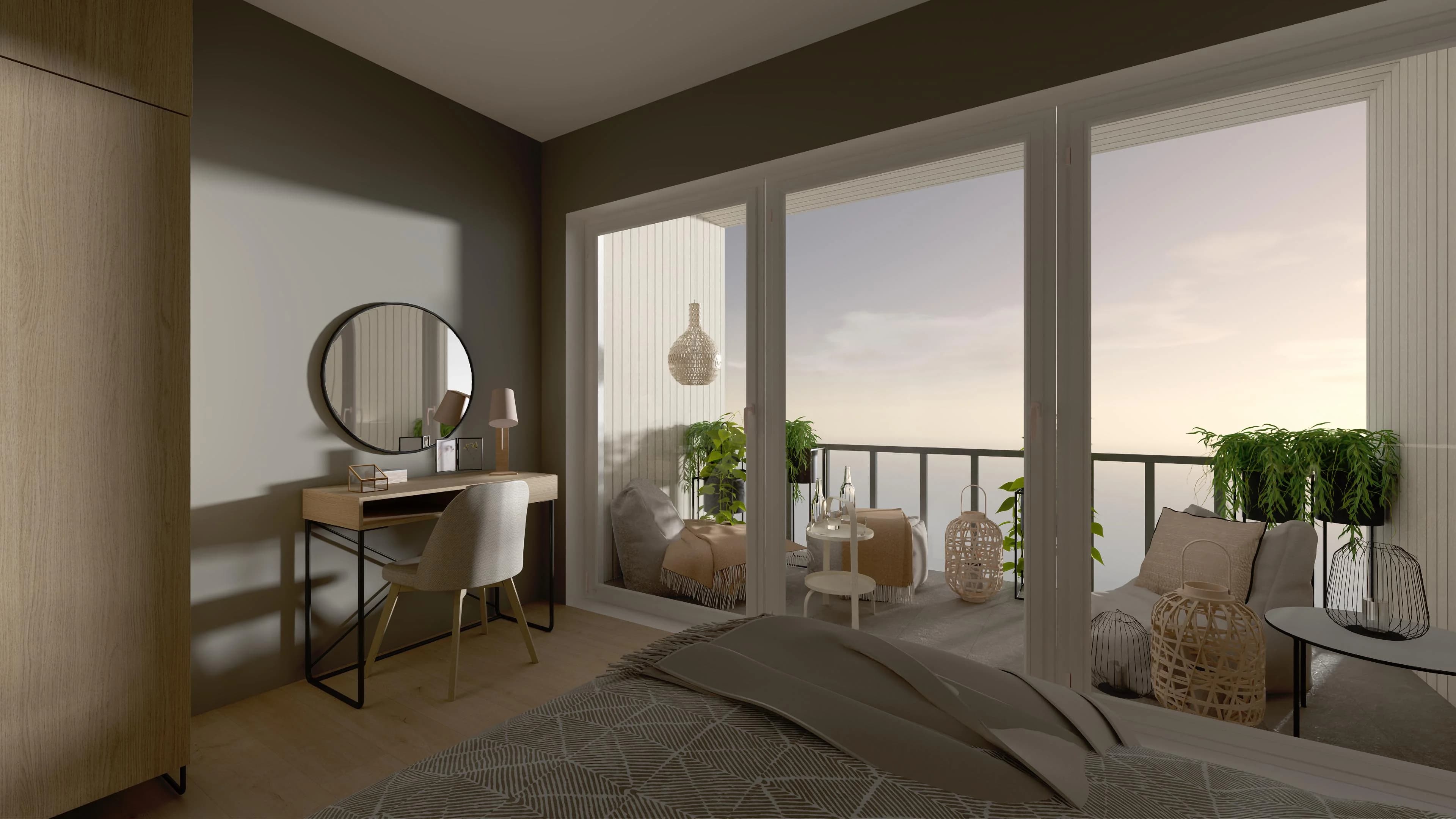 Przestronna sypialnia, dzięki dużej szafie, zastąpi oddzielną garderobę. Dwuosobowe łóżko posiada wysokie wezgłowie, które stanowi wygodne oparcie dla głowy i zabezpiecza ścianę. Przytulny nastrój jest zasługą klimatycznych lamp i miękkich tekstyliów. Wystarczy kilka kroków, by wejść na słoneczny balkon z miękkimi pufami i praktycznymi stolikami.
