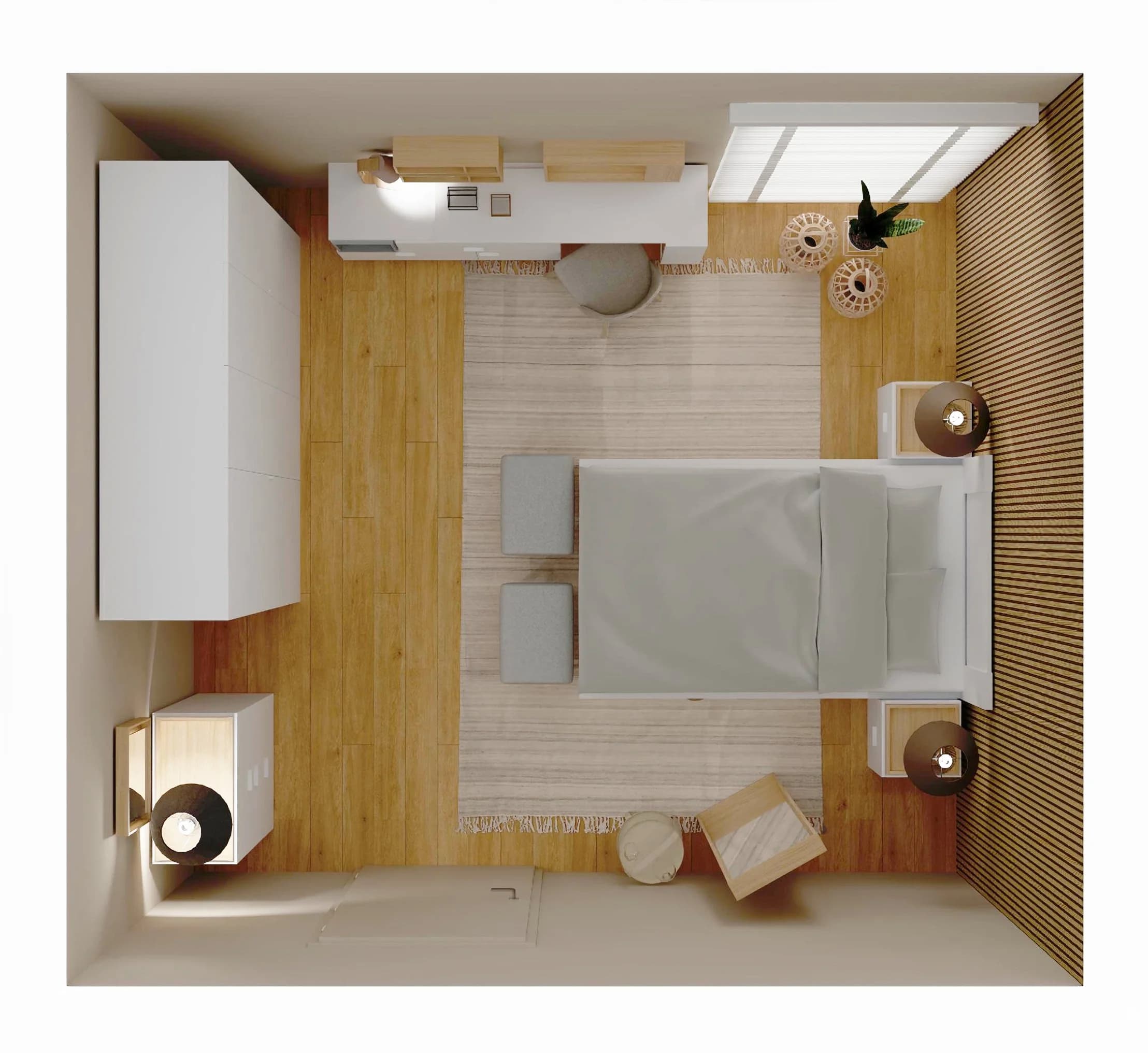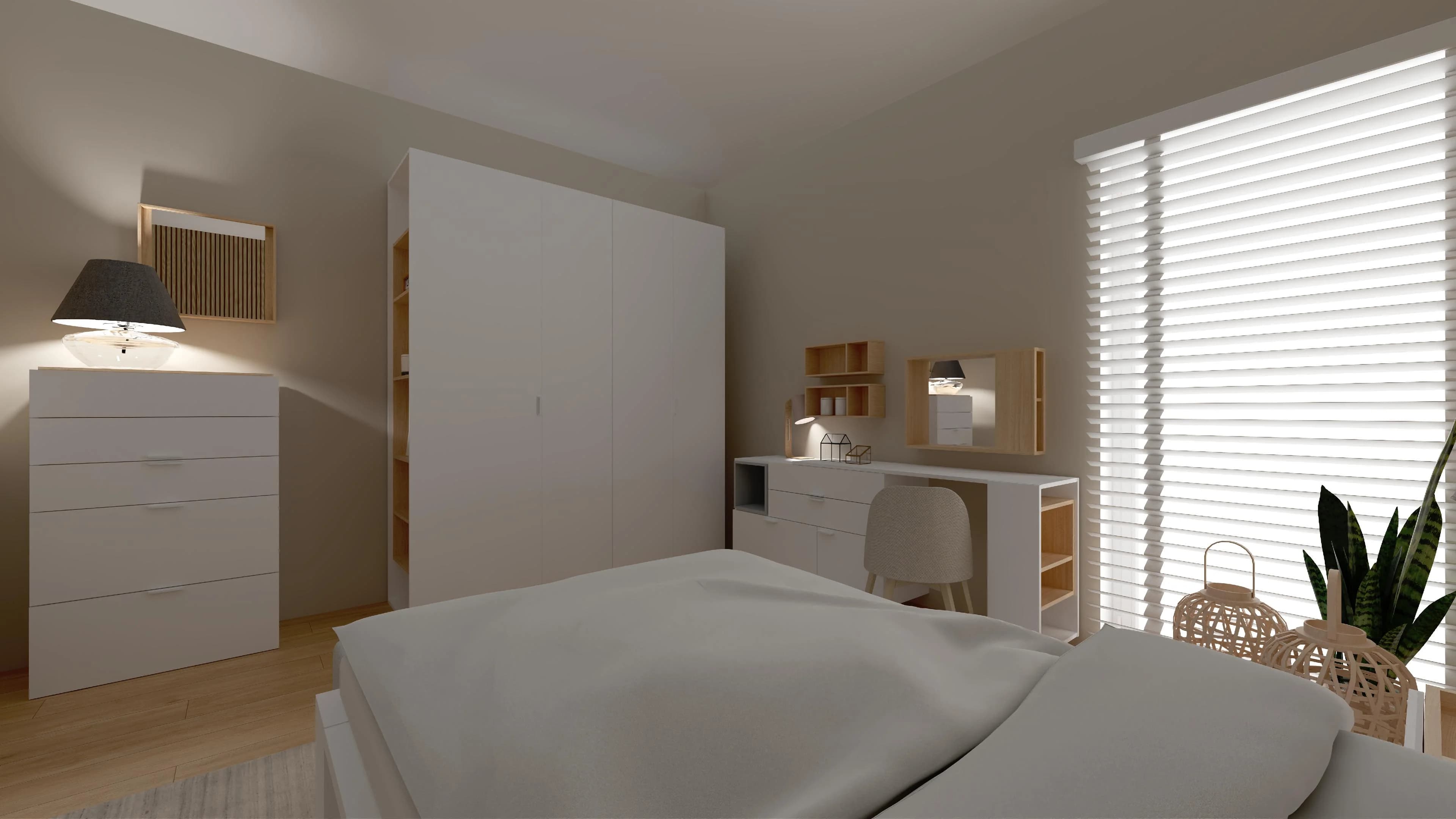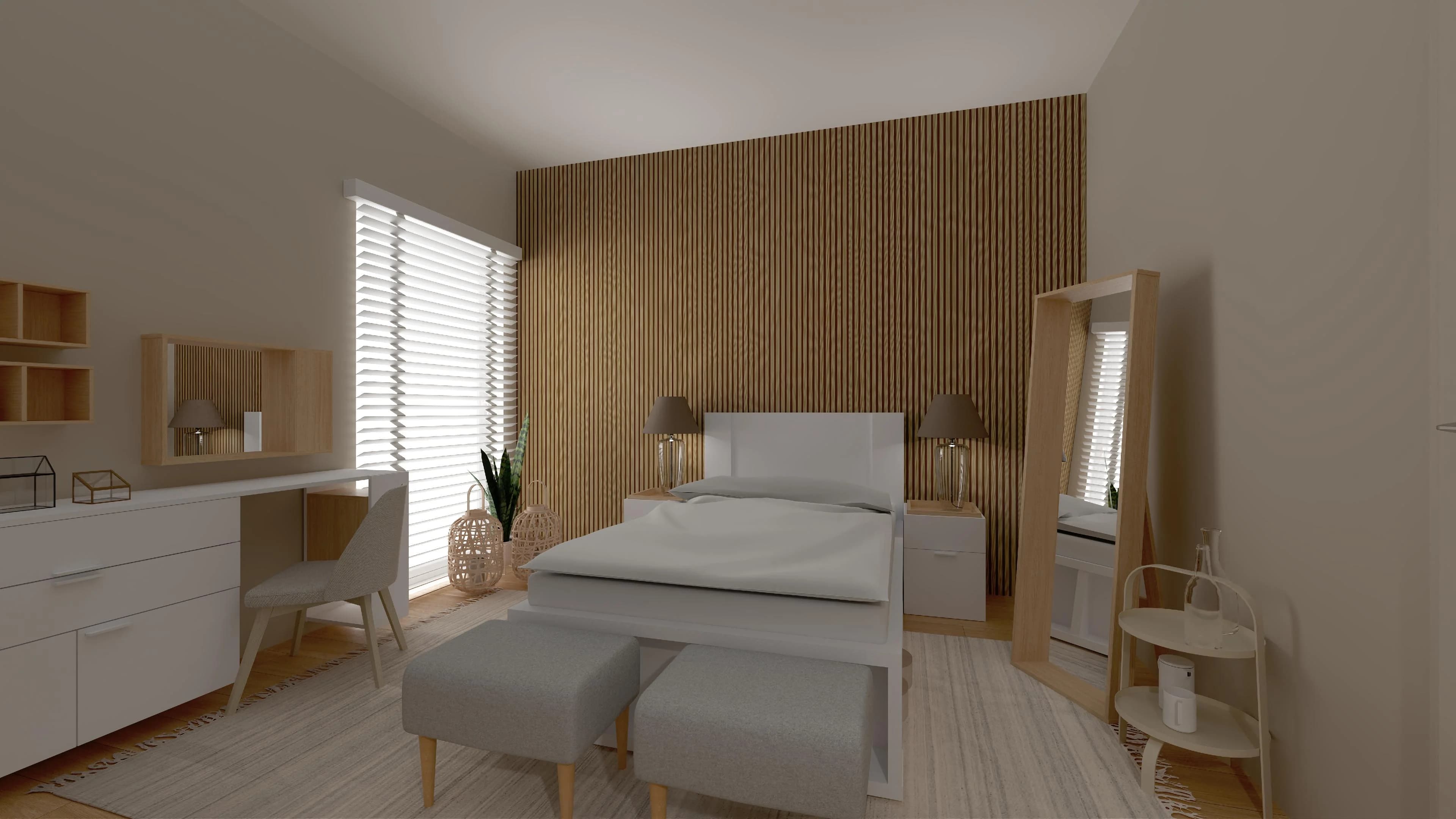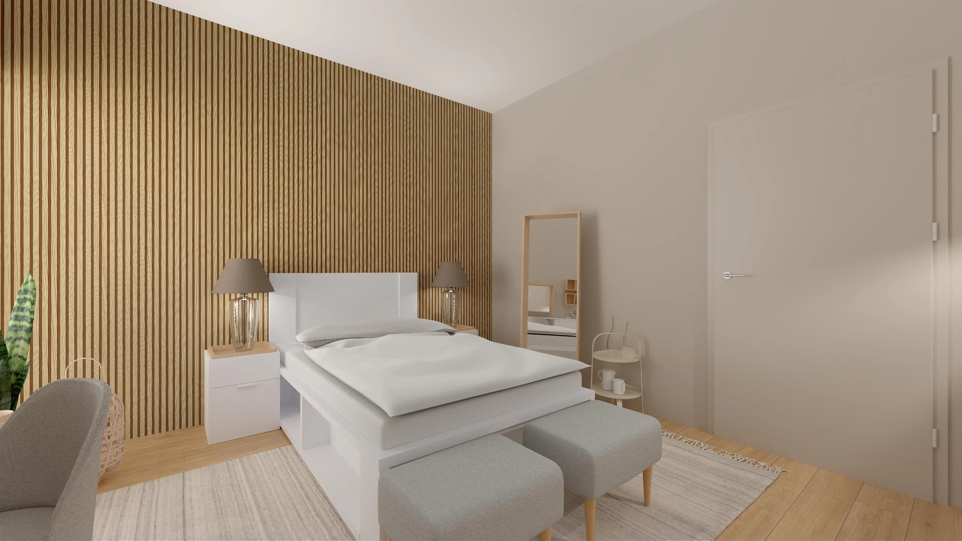 Połączenie barwy drewna i lekkiej bieli sprawia, że w tej sypialni łatwo o atmosferę relaksu. Ważnym elementem wystroju jest ściana lameli, która stanowi tło dla dwuosobowego łóżka z wezgłowiem. Praktyczne biurko zapewnia miejsce do pracy, a dzięki lustrze sprawdza się też w roli toaletki. Pakowne meble pozwalają łatwo zorganizować garderobę i osobiste drobiazgi.