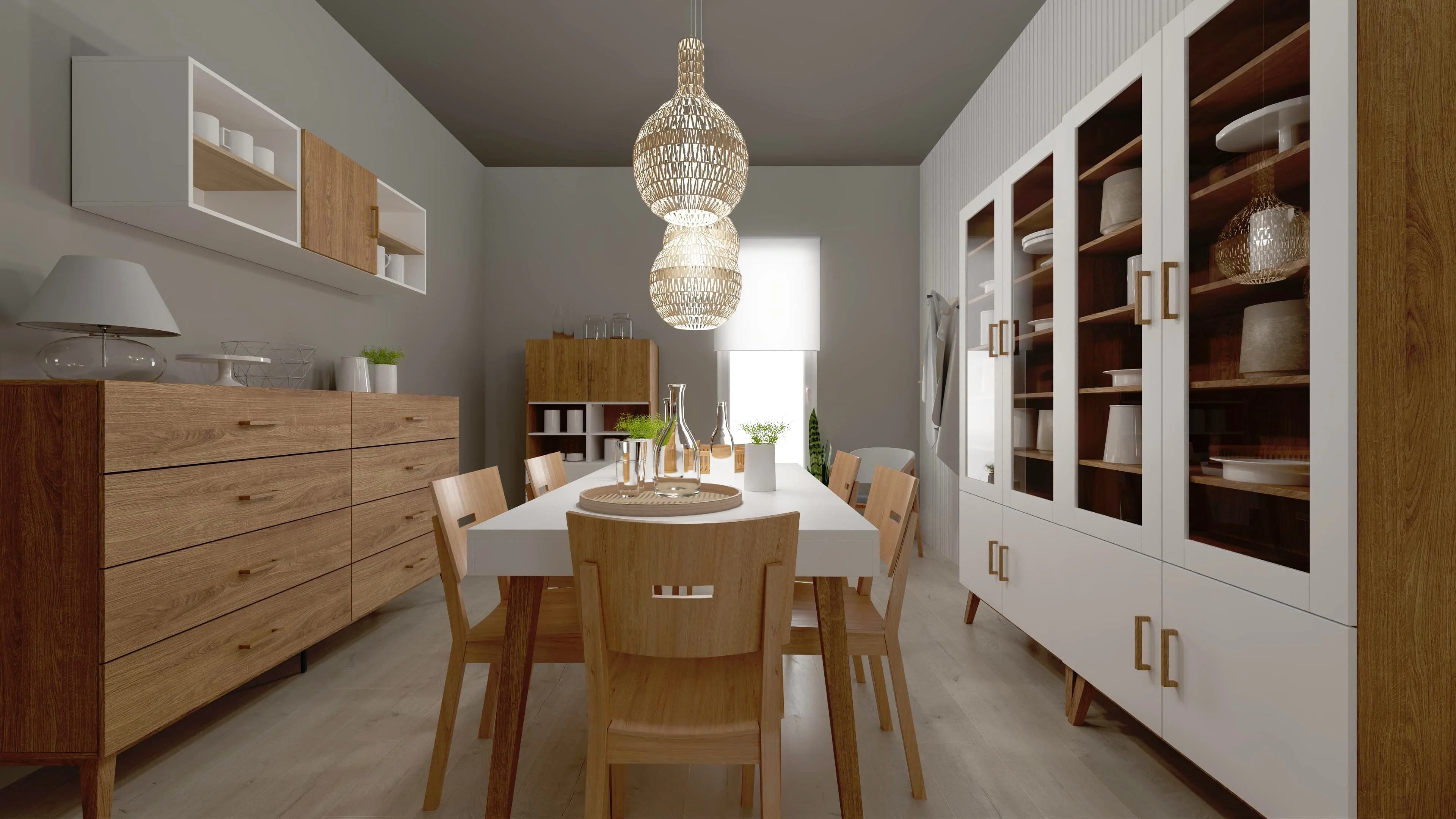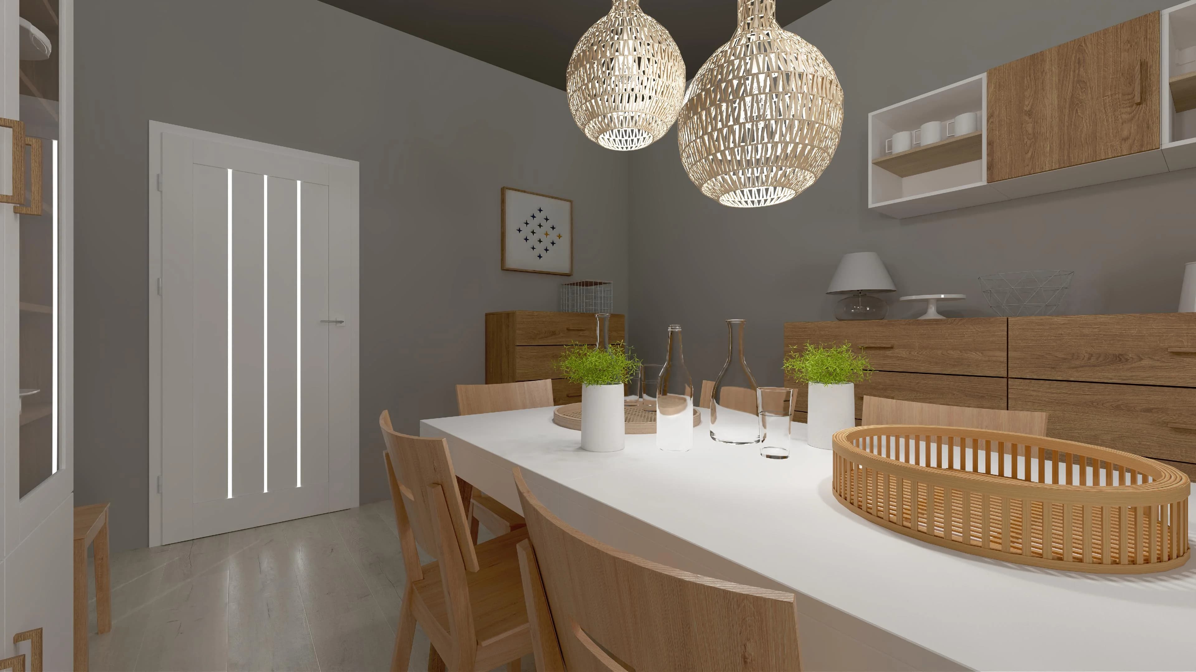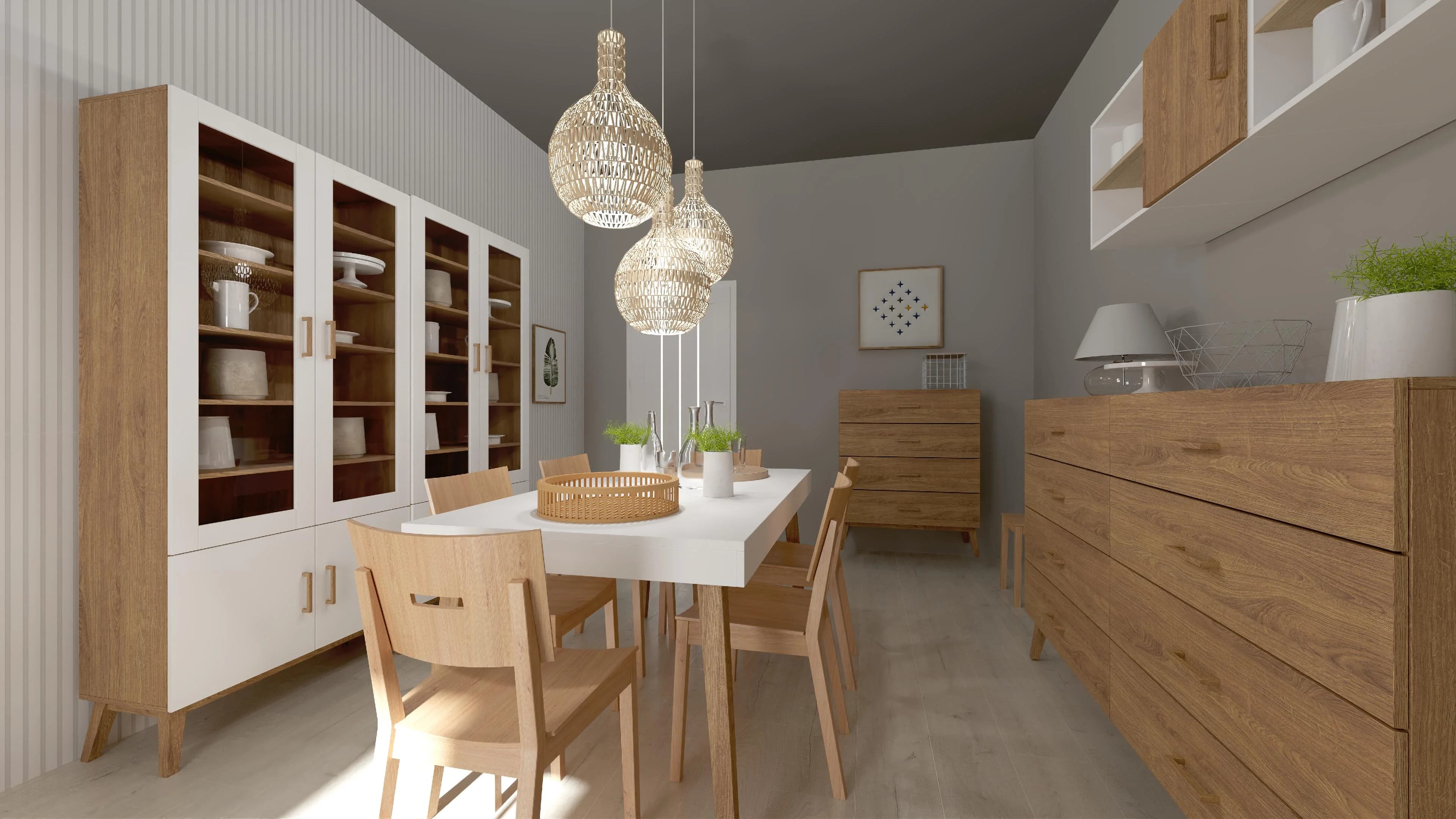 Wnętrze tej jadalni emanuje spokojem i przyjemnie otula. Biały stół ciekawie koresponduje z drewnianymi krzesłami i zapewnia wiele miejsca dla chwil spędzonych razem. W pakownych witrynach można wyeksponować pamiątki i ulubioną zastawę, a domowe drobiazgi ukryć w licznych szufladach. Klimat wnętrza budują naturalne dodatki – duże lampy i grafiki ścienne.