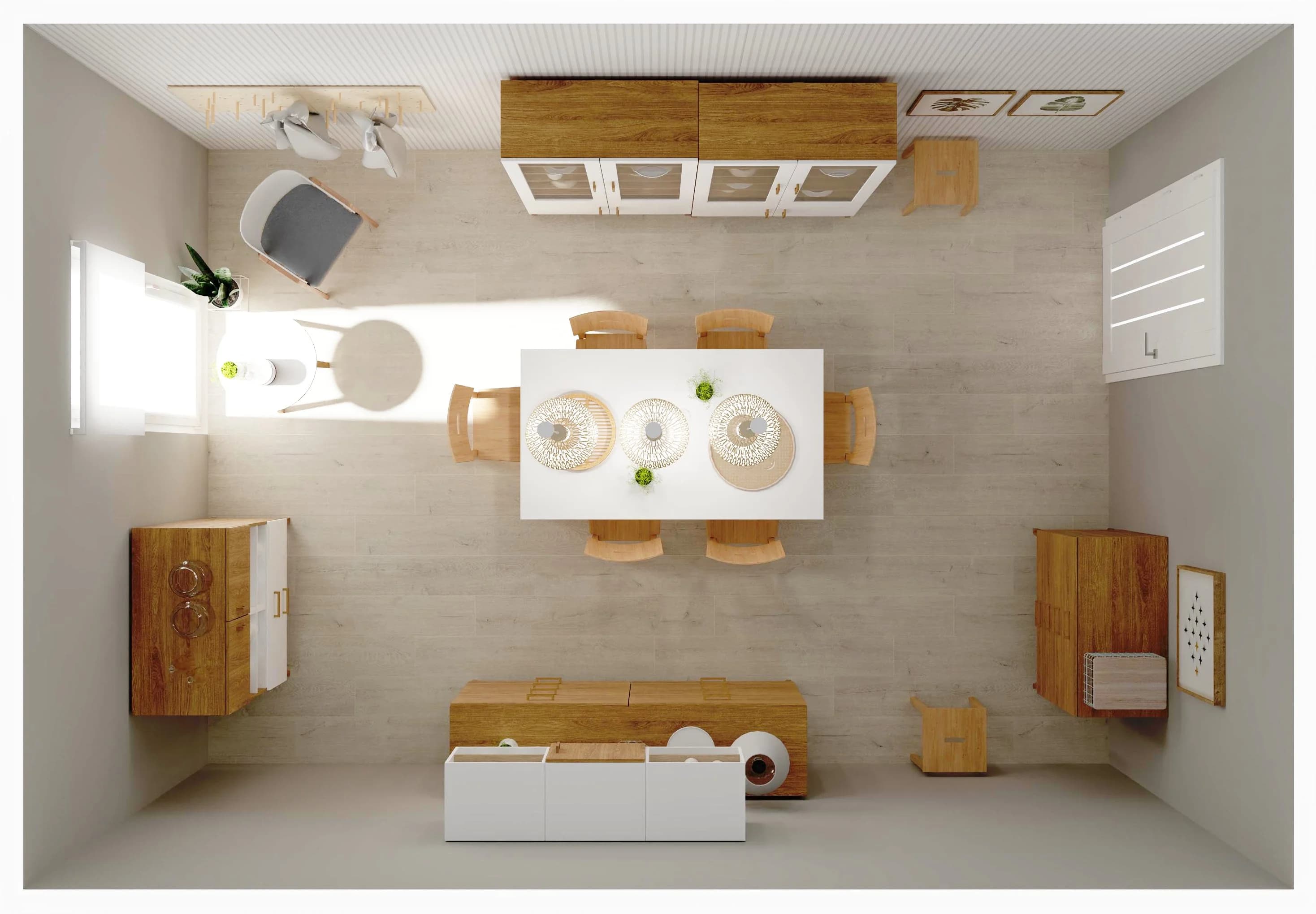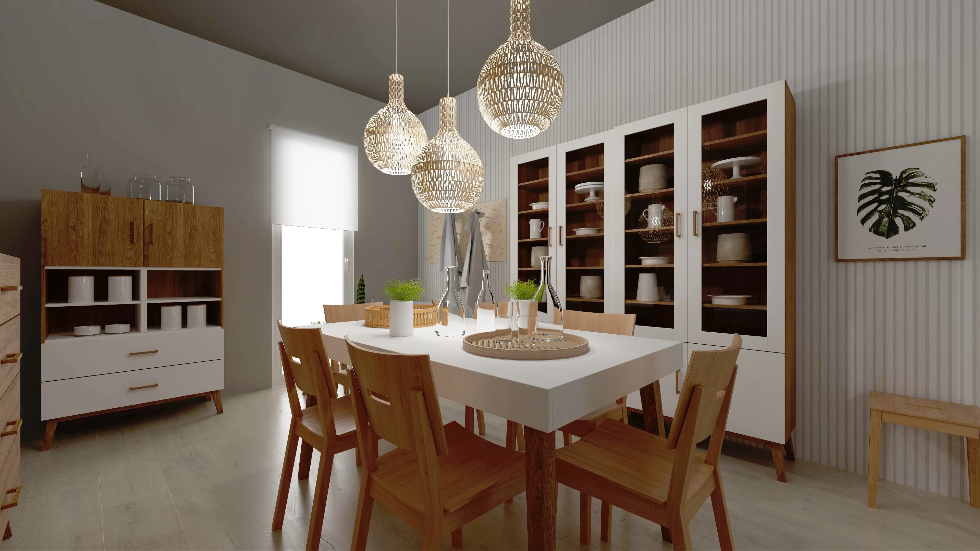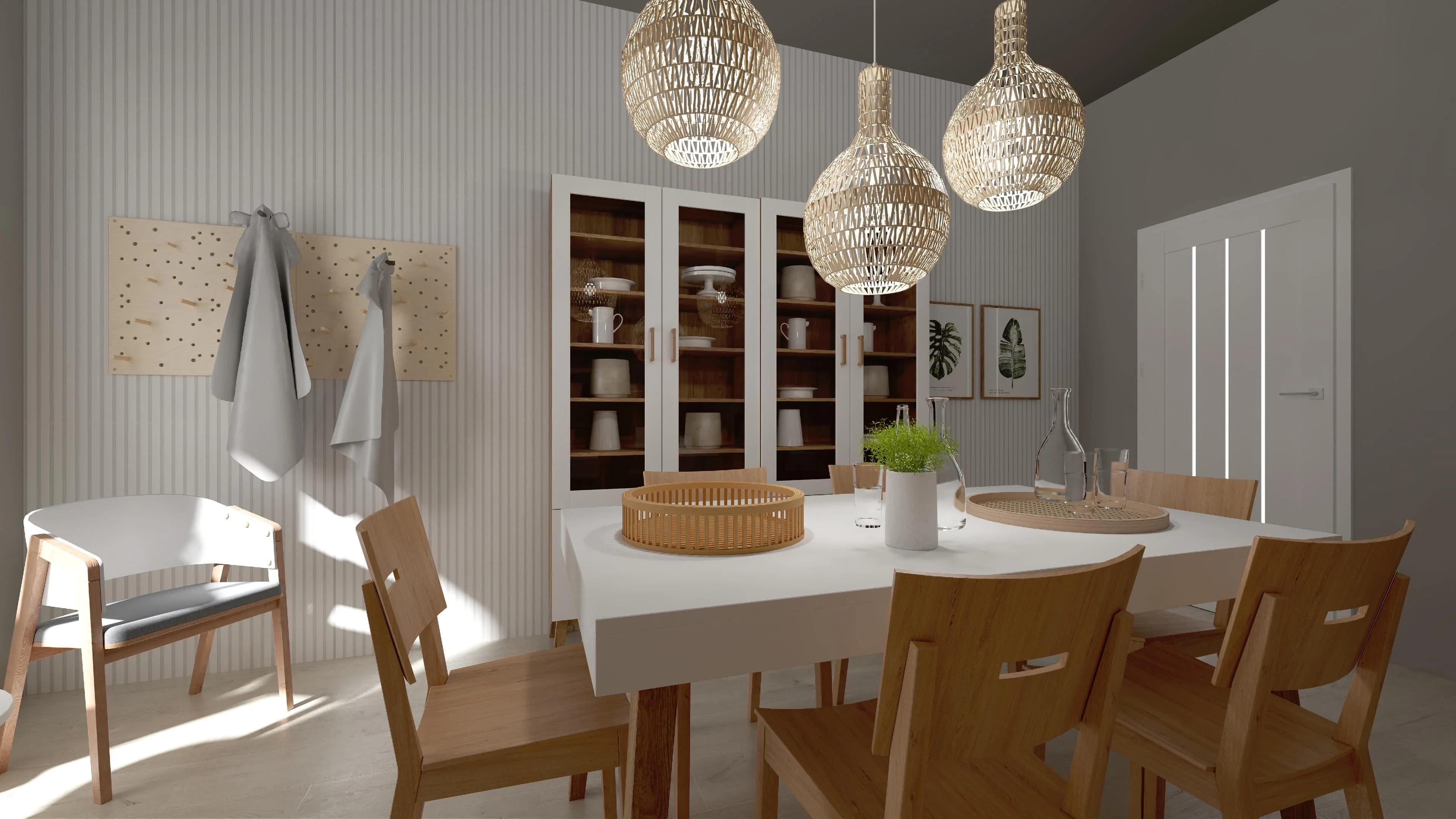 Wnętrze tej jadalni emanuje spokojem i przyjemnie otula. Biały stół ciekawie koresponduje z drewnianymi krzesłami i zapewnia wiele miejsca dla chwil spędzonych razem. W pakownych witrynach można wyeksponować pamiątki i ulubioną zastawę, a domowe drobiazgi ukryć w licznych szufladach. Klimat wnętrza budują naturalne dodatki – duże lampy i grafiki ścienne.