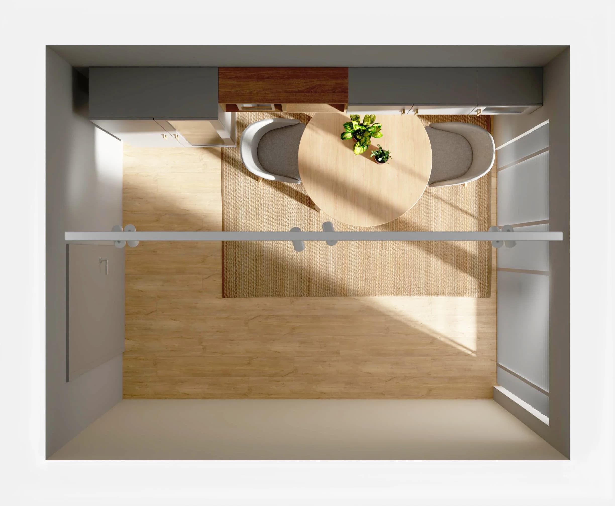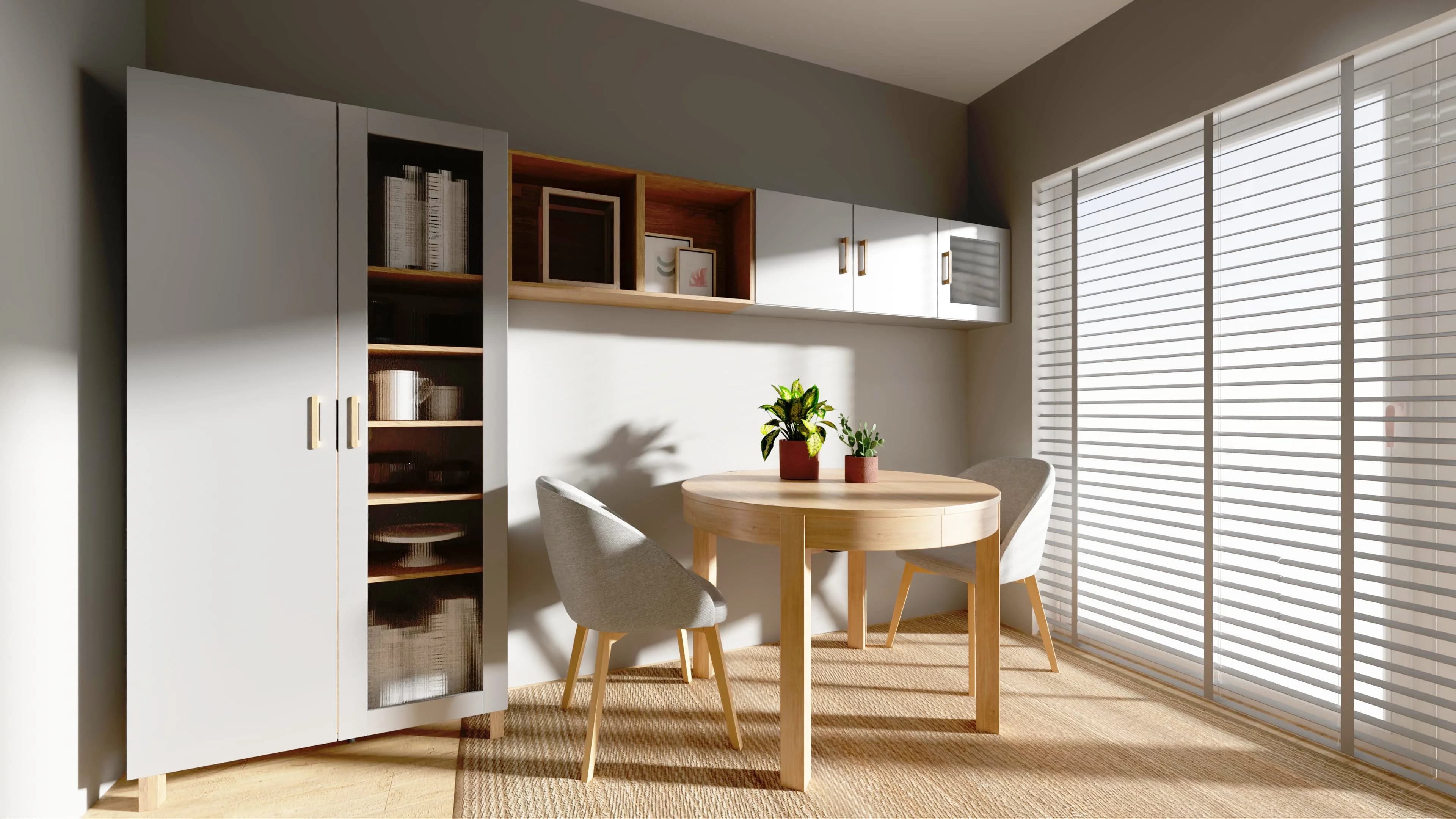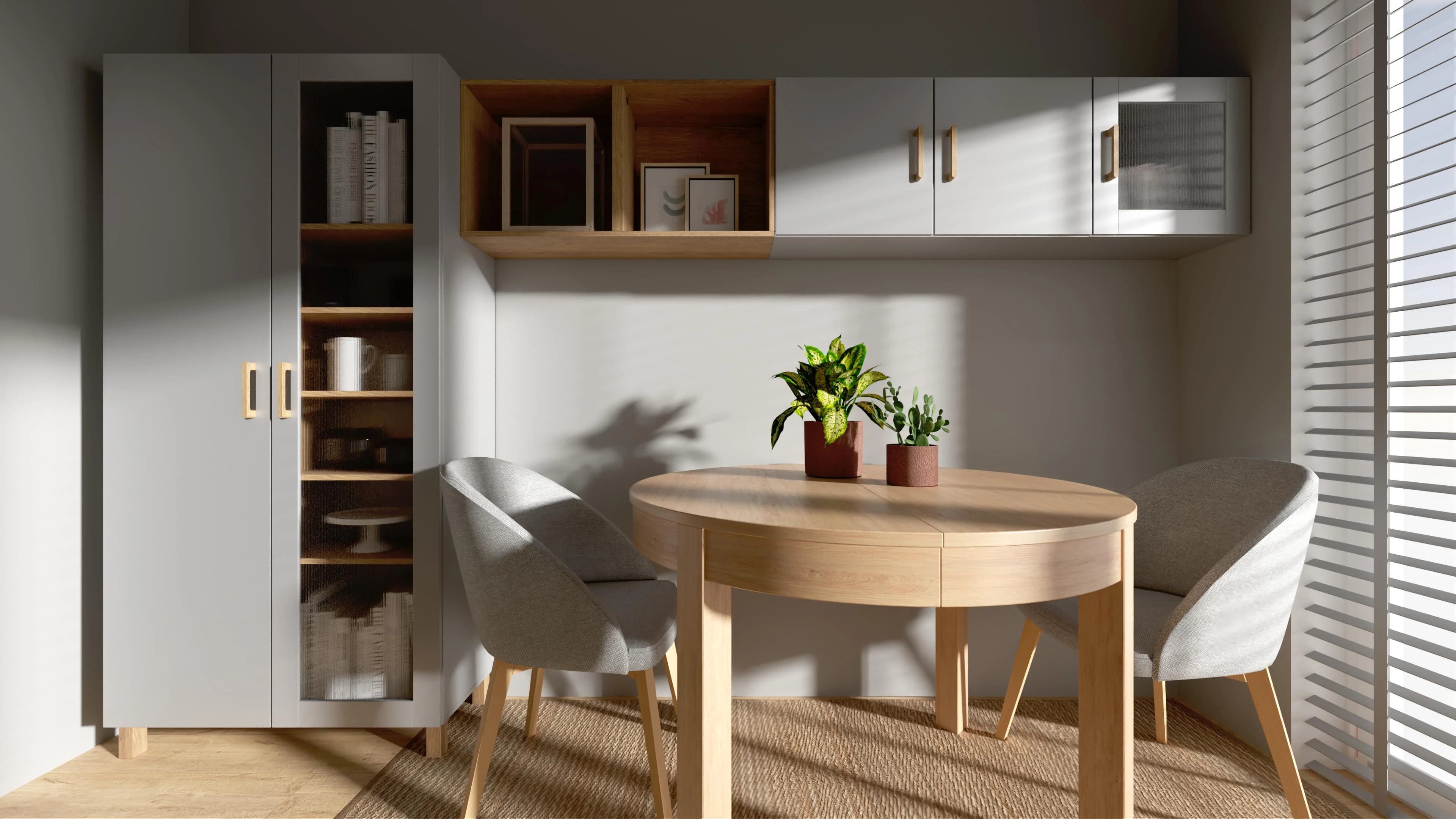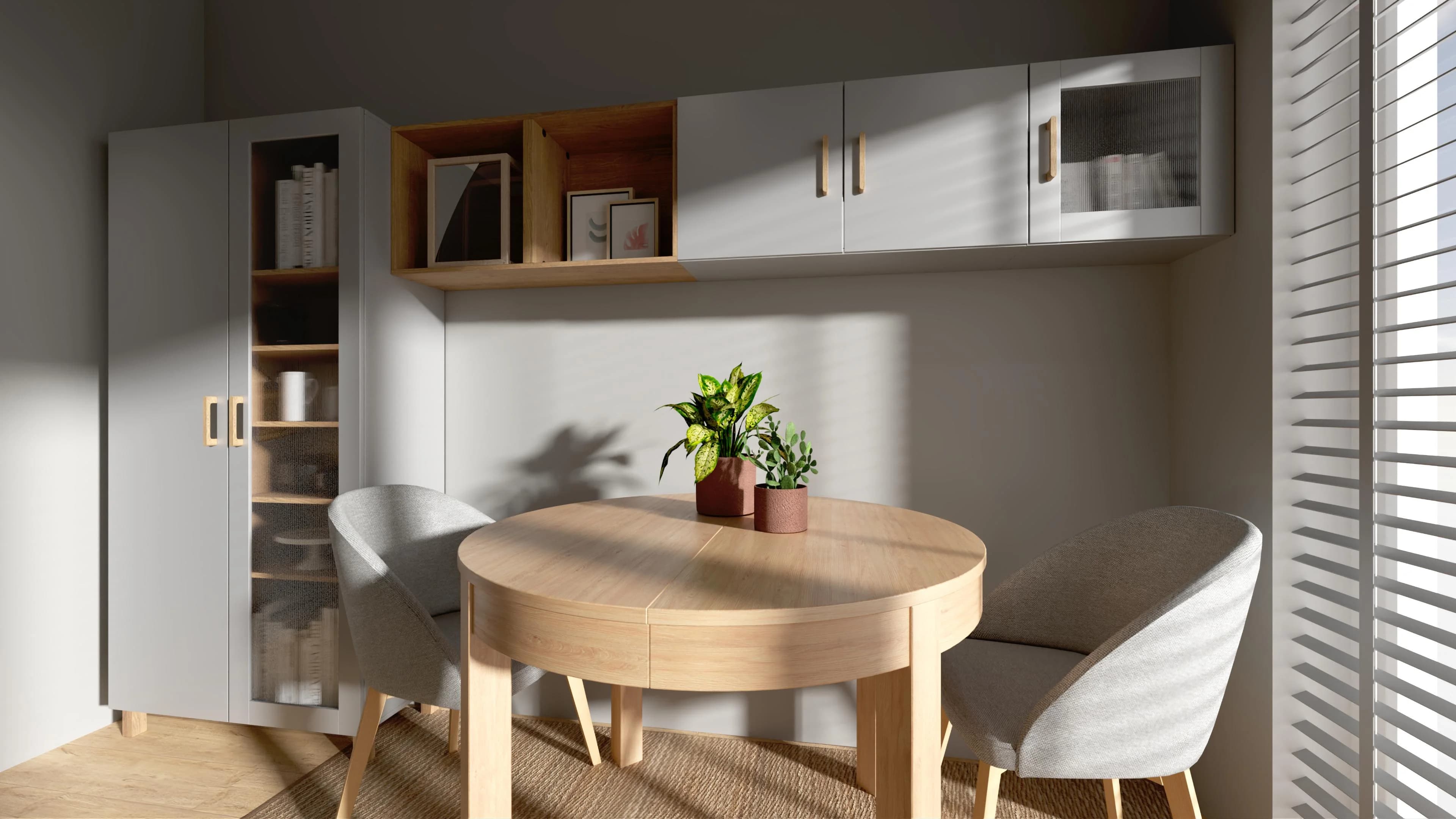 Wnętrze tej jadalni, choć małe, udało się funkcjonalnie zaaranżować. Ustawiony bliżej ściany okrągły stół można łatwo rozłożyć i zyskać więcej miejsca dla gości. Pomysłowe schowki oferują meble – przeszklona witryna i wiszące na ścianie szafki. Dzięki ciepłym kolorom drewna, które przełamują szarość, przestrzeń zyskuje na wyrazie i sprzyja byciu razem.