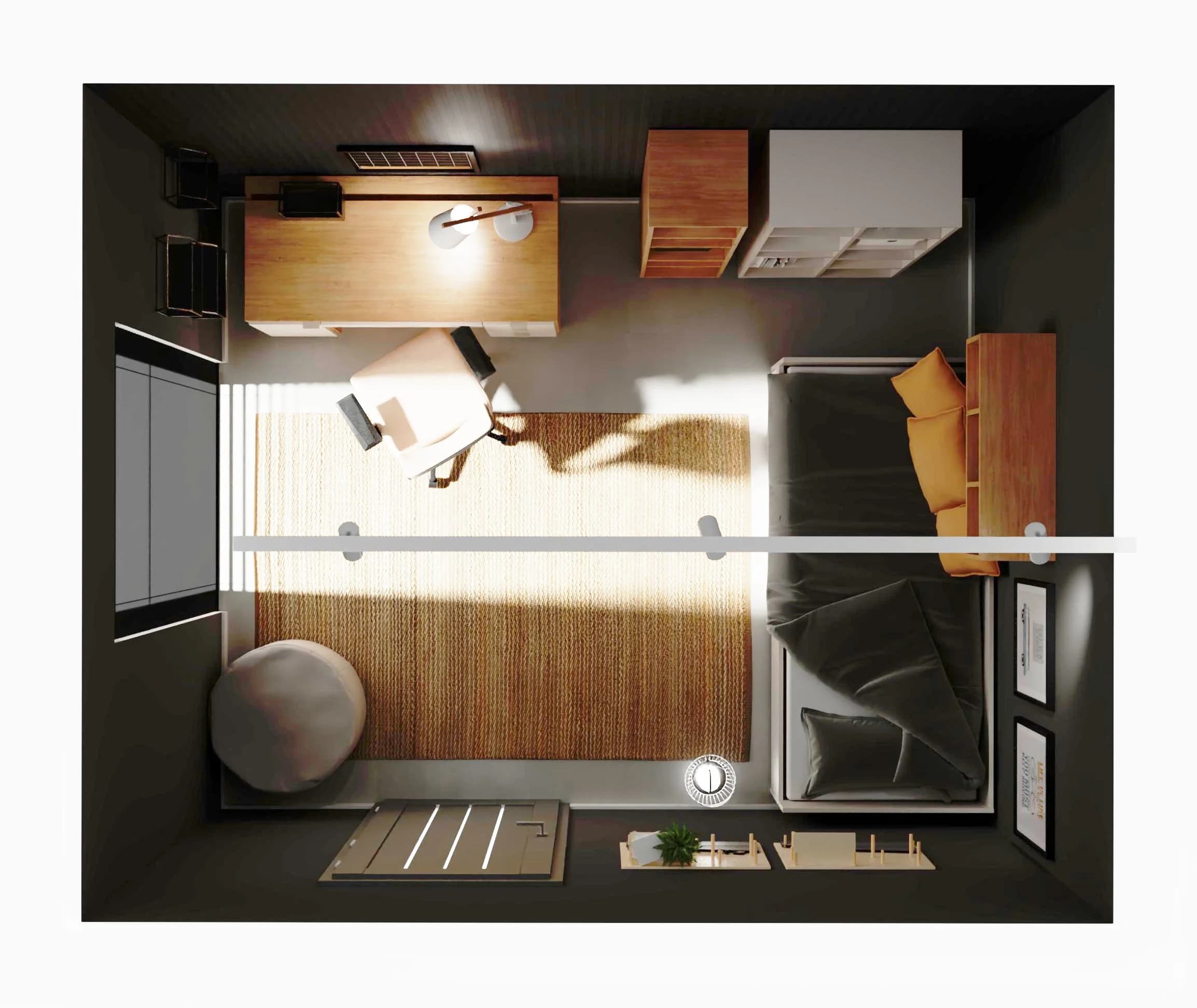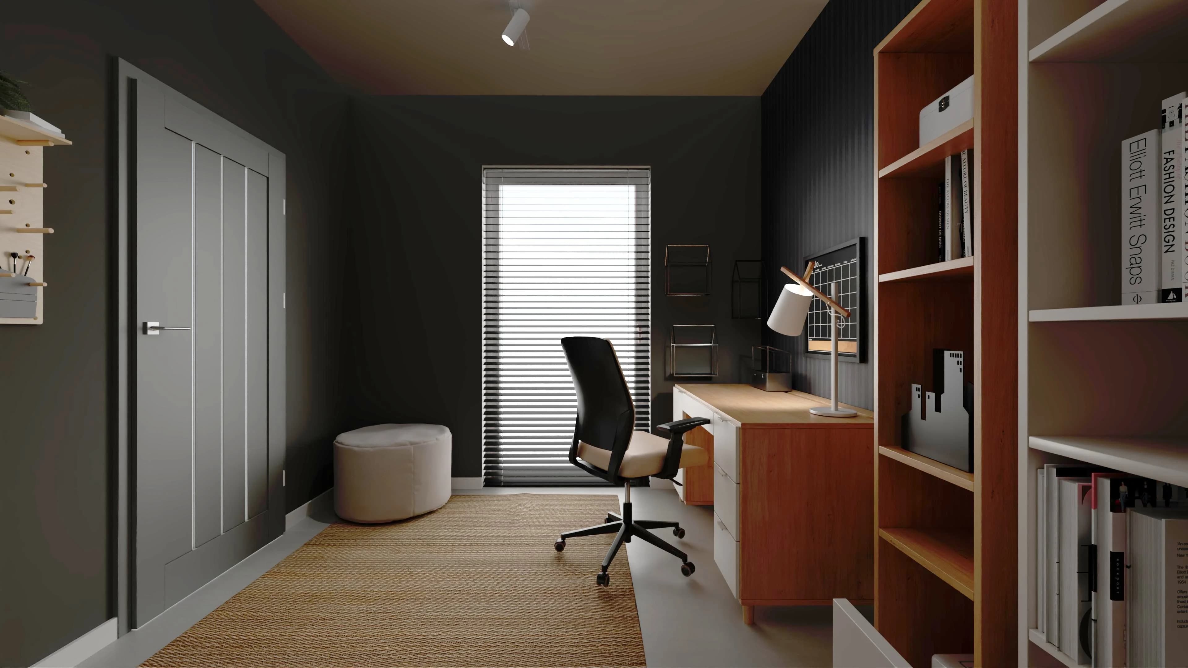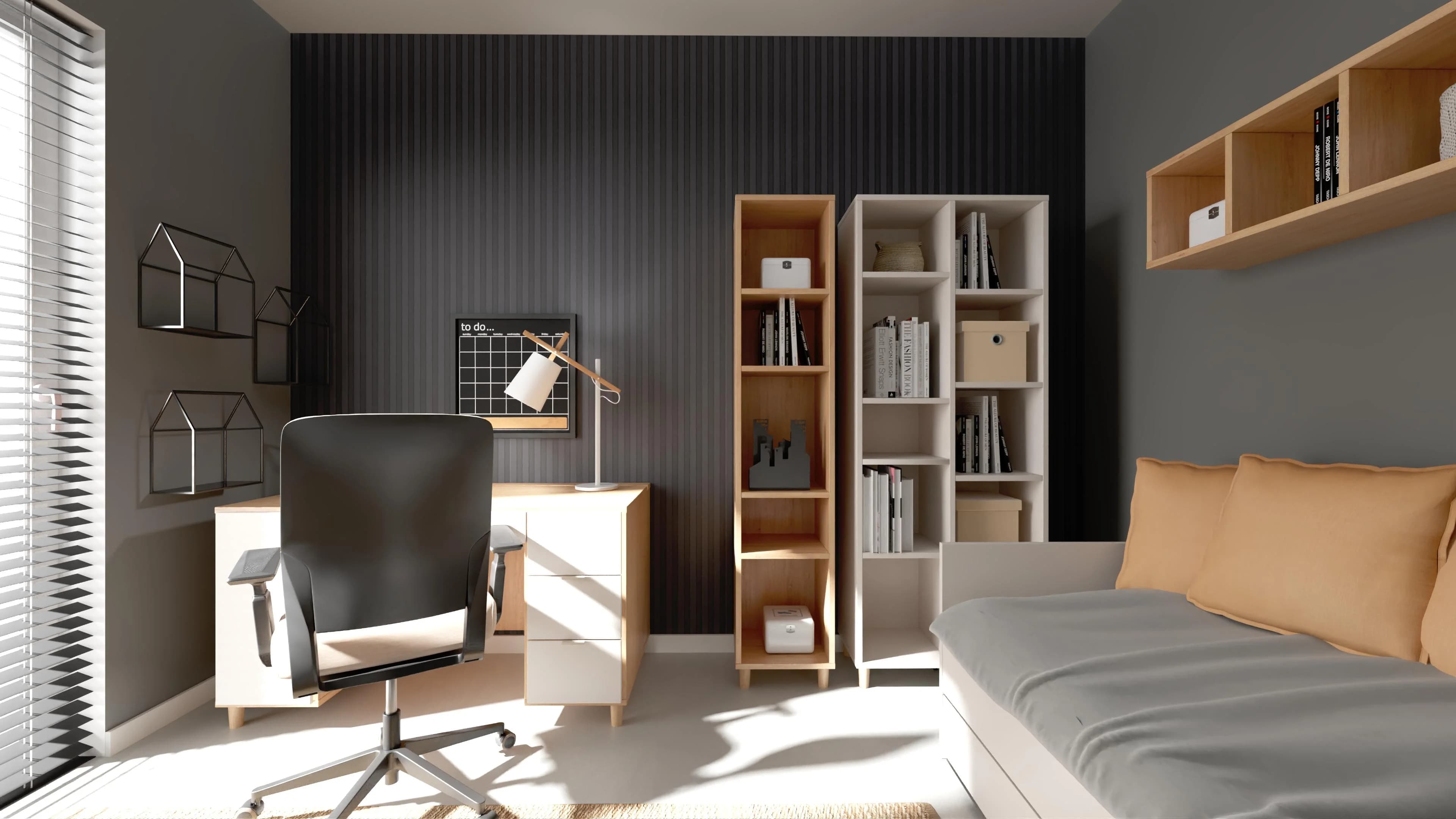 Wyrazista kolorystyka pokoju nastolatka sprawia, że ma swój charakter. Drewniane akcenty i duży dywan dobrze współgrają z różnymi odcieniami szarości i dbają o przytulną atmosferę. Łóżko z pakowną szufladą i regały sprzyjają organizacji, a przy biurku można w spokoju oddać się nauce. Wnętrze jest idealne dla młodego indywidualisty – wszystko ma tu swoje miejsce.