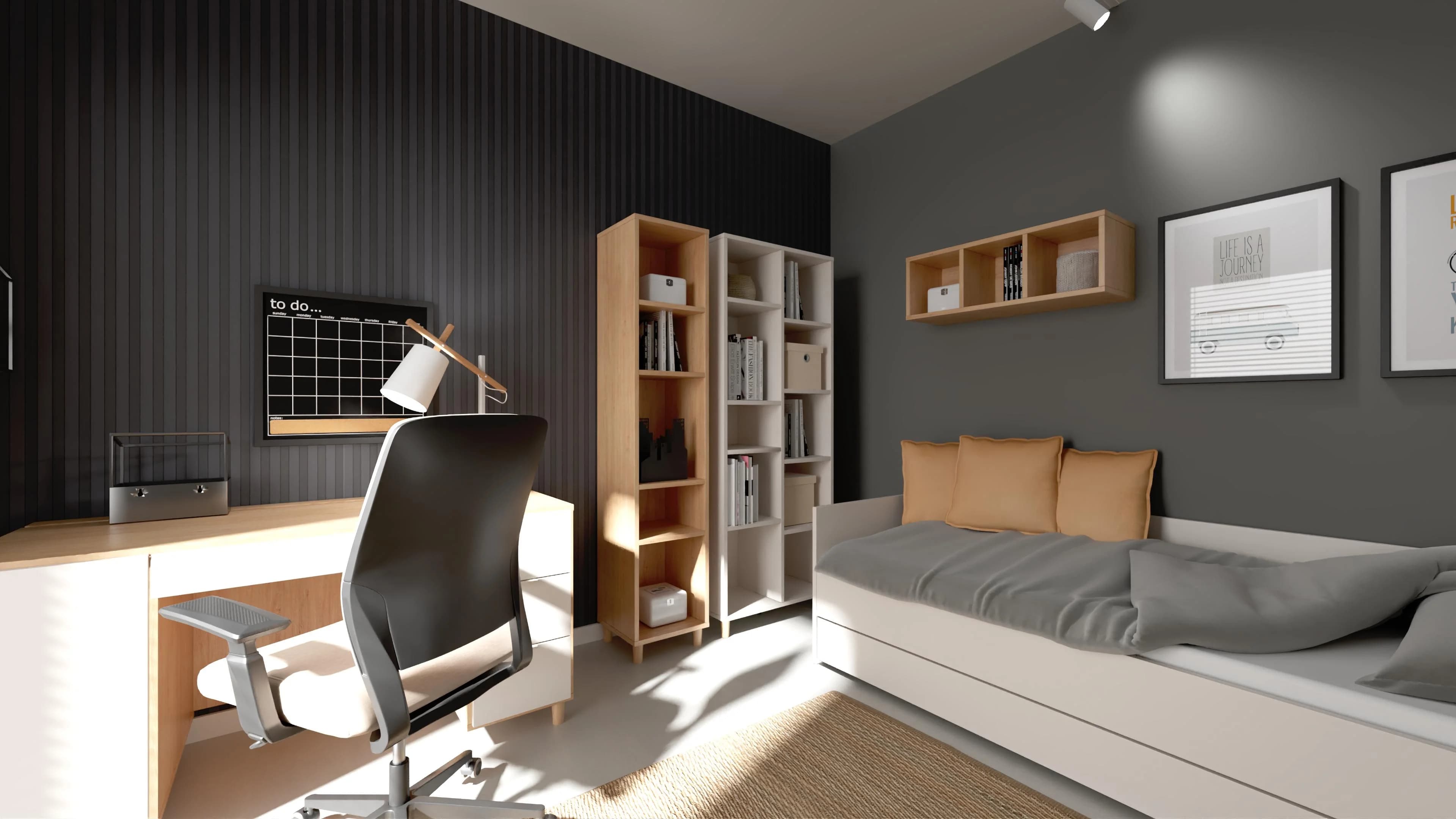 Młodzieżowy pokój z ciemnymi ścianami