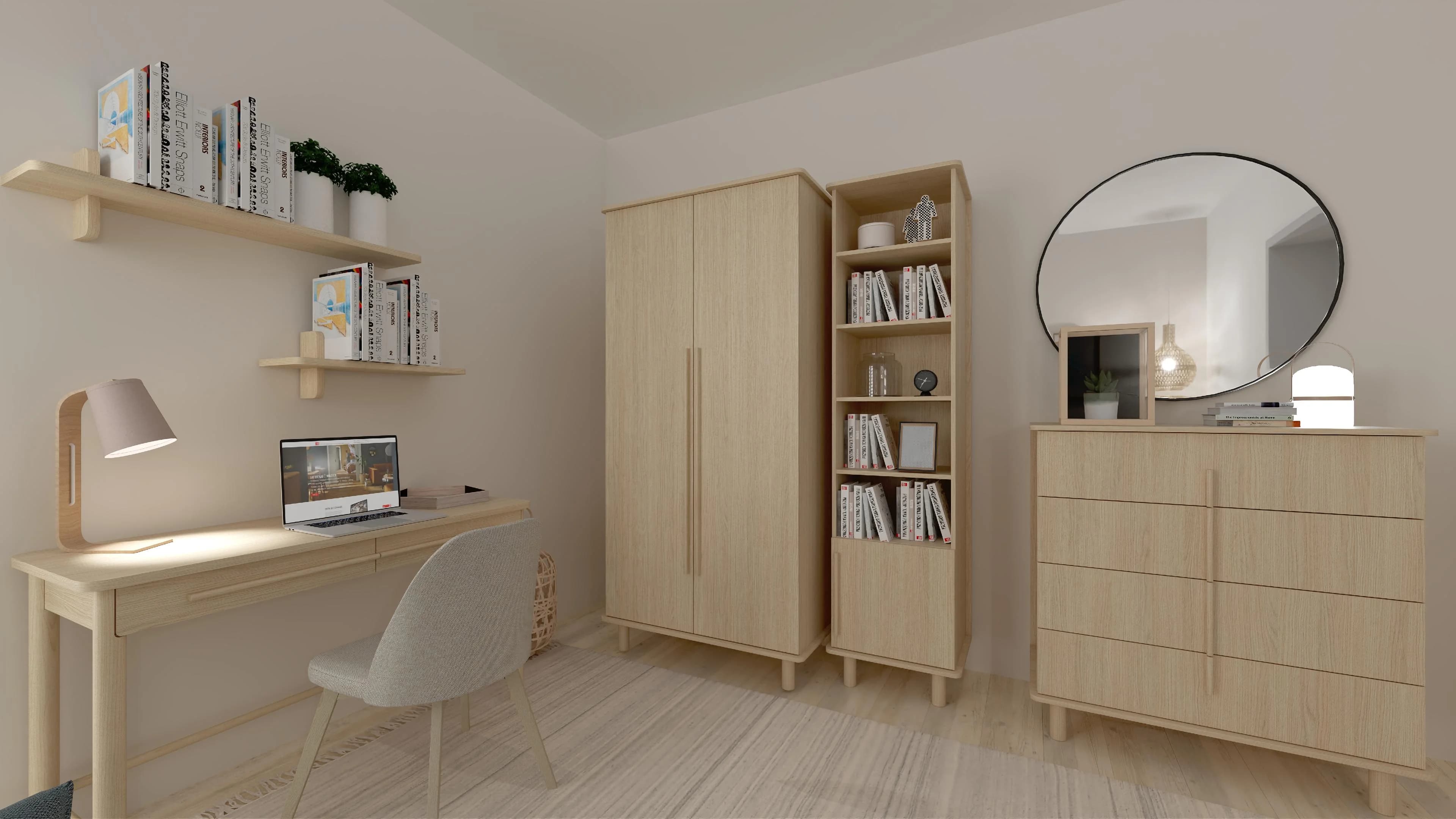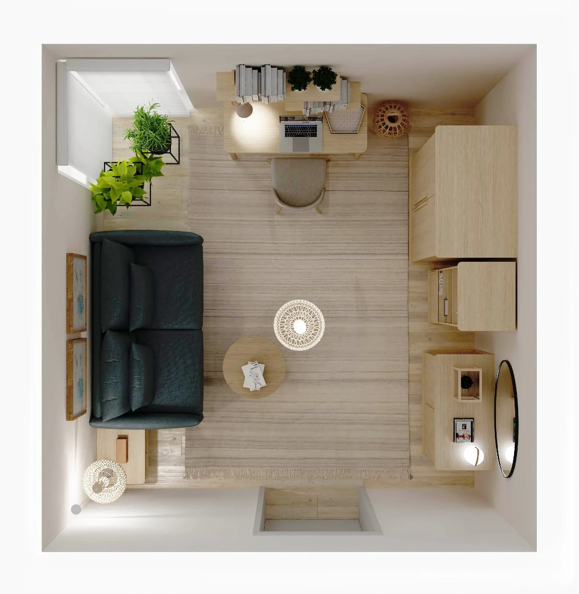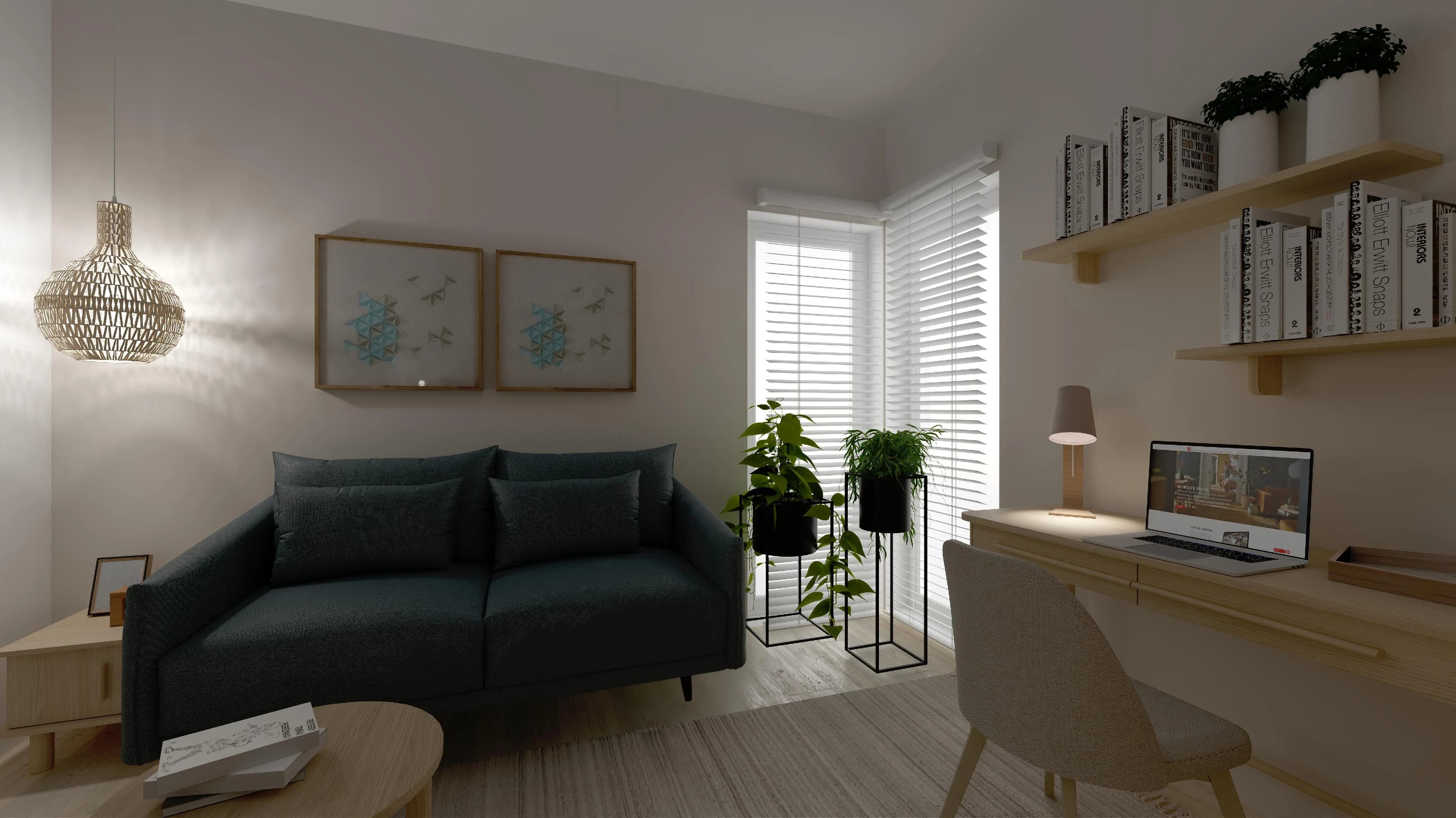 Ten przytulny salon może na co dzień pełnić wiele różnych ról. Strefa relaksu z sofą i praktyczną ławą to idealne miejsce na odpoczynek. Wygodne biurko pozwala na swobodną pracę i realizację własnych pasji, a pakowne meble oferują wiele miejsca do przechowywania. O klimat wnętrza dbają detale – wykonane z naturalnych materiałów lampy oraz zielone rośliny.