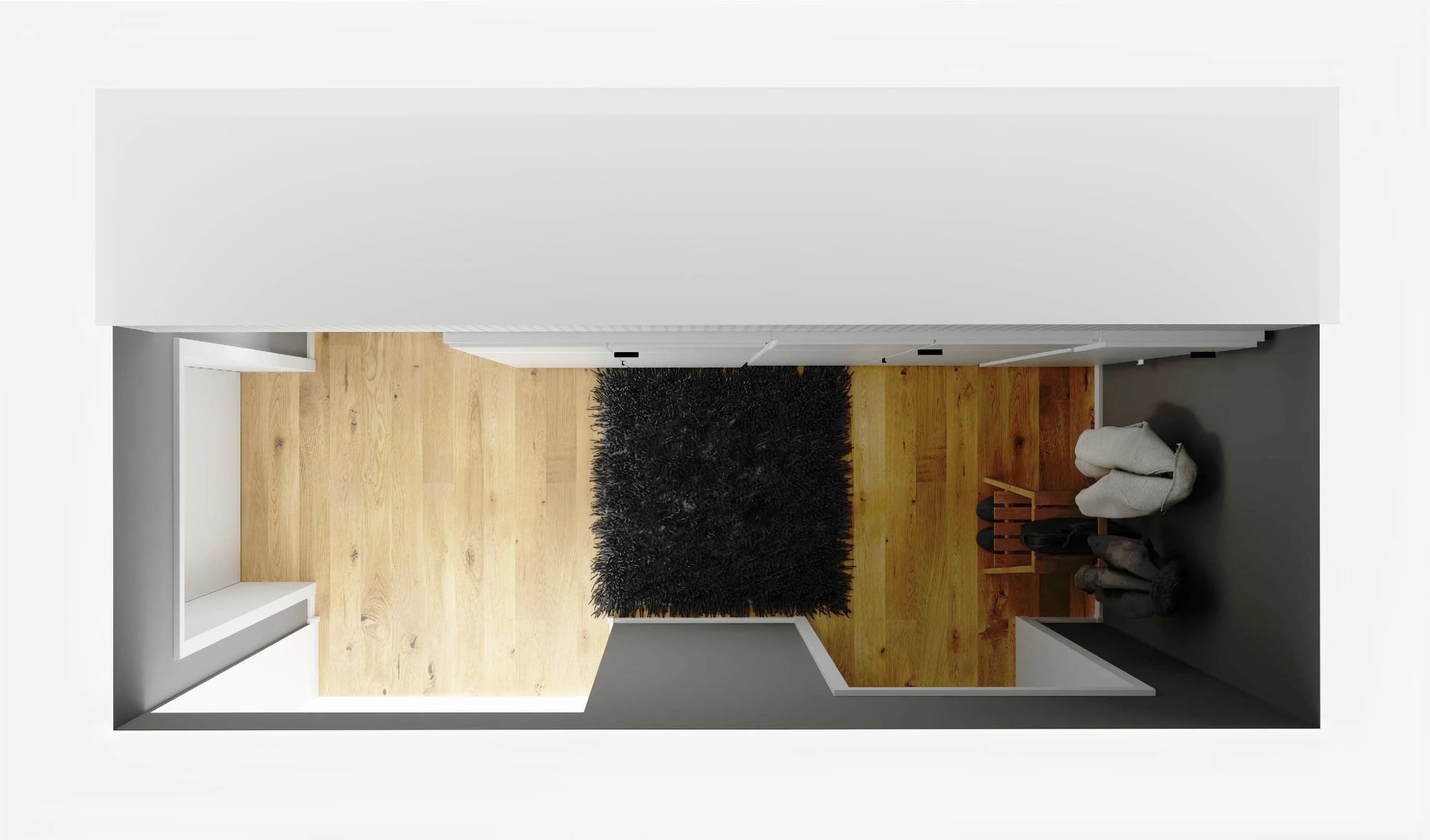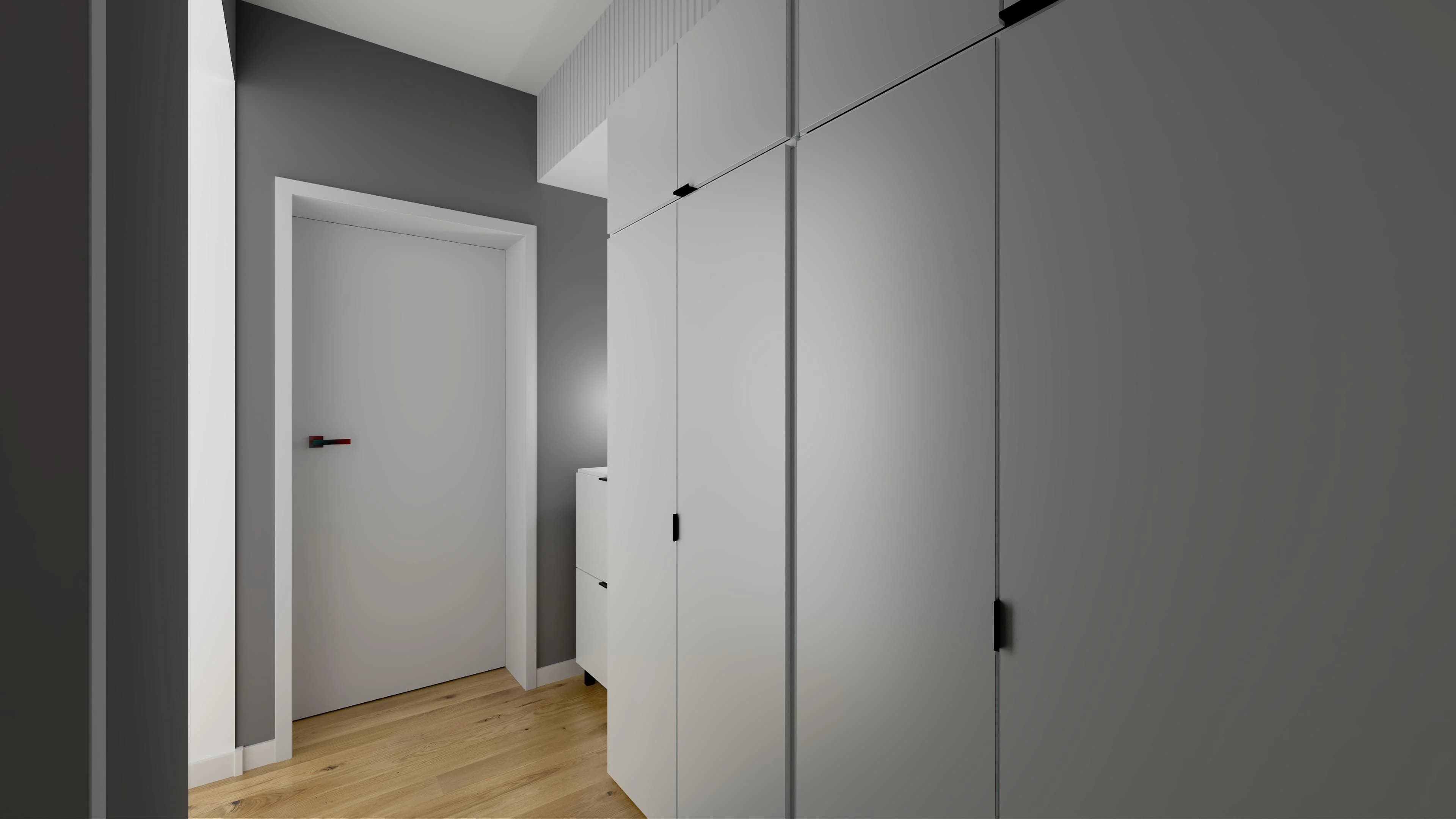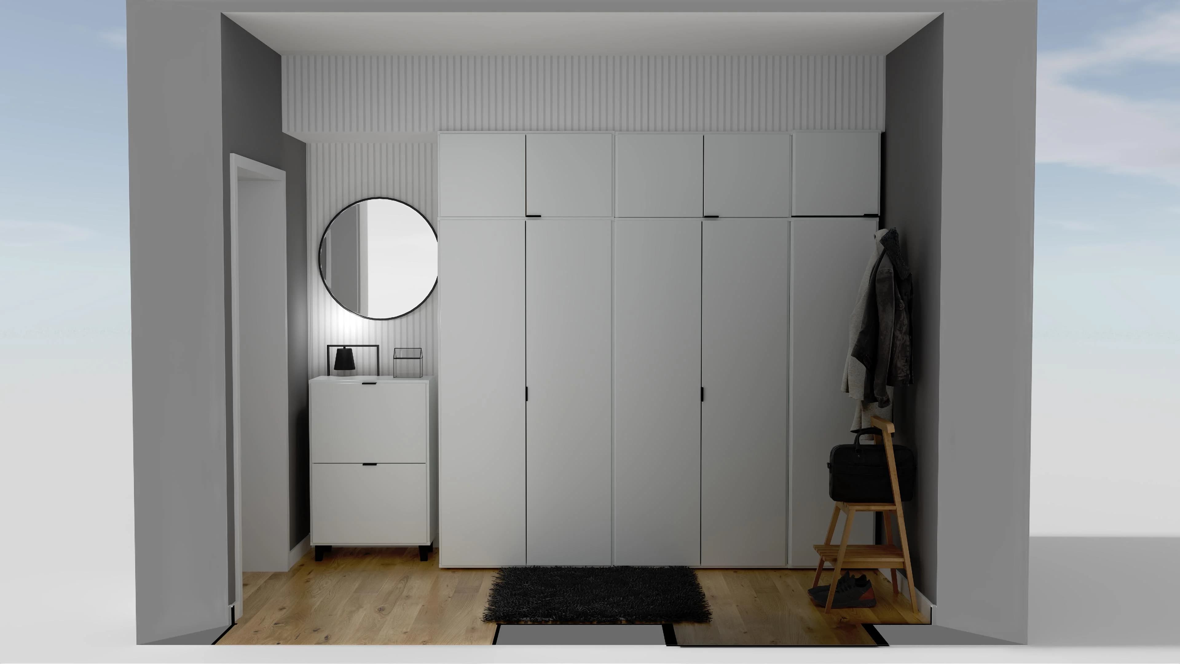 Ten przedpokój to dowód na to, że małe wnętrza też mogą być funkcjonalne. Utrzymaniu porządku sprzyjają pojemne meble oraz taboret, który sprawdzi się w roli stojaka lub siedziska. Niewielka przestrzeń zyskuje za sprawą jasnych kolorów i pionowych lameli na ścianie, które sprawiają, że hol wydaje się wyższy. Dzięki podłodze w odcieniu drewna jest tu przytulnie.
