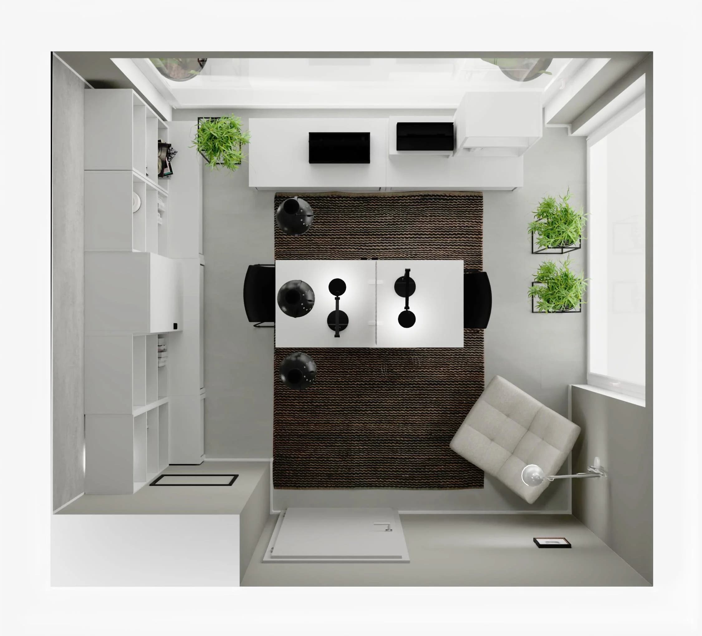 W tym nowoczesnym gabinecie biel gra pierwsze skrzypce, a czerń dodaje charakteru. Dzięki regałom przestrzeń jest uporządkowana i lekka, co sprzyja skupieniu. Czarny dywan, fotele i designerskie oświetlenie podkreślają kontrastowy charakter aranżacji, a obrotowy fotel wypoczynkowy staje się wygodnym miejscem dla gości. Żywe rośliny wprowadzają do wnętrza świeżość i naturalną energię.