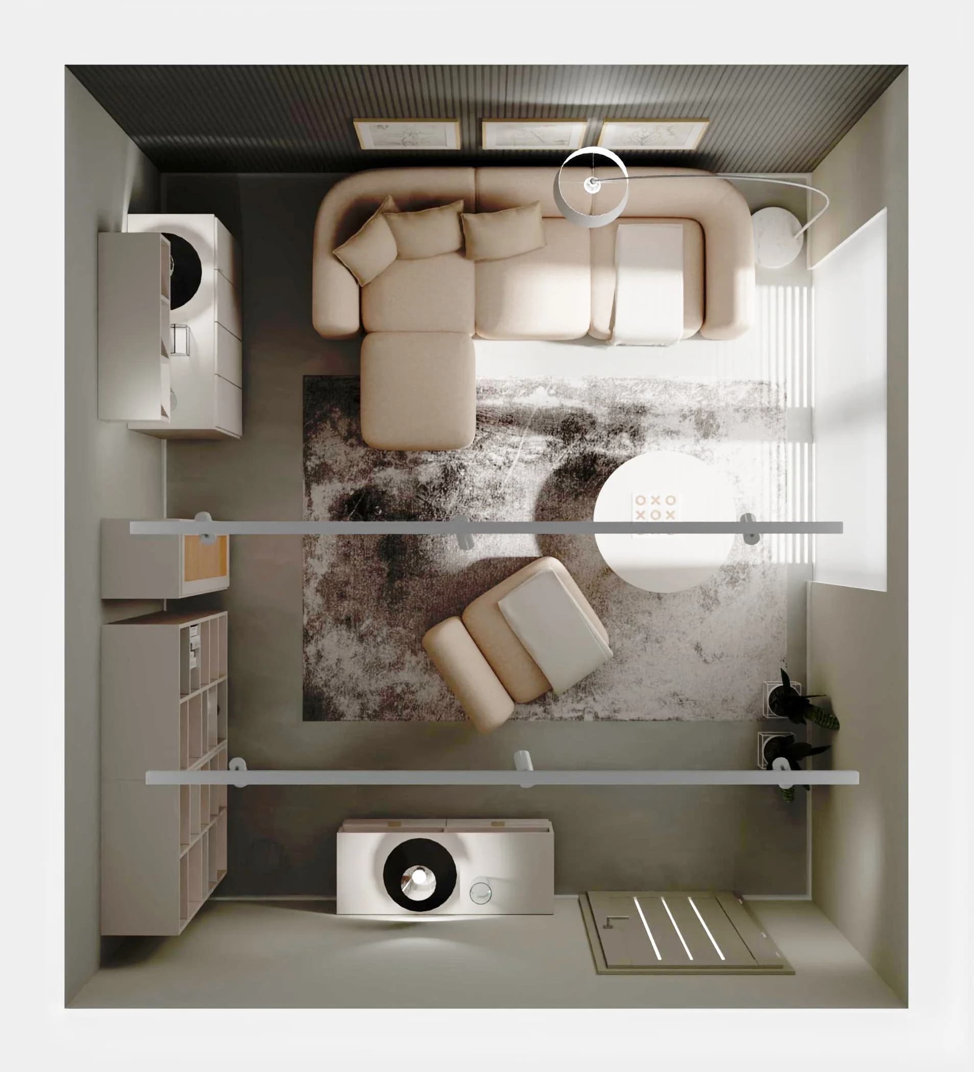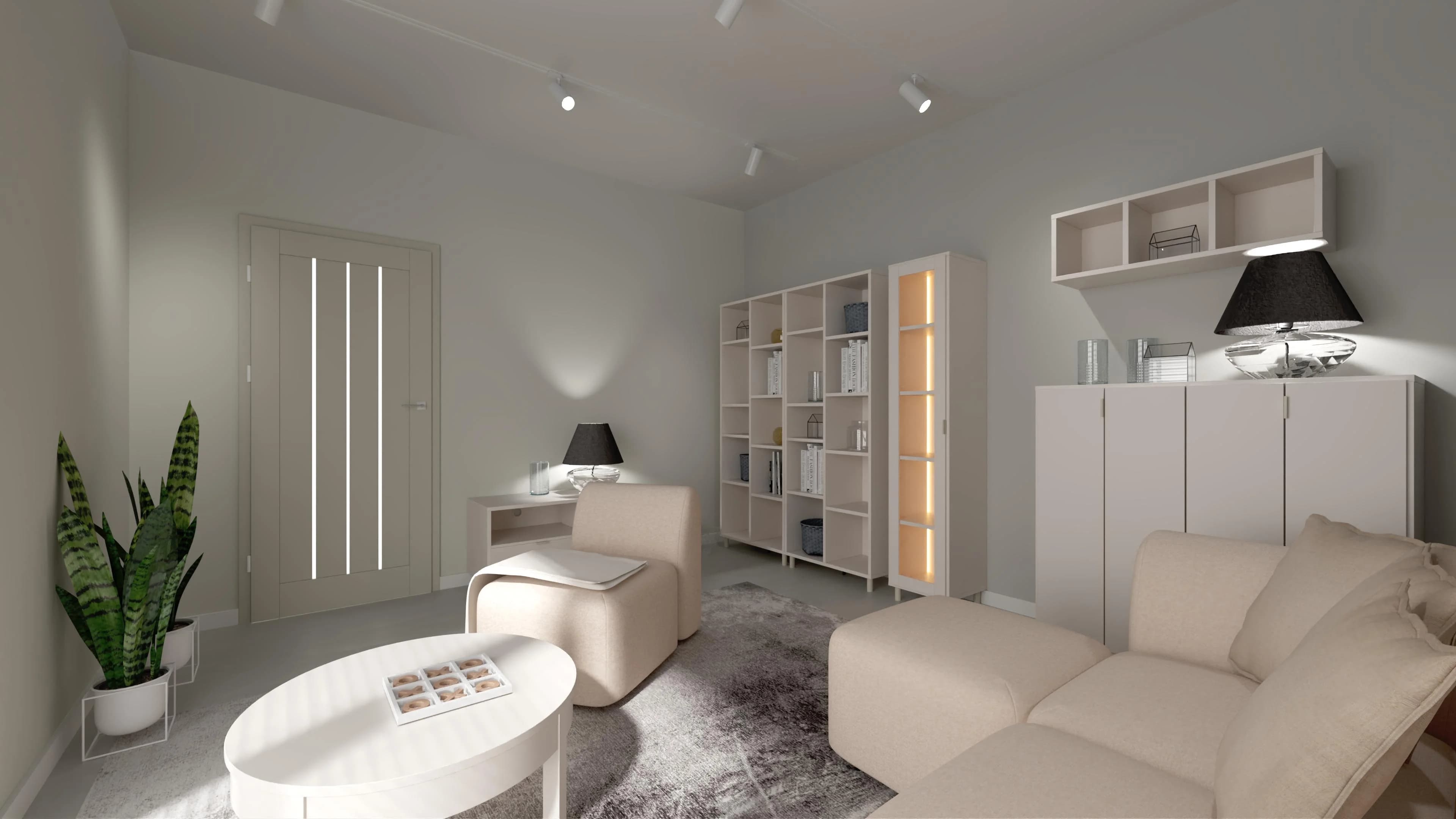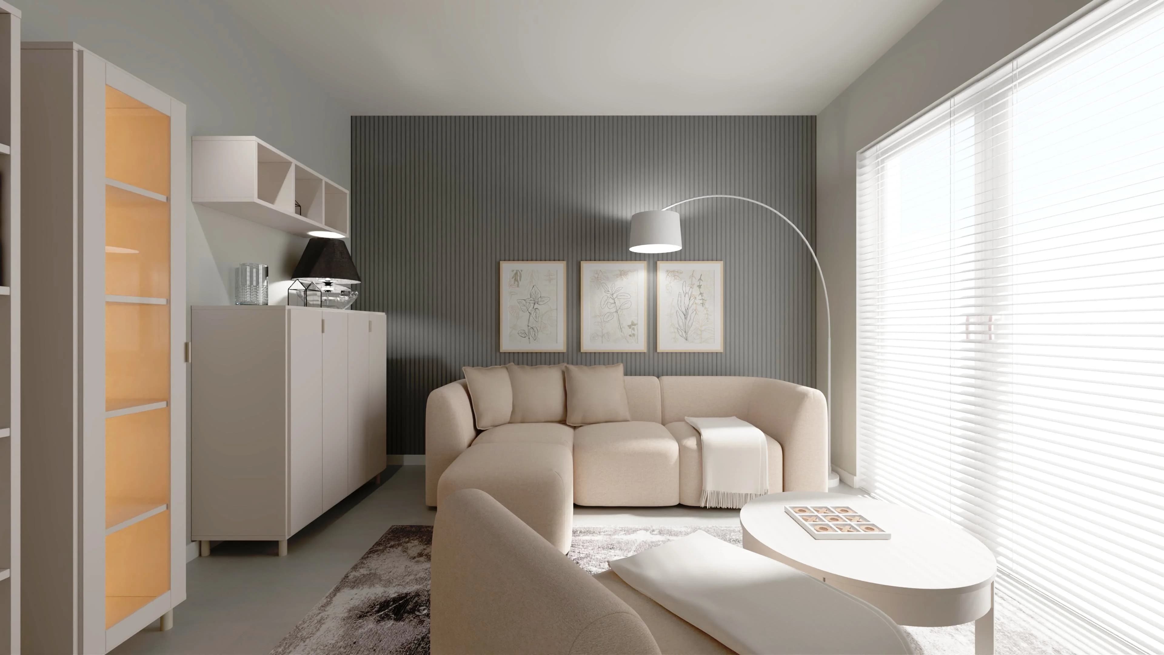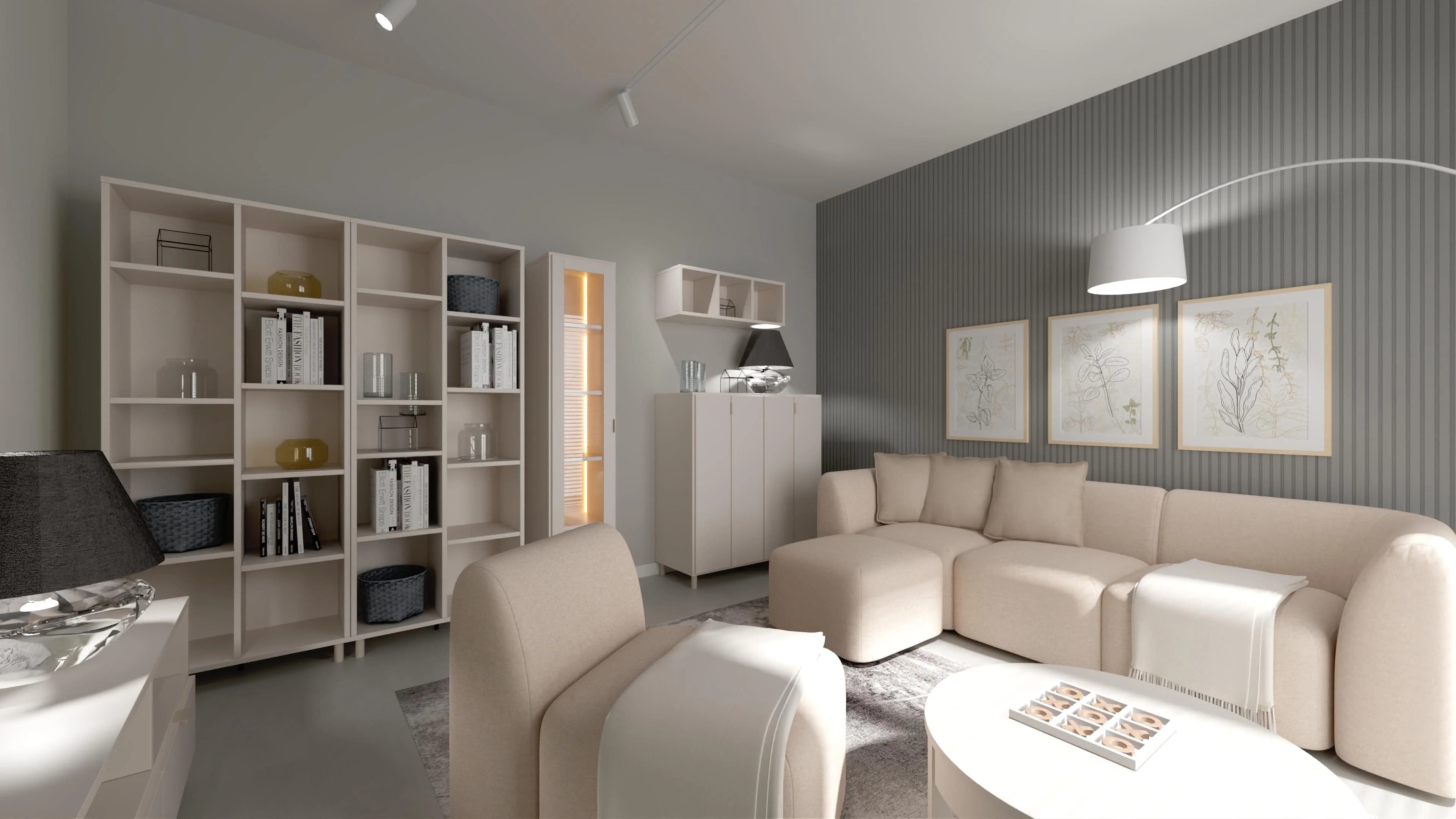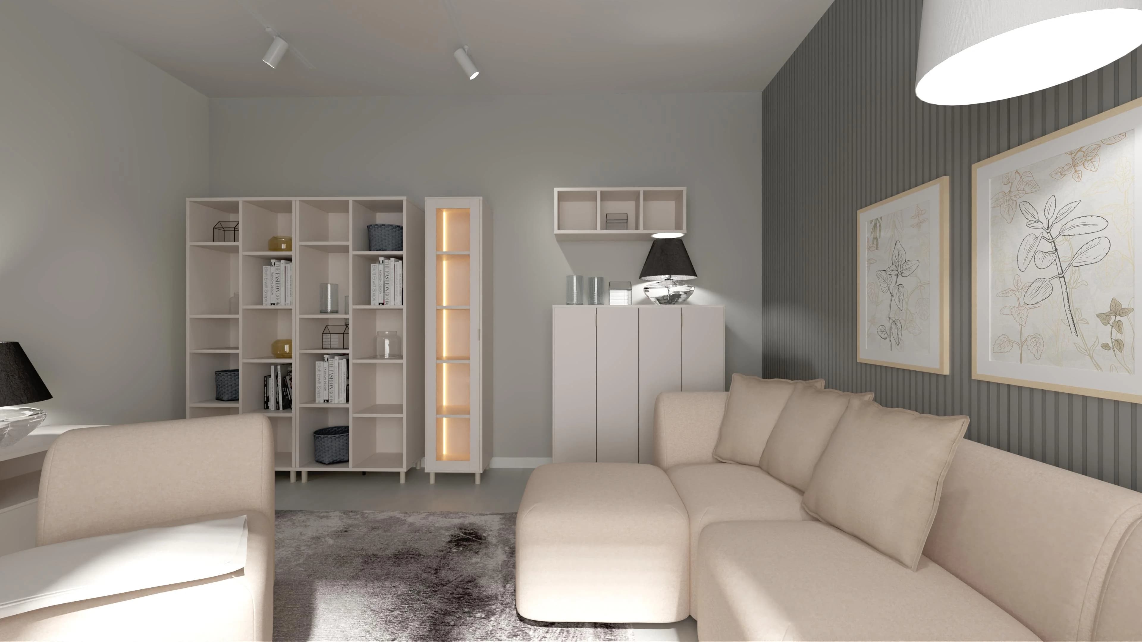 Przytulny wystrój w kojących jasnych kolorach sprawia, że ten salon to oaza relaksu. Na dużym narożniku można wygodnie się odprężyć lub spotkać ze znajomymi. Towarzyszy mu stolik kawowy oraz duży dywan, który przyjemnie otula stopy. Nastrojową aurę po zmroku gwarantują różne lampy i podświetlane witryny. Funkcjonalność wnętrza zapewniają pakowne meble.