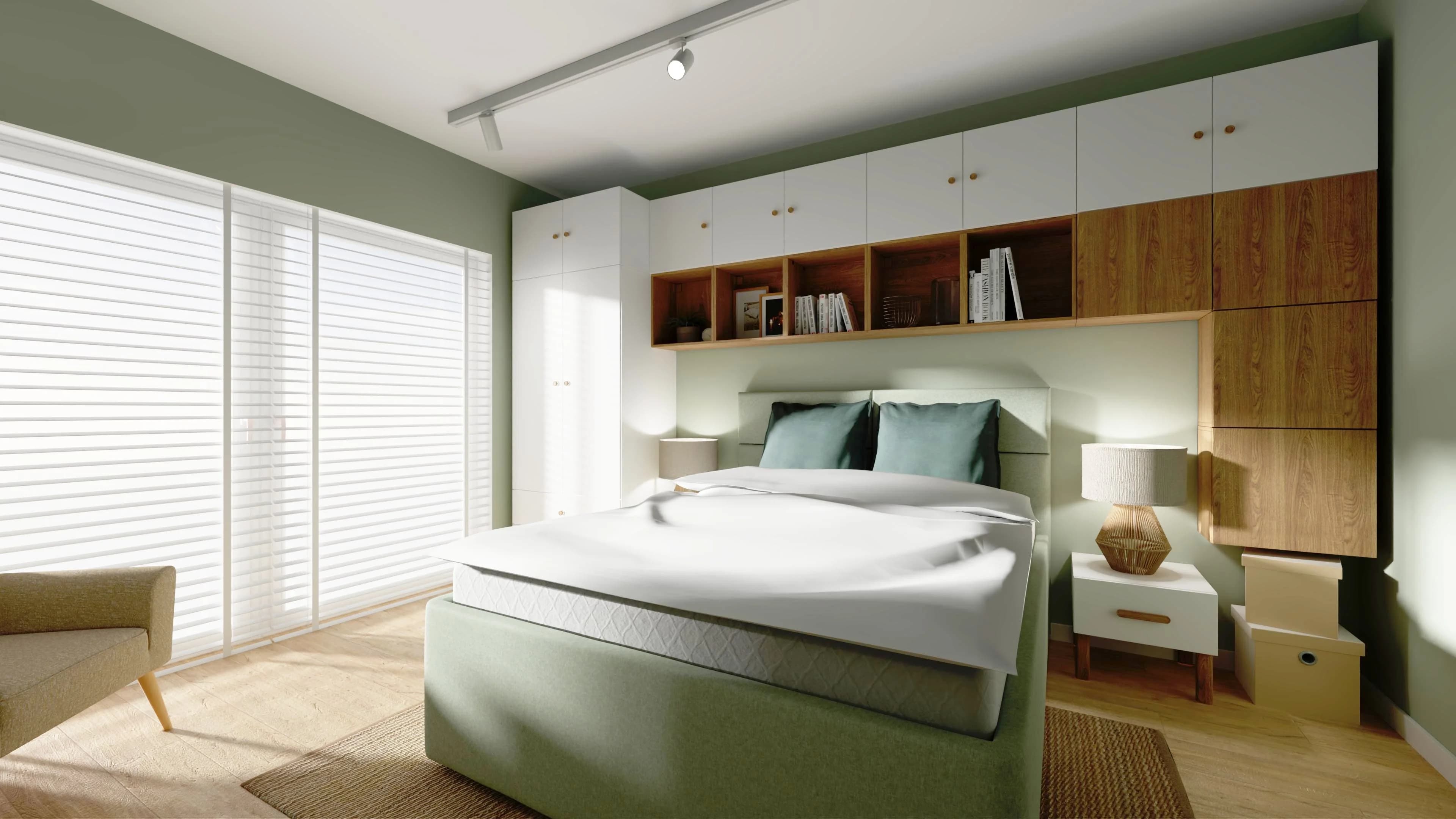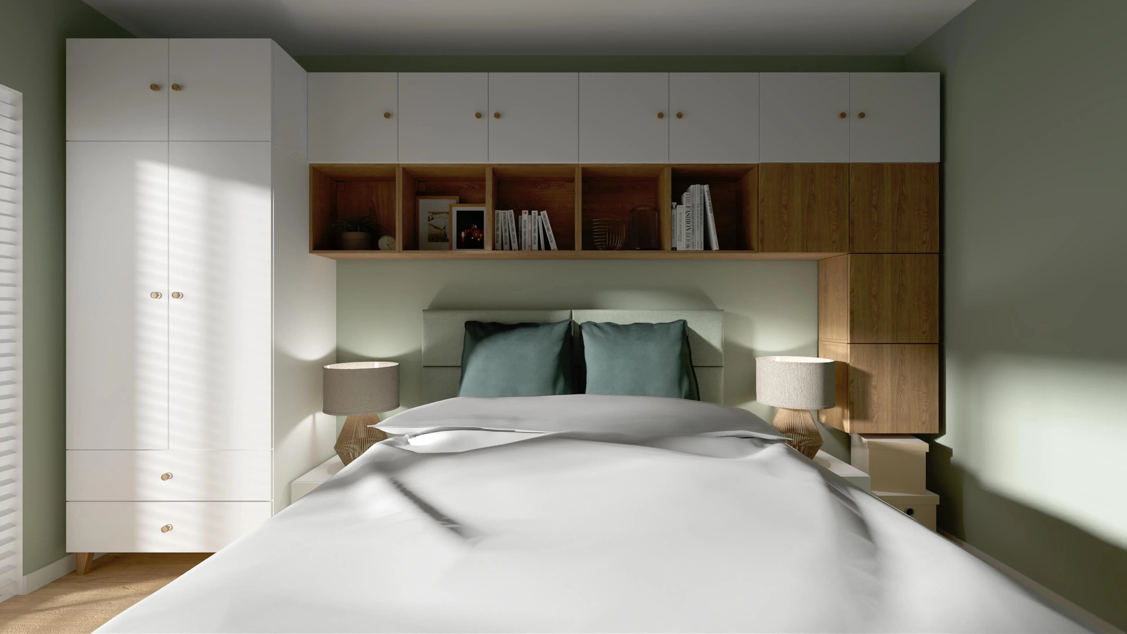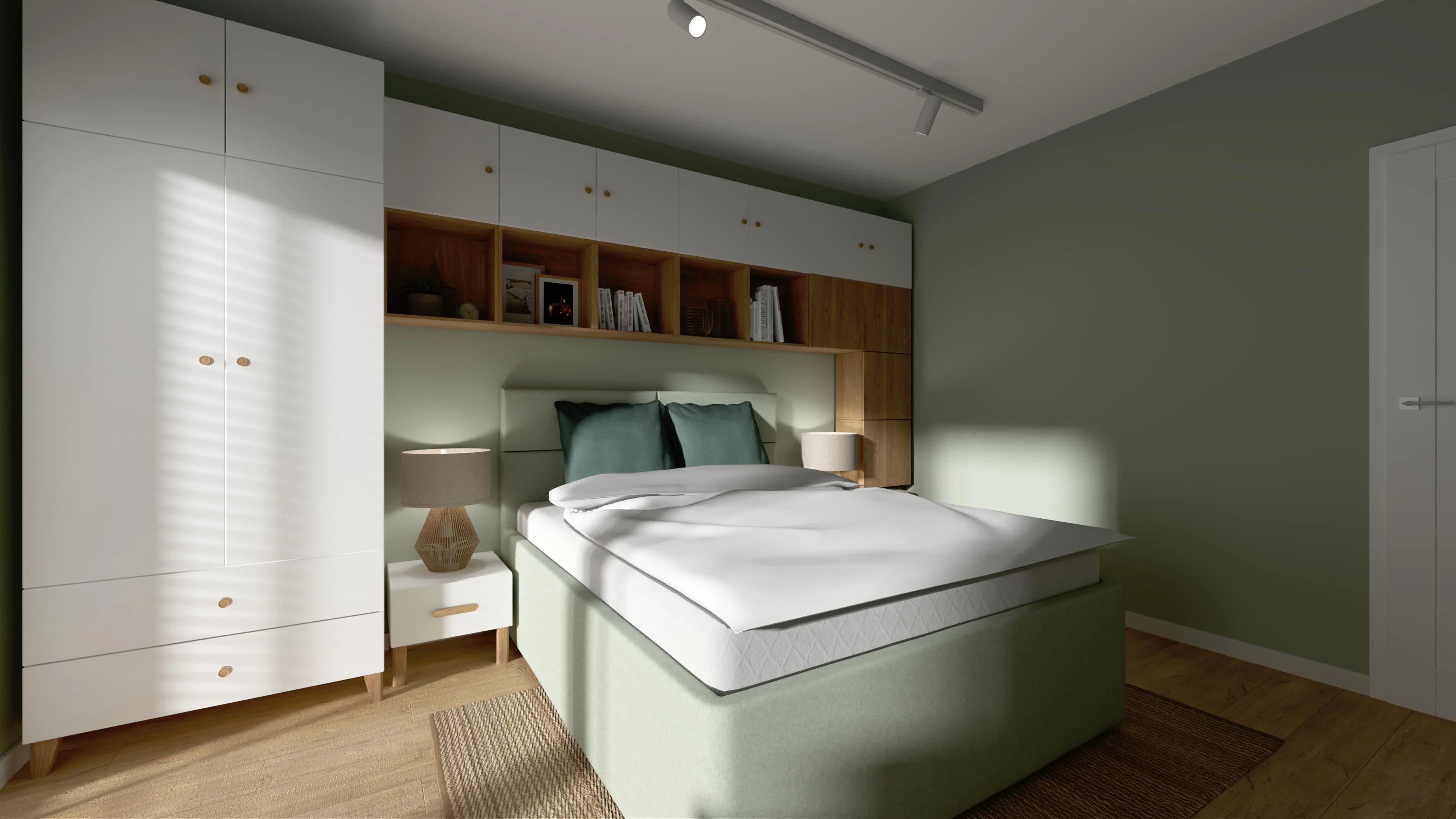 W centrum tej sypialni stoi łóżko dla dwojga obite miętową tkaniną, która płynnie współgra z miętowym kolorem ścian. Dzięki wysokiemu zagłówkowi można na nim wygodnie poczytać. Przemyślana zabudowa z białych mebli otacza łóżko, tworząc półki i schowki, które pozwalają w pełni wykorzystać przestrzeń. Całość ociepla naturalny kolor drewna na podłodze i w wybranych szafkach.