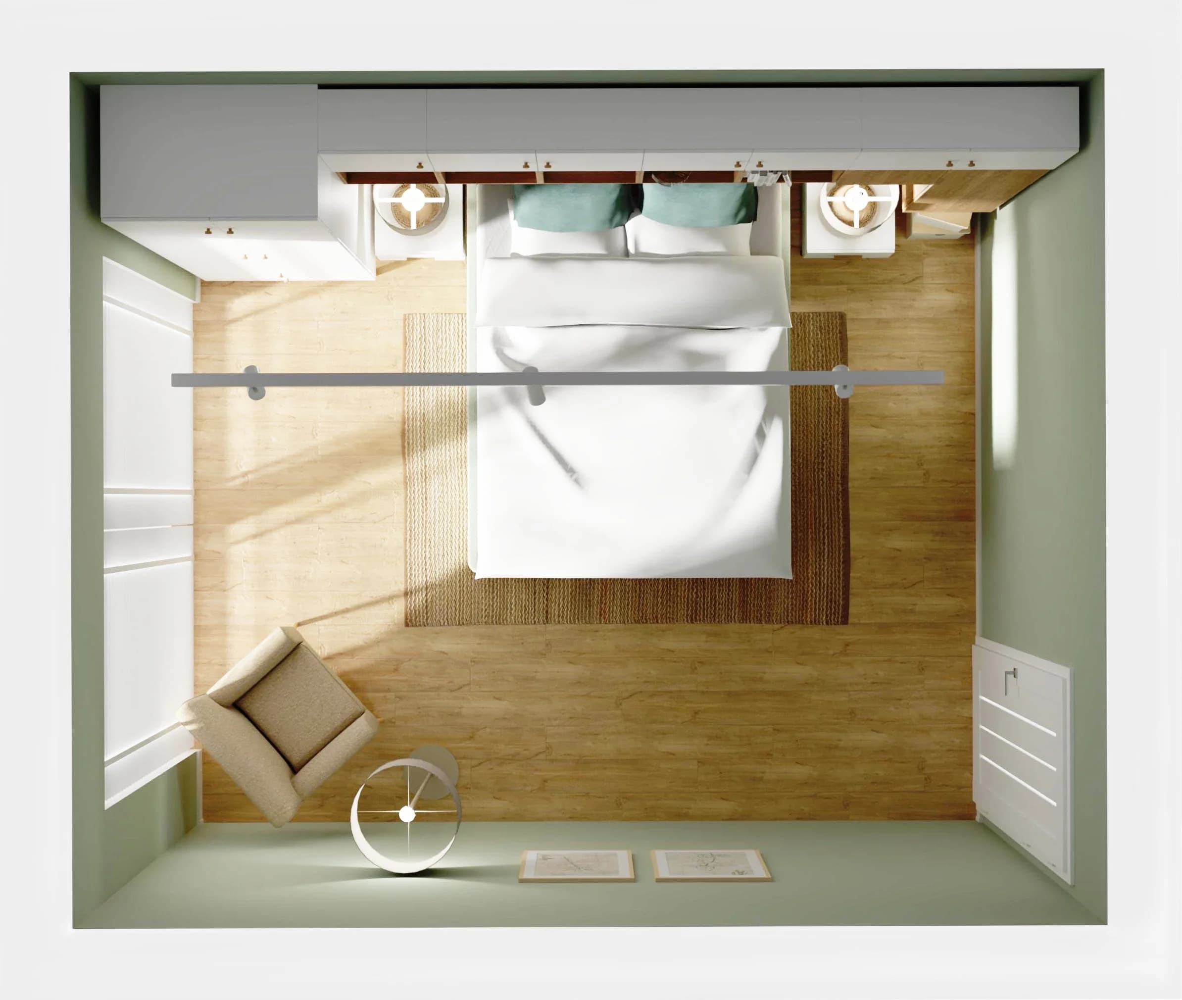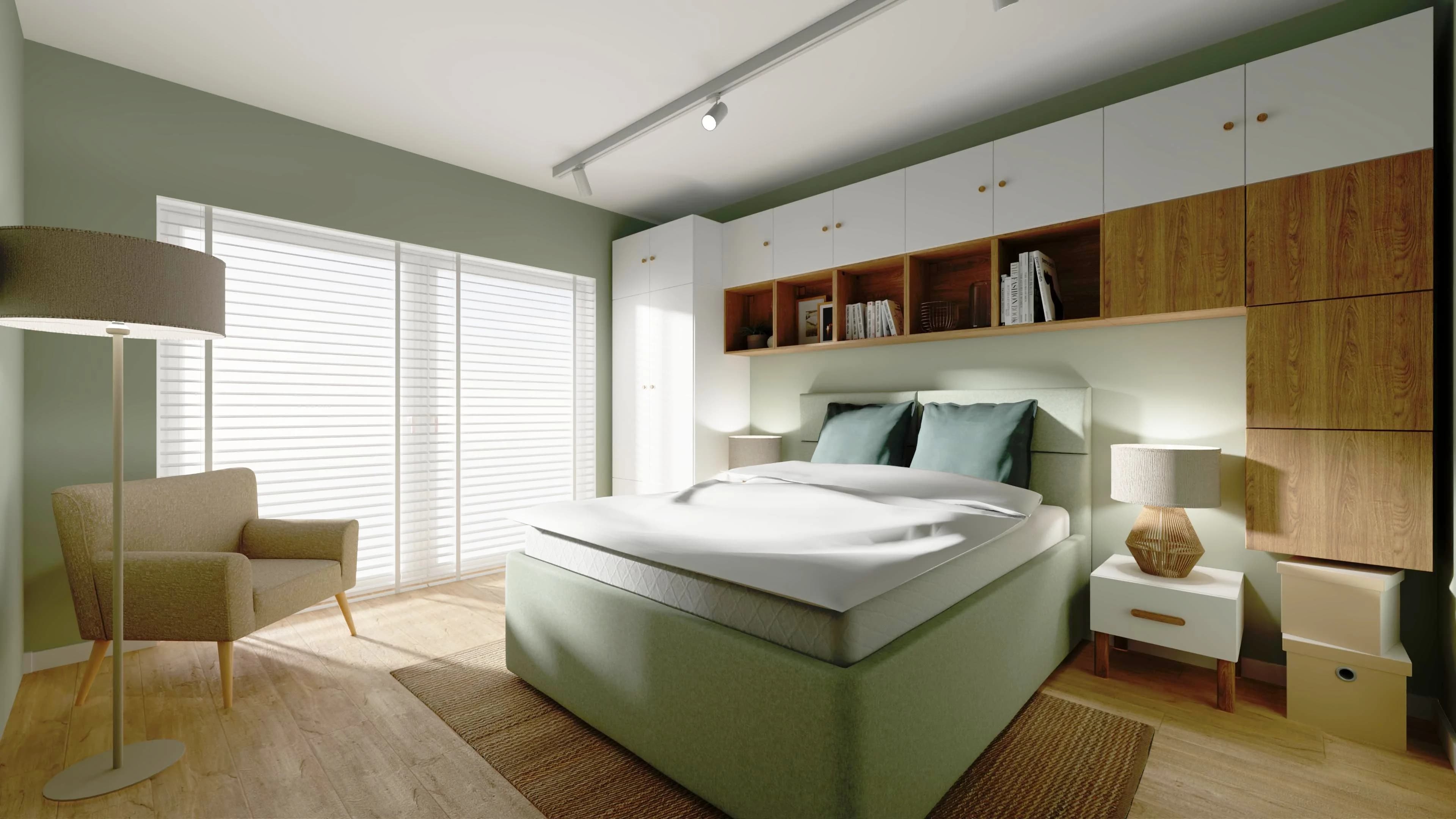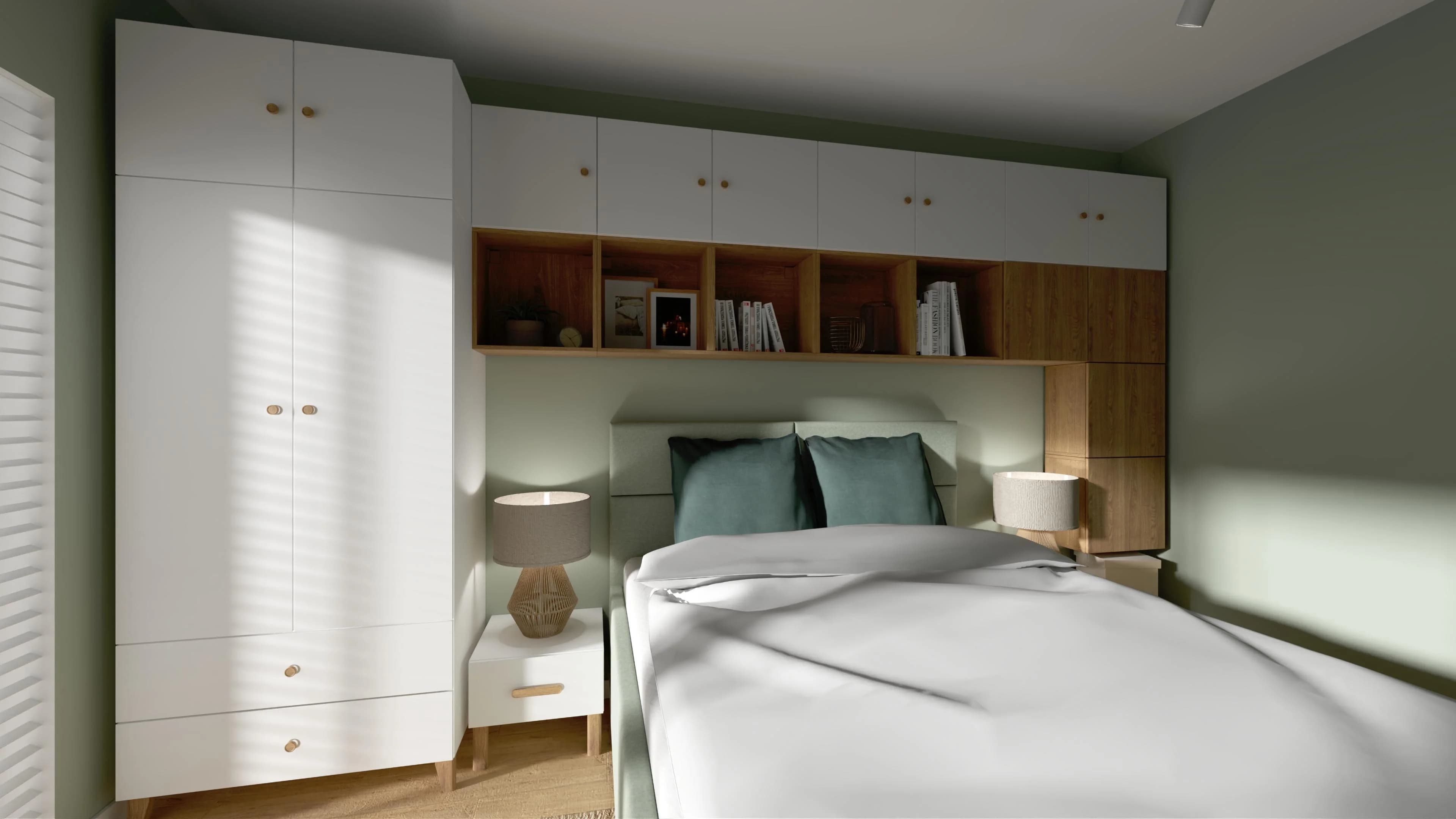 W centrum tej sypialni stoi łóżko dla dwojga obite miętową tkaniną, która płynnie współgra z miętowym kolorem ścian. Dzięki wysokiemu zagłówkowi można na nim wygodnie poczytać. Przemyślana zabudowa z białych mebli otacza łóżko, tworząc półki i schowki, które pozwalają w pełni wykorzystać przestrzeń. Całość ociepla naturalny kolor drewna na podłodze i w wybranych szafkach.