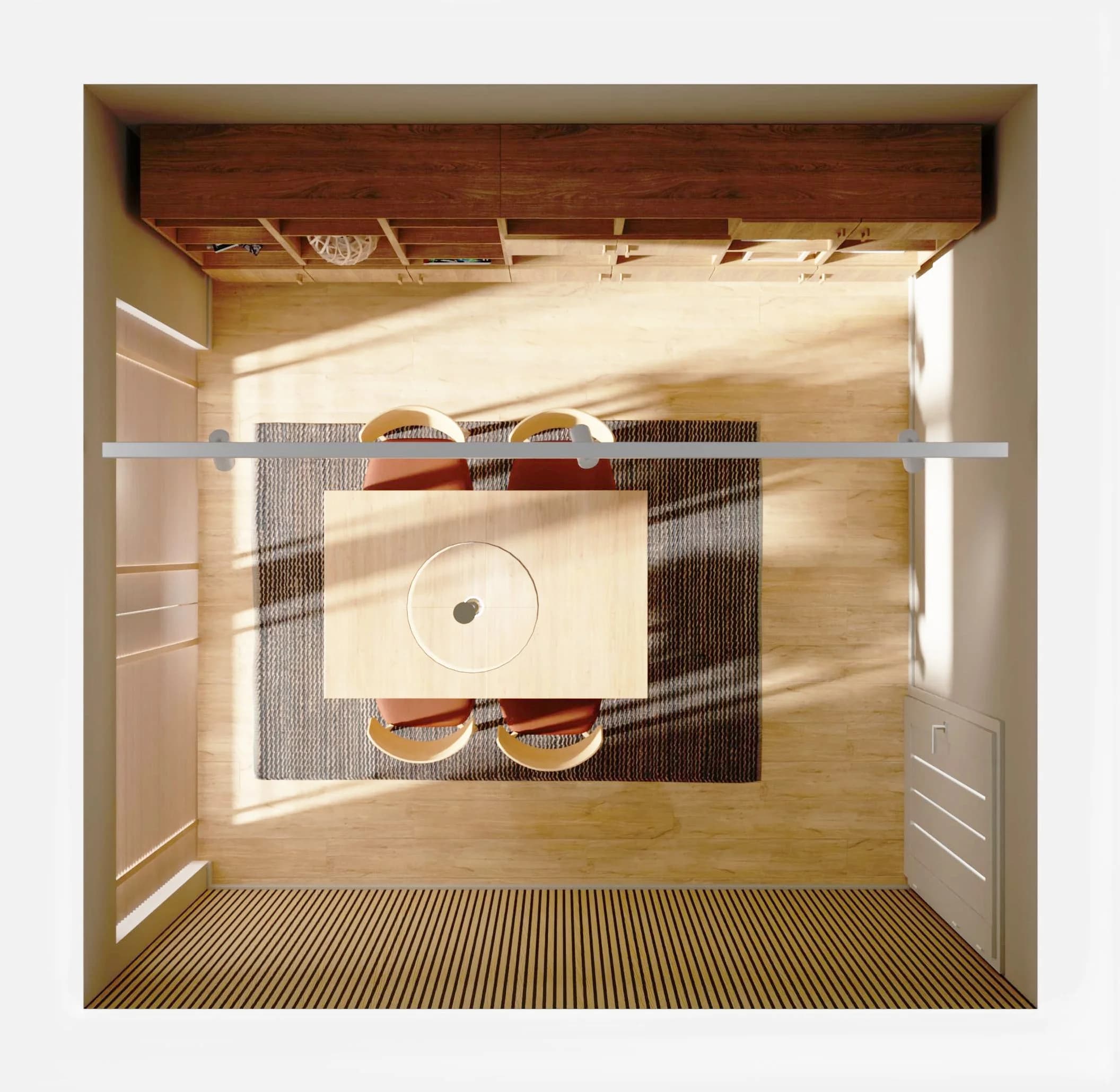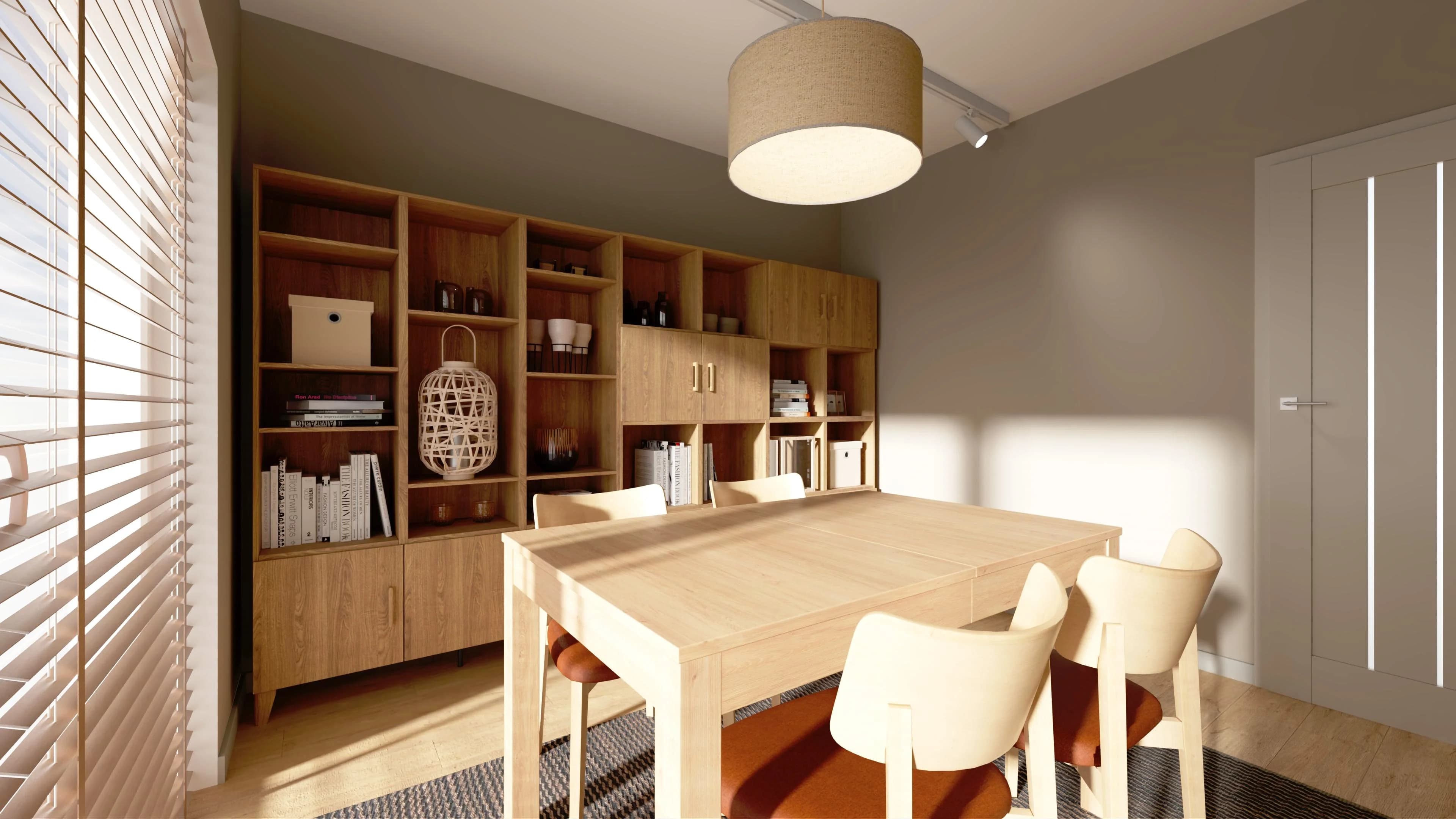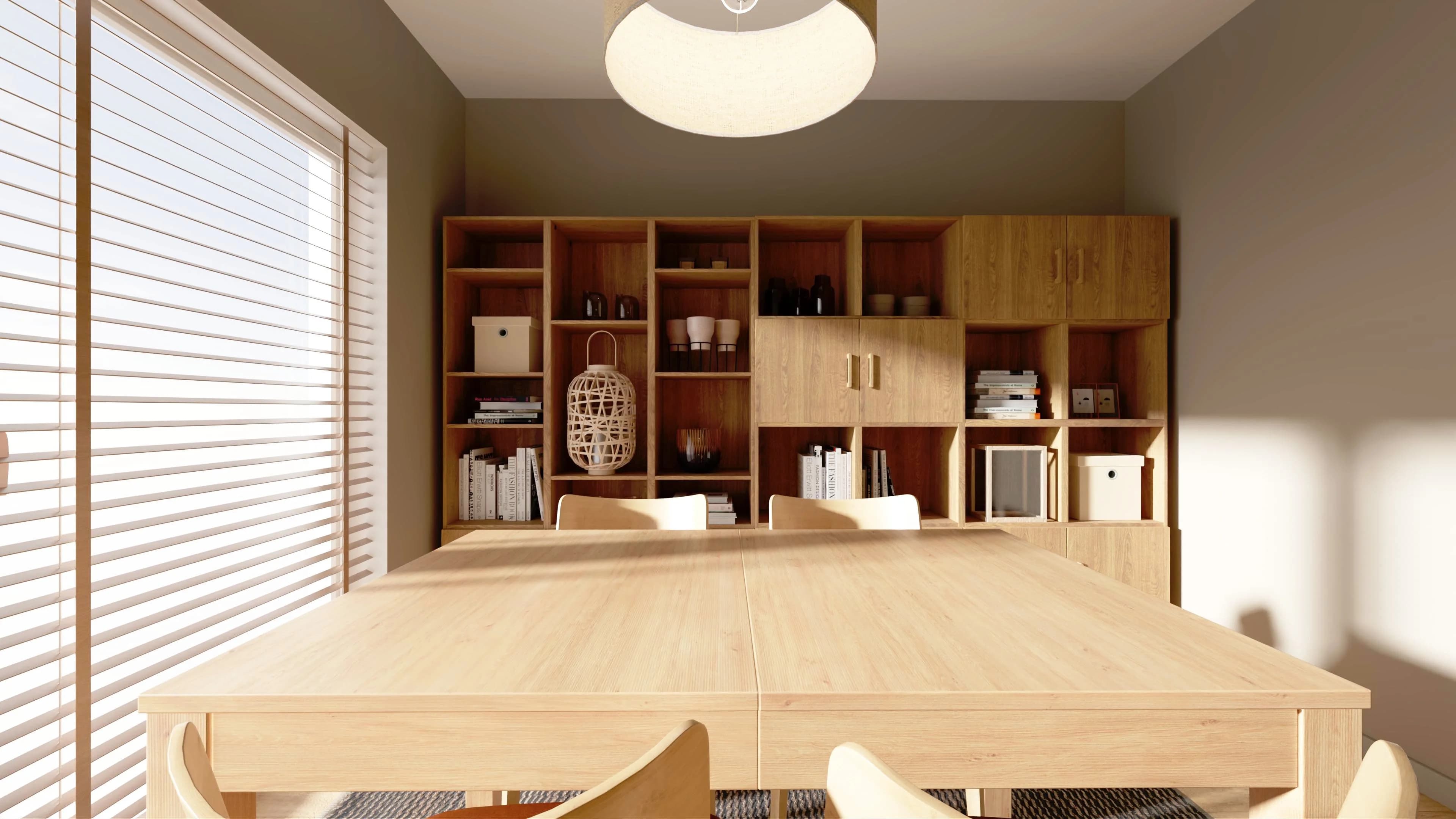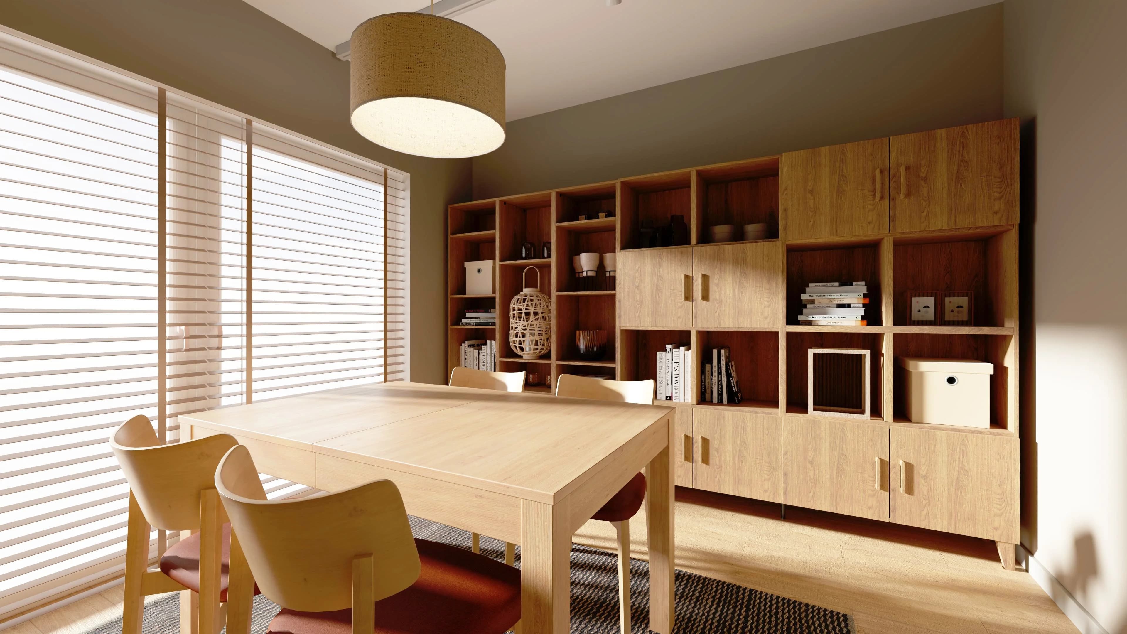Minimalistyczna jadalnia emanuje spokojem i sprzyja wspólnym chwilom. Centralny, drewniany stół harmonijnie współgra z zabudową ściany z regałów, tworząc uporządkowaną kompozycję. Ciepło wnętrza podkreślają miękkie światło i duży dywan, a starannie dobrane dekoracje na półkach, jak książki, rośliny i drobne akcenty, nadają przestrzeni bardziej osobisty charakter.