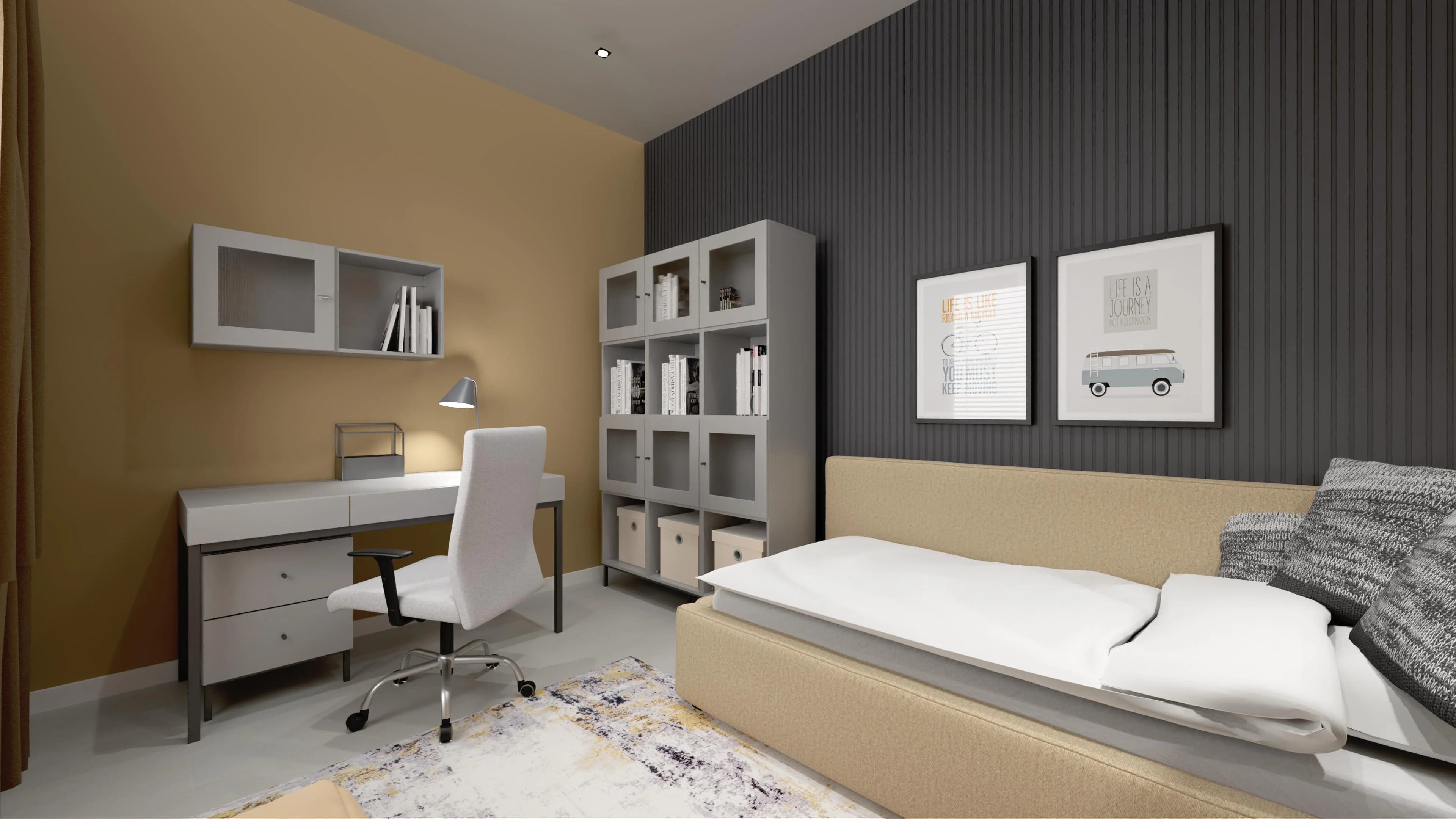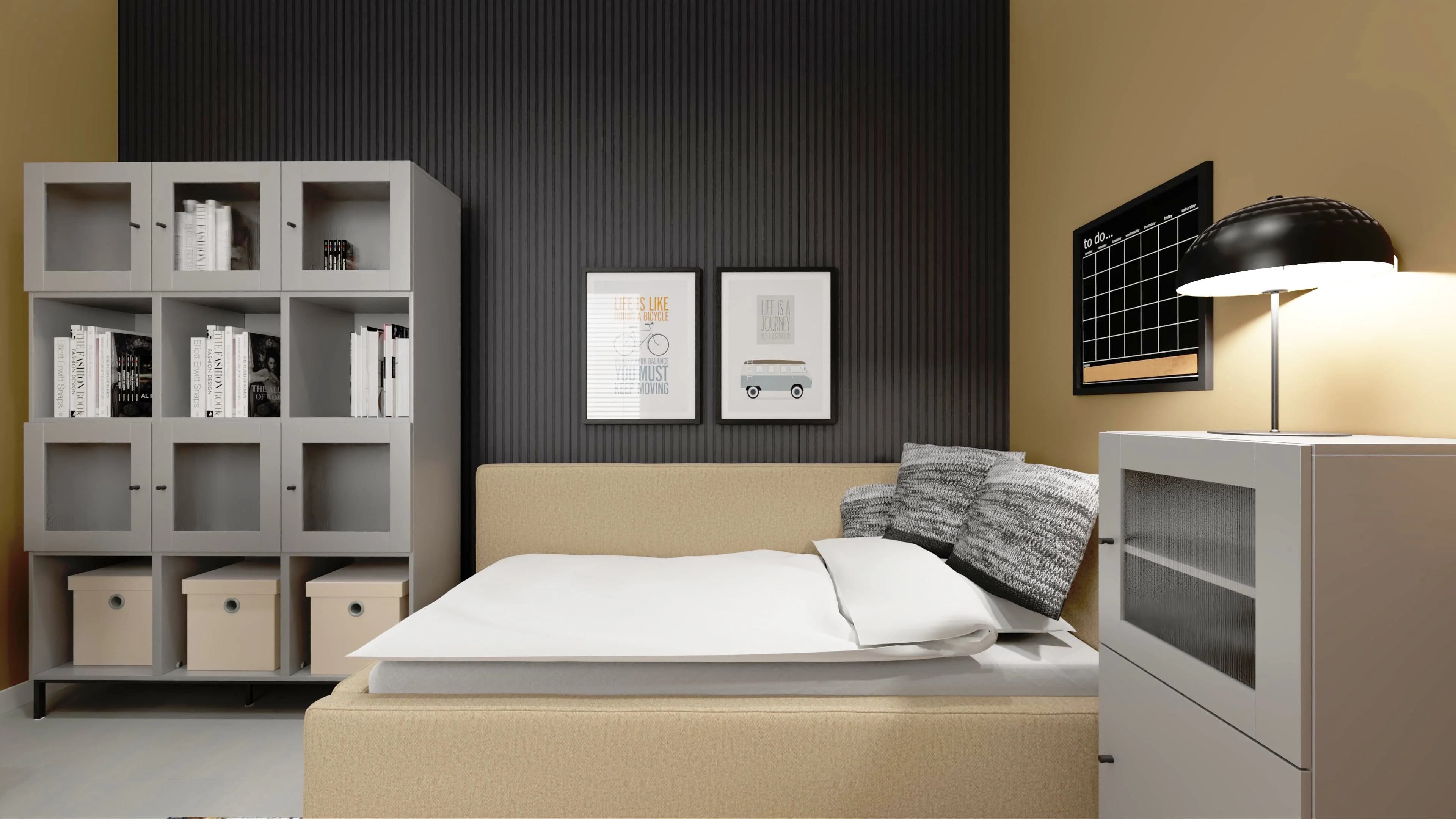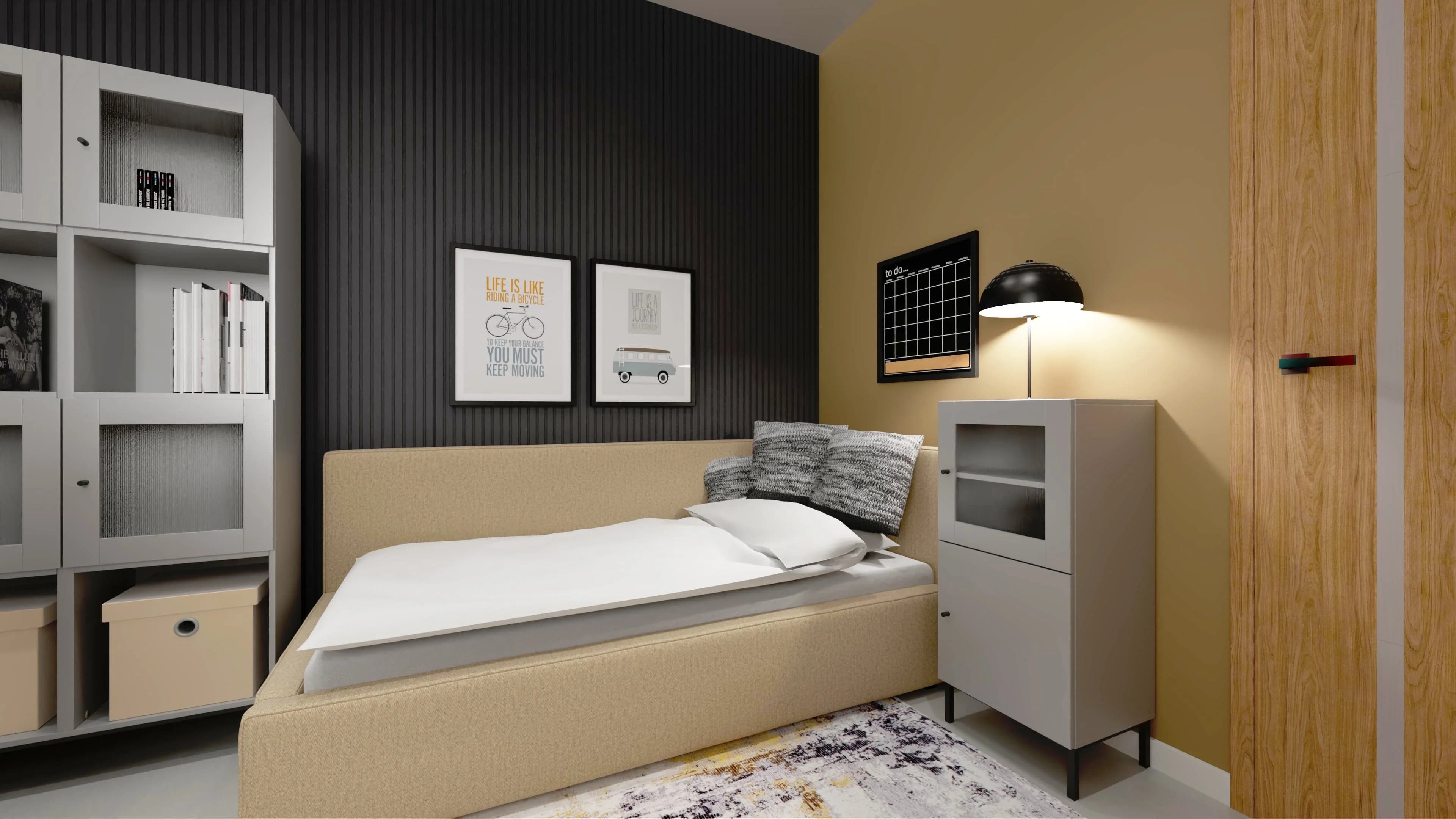 Pokój młodzieżowy, choć niewielki, zaskakuje funkcjonalnością. Wtulone w róg narożne łóżko zaprasza do snu, a dzięki wygodnemu oparciu jest też miejscem spotkań z przyjaciółmi. Przestronny regał pomaga w organizacji wnętrza, dobrze komponując się z biurkiem obok. Komfortowej nauce sprzyja obrotowy fotel. O przytulność dbają duży dywan i ściana lameli.