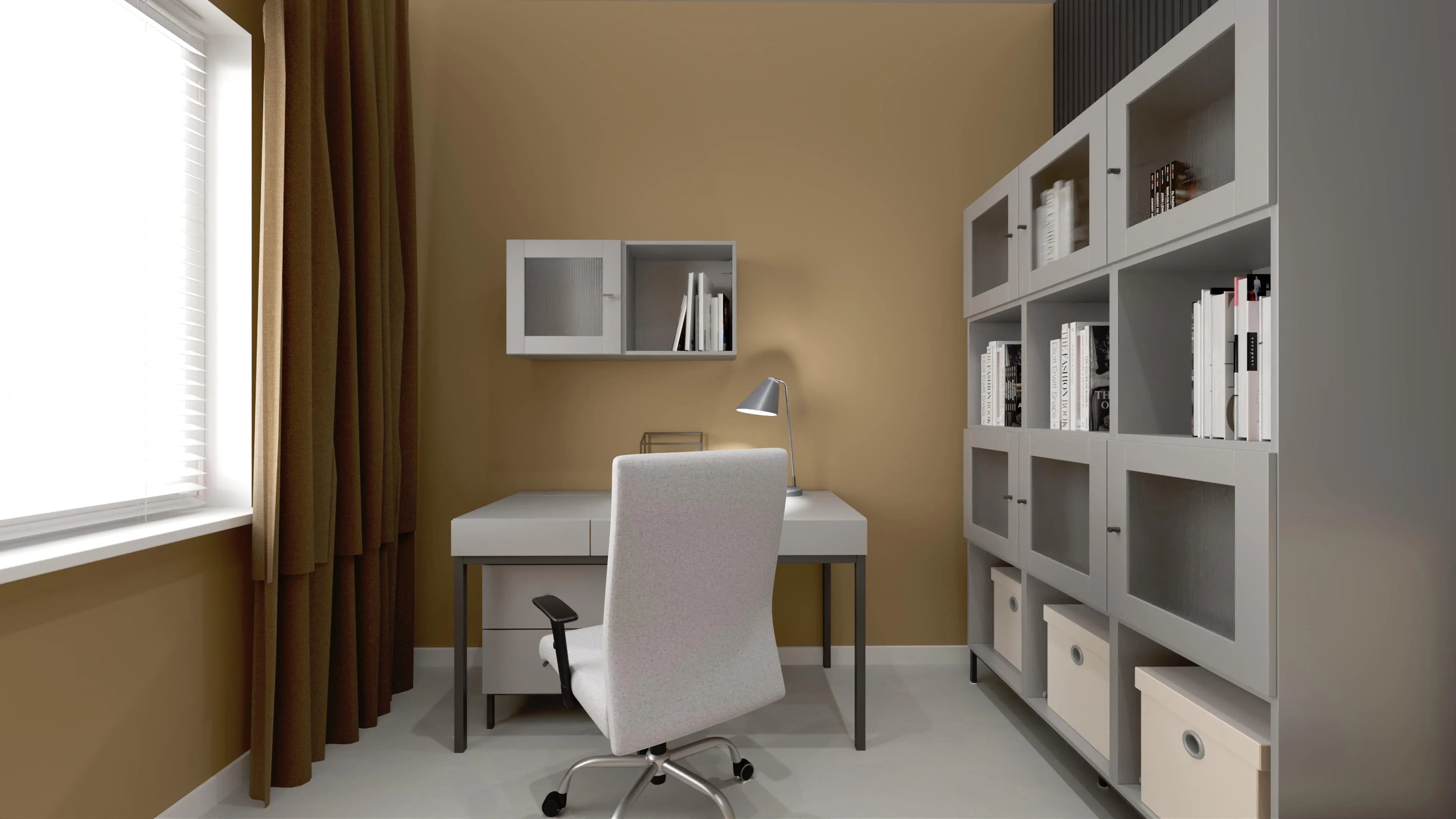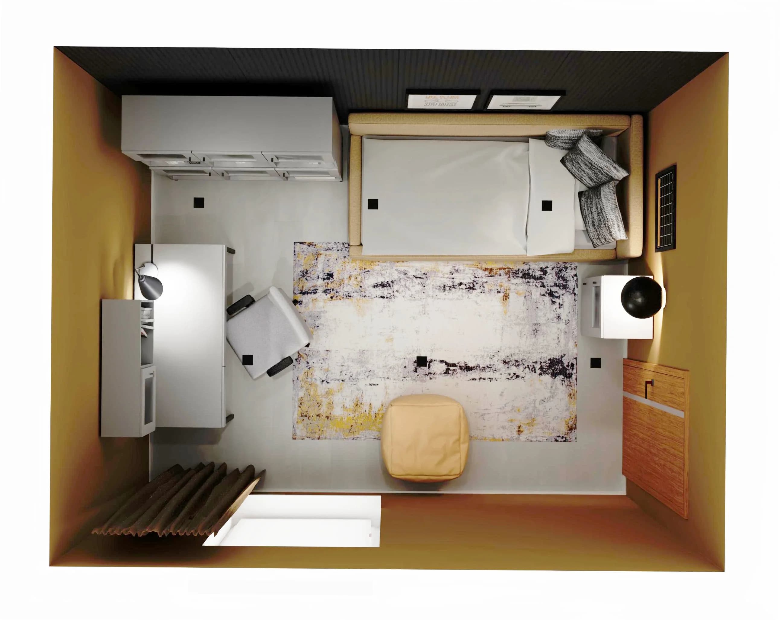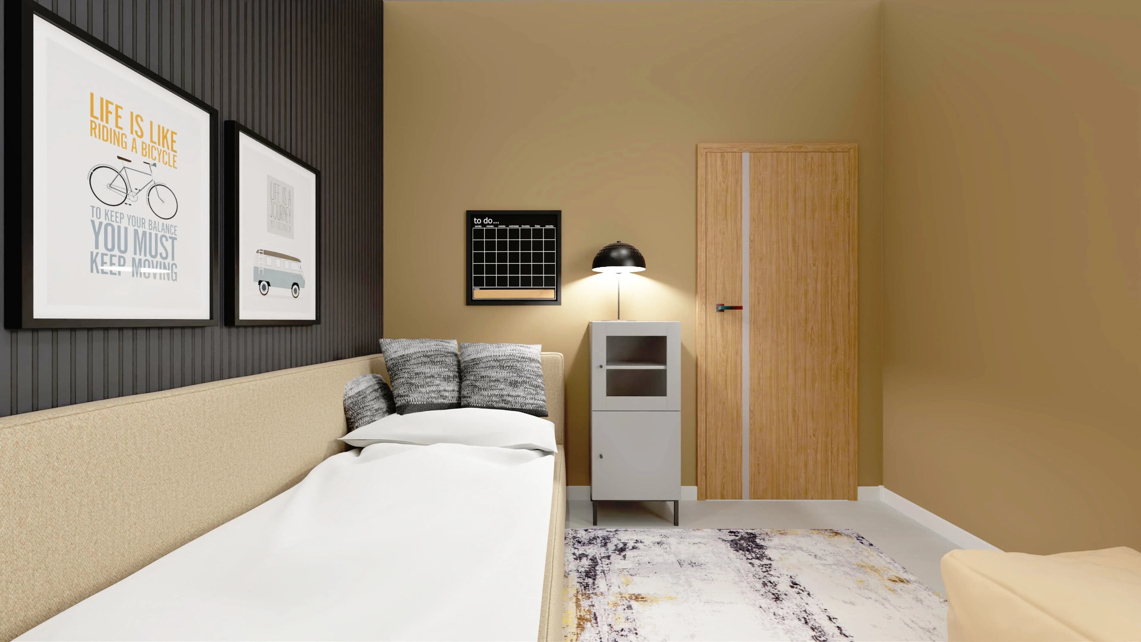 Pokój młodzieżowy, choć niewielki, zaskakuje funkcjonalnością. Wtulone w róg narożne łóżko zaprasza do snu, a dzięki wygodnemu oparciu jest też miejscem spotkań z przyjaciółmi. Przestronny regał pomaga w organizacji wnętrza, dobrze komponując się z biurkiem obok. Komfortowej nauce sprzyja obrotowy fotel. O przytulność dbają duży dywan i ściana lameli.