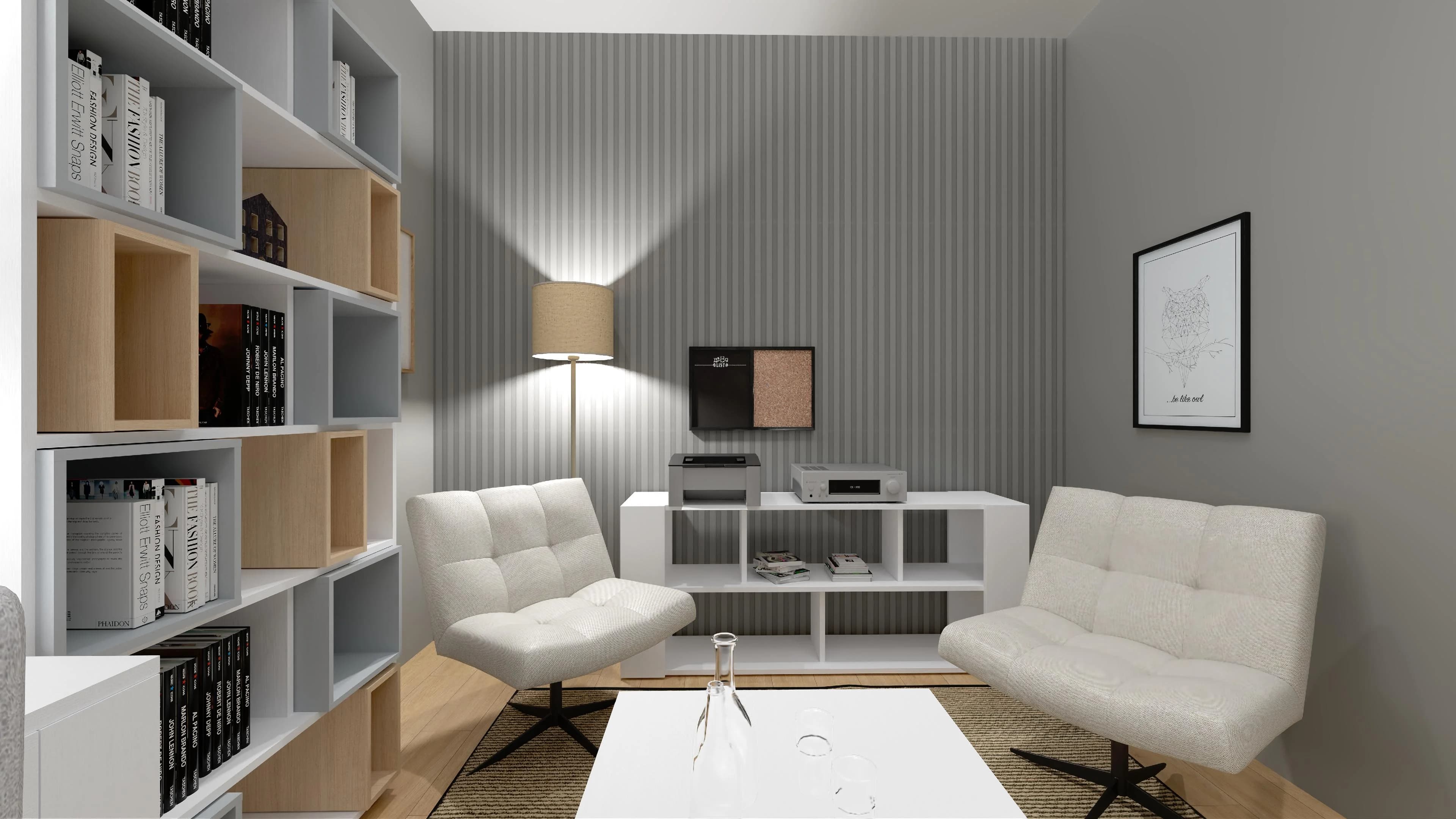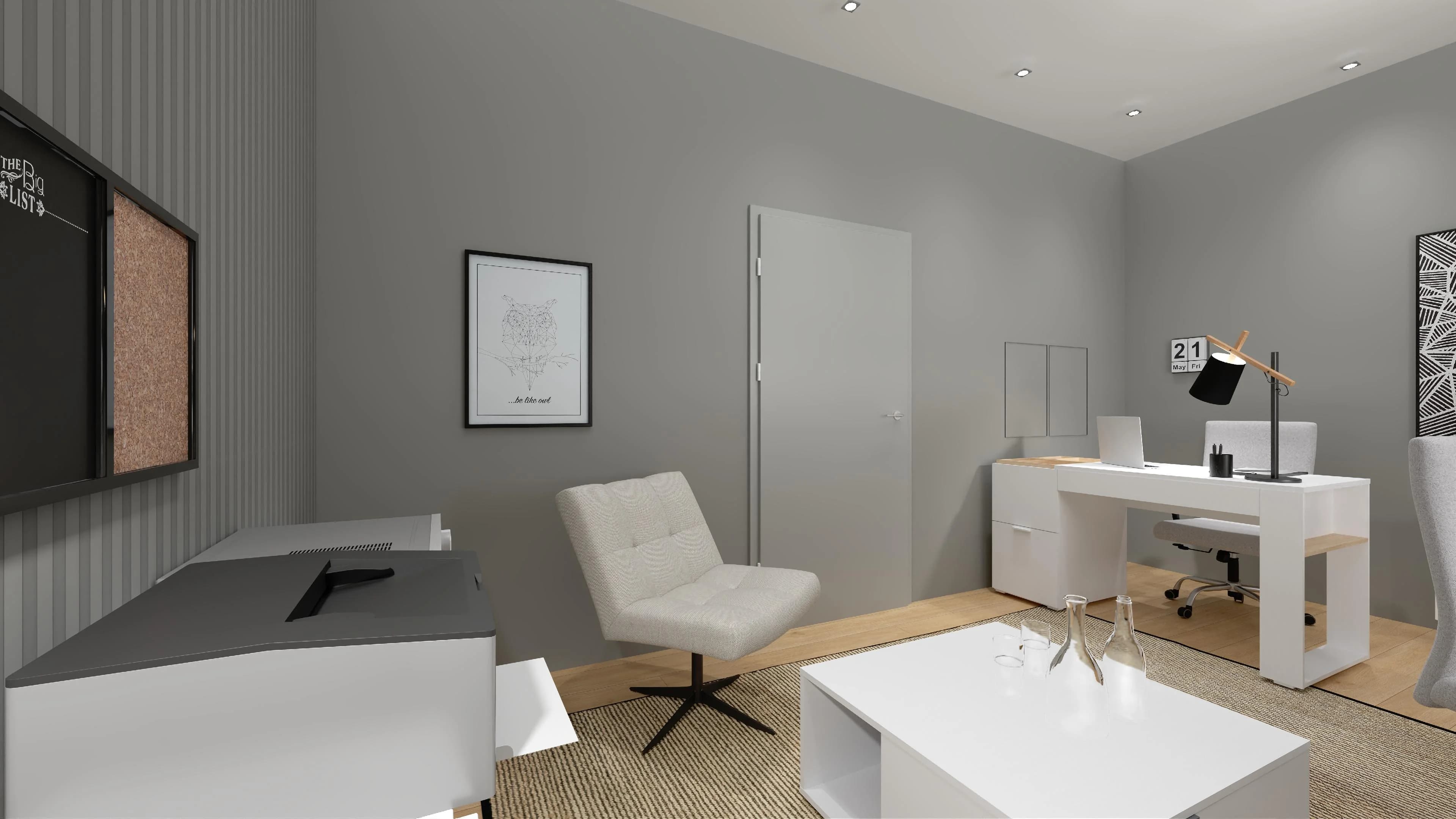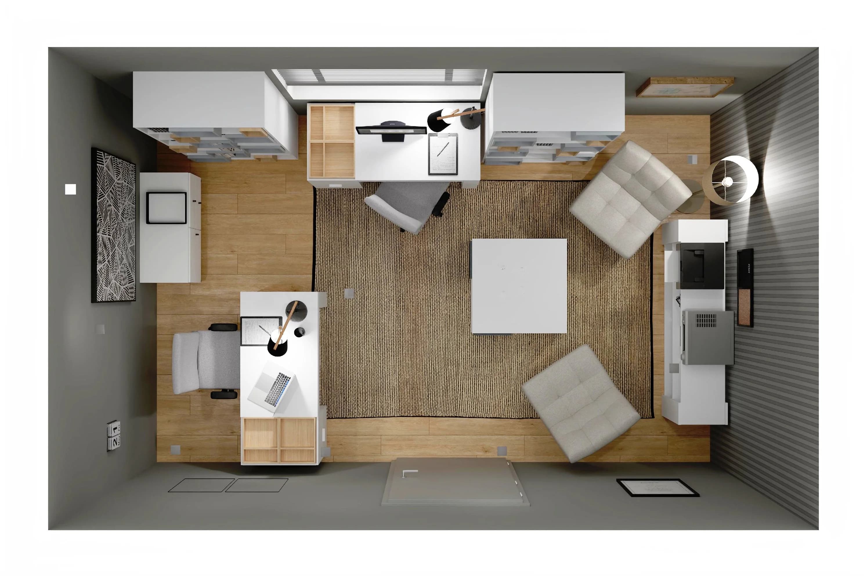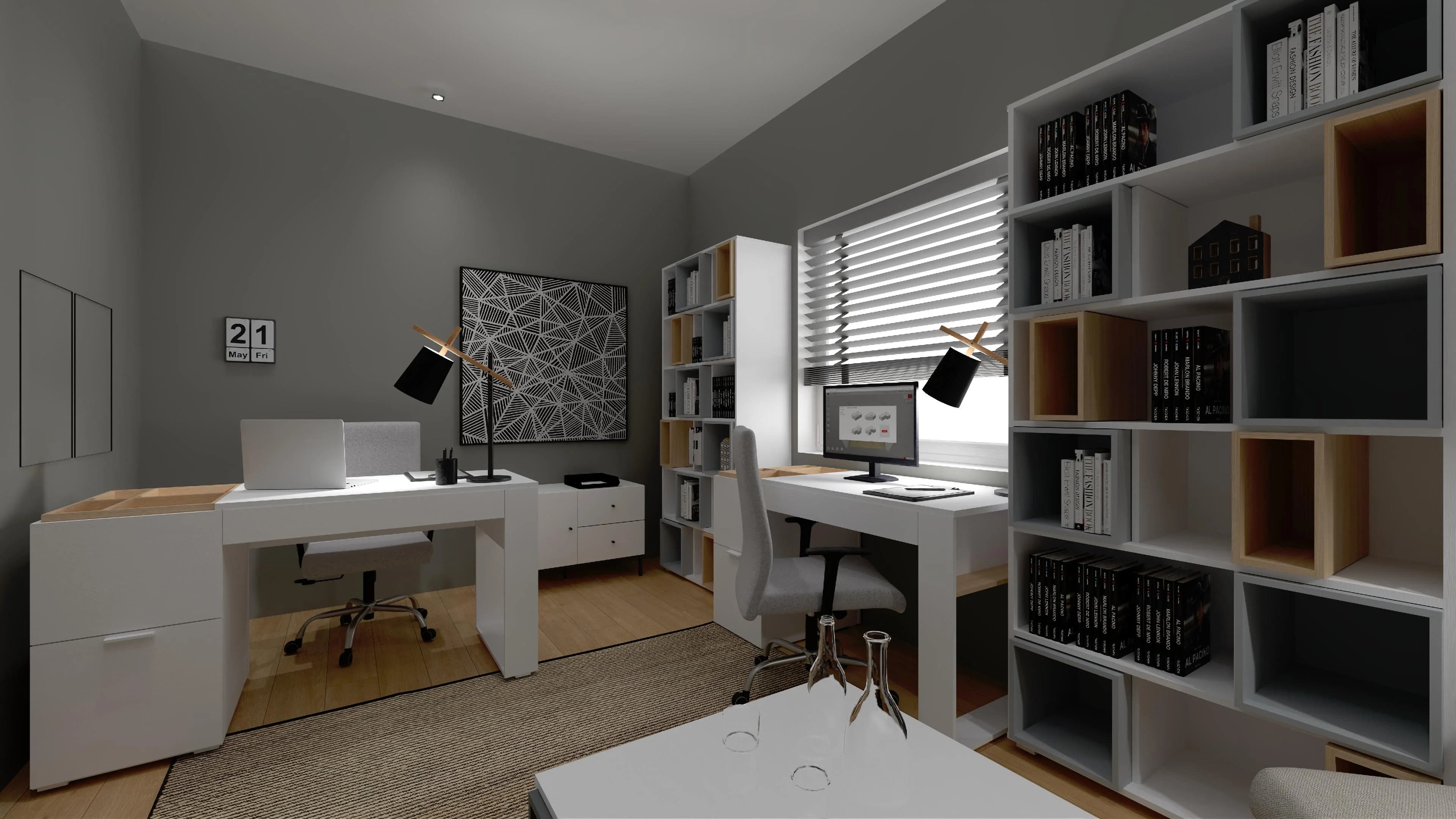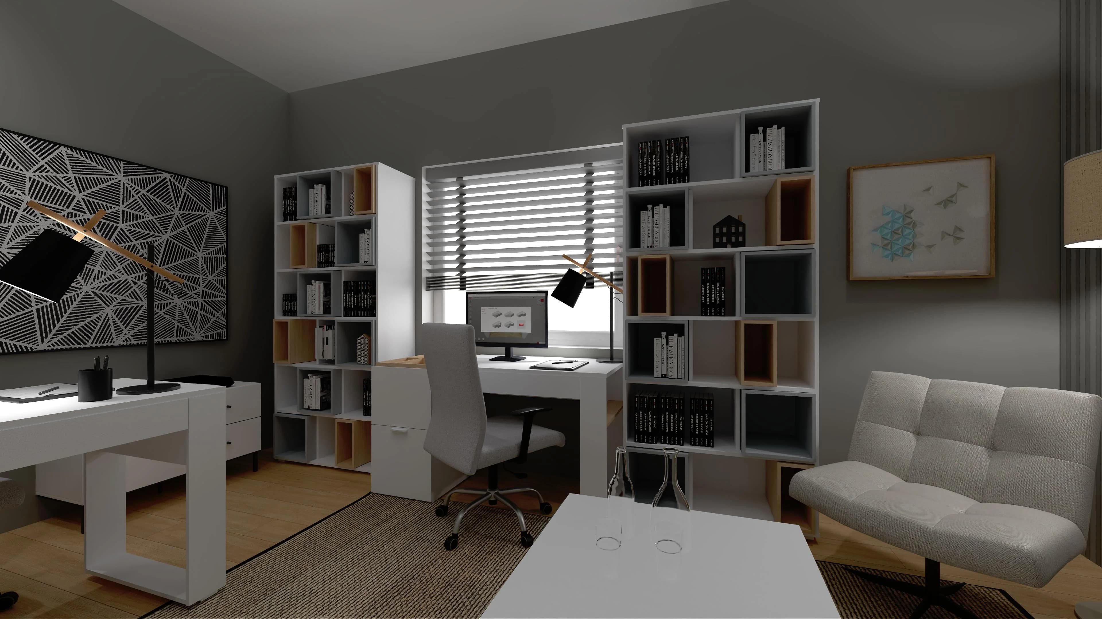 Dzięki sprytnie wykorzystanej przestrzeni praca w trybie home office będzie przyjemnością. Podstawę tej aranżacji stanowią dwa biurka z szufladami i obrotowymi krzesłami. Modułowe regały pozwalają łatwo uporządkować ważne dokumenty, książki i akcesoria, a kącik z dwoma fotelami i stolikiem kawowym oferuje wygodne miejsce do relaksu i służbowych spotkań.