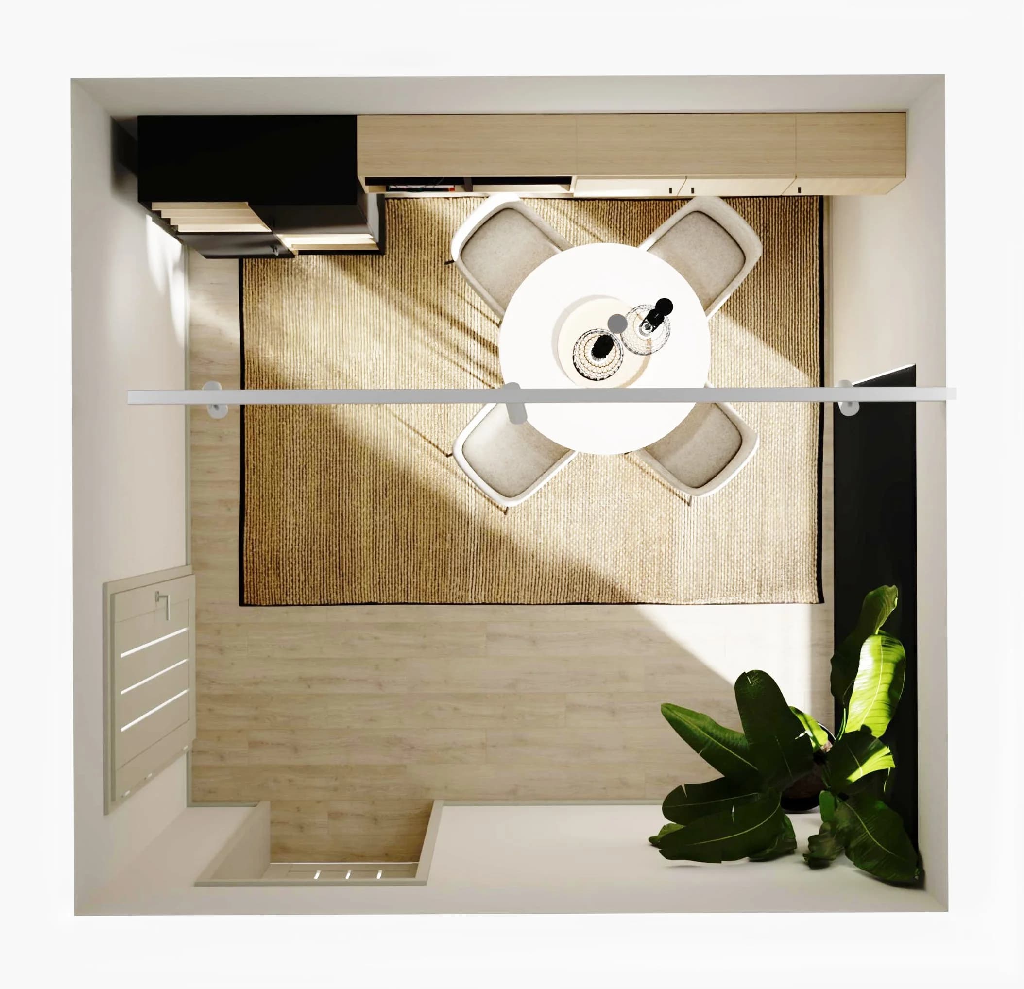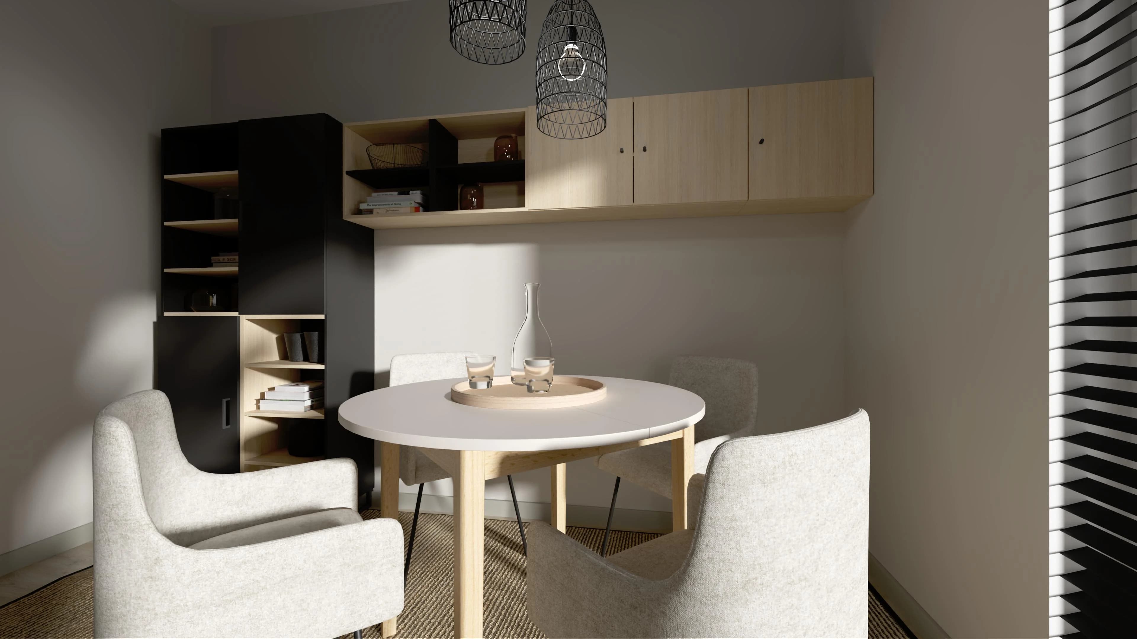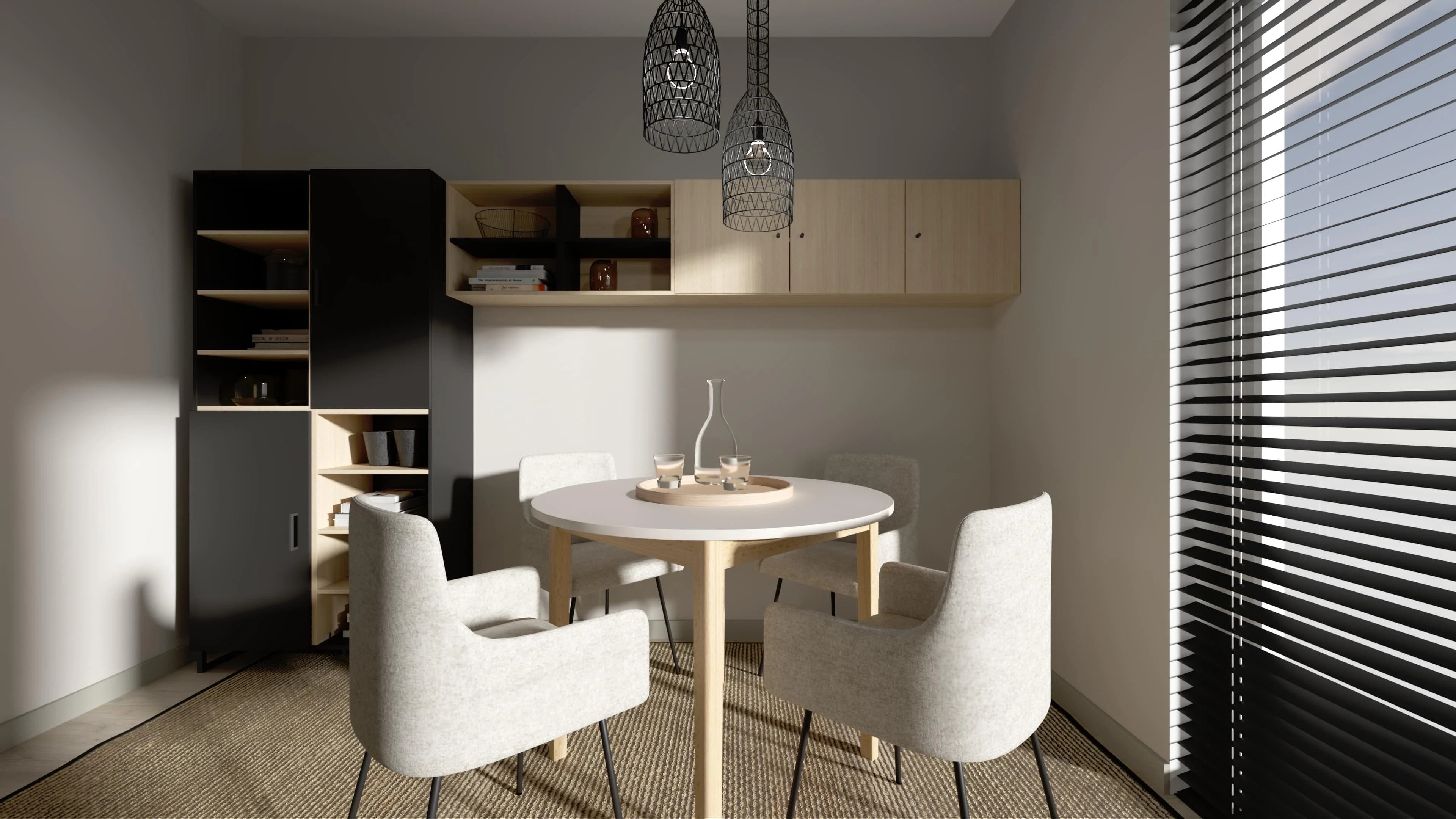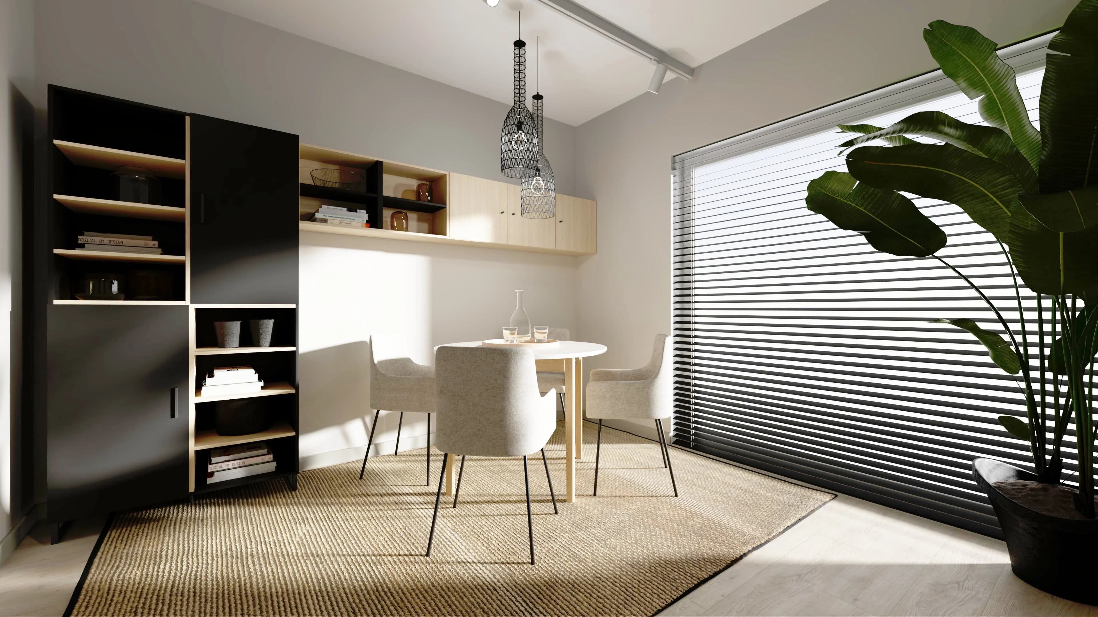 W nowocześnie urządzonej jadalni spotyka się kolor drewna z akcentami czerni. Uwagę zwraca czarny regał, który pięknie prezentuje zastawę i pamiątki, oraz ciąg wiszących szafek na drobiazgi. Zgrabny stół z okrągłym blatem w razie potrzeby posłuży do pracy z domu. Duży dywan i roślina w doniczce łagodzą przestrzeń, wprowadzając naturalny akcent.