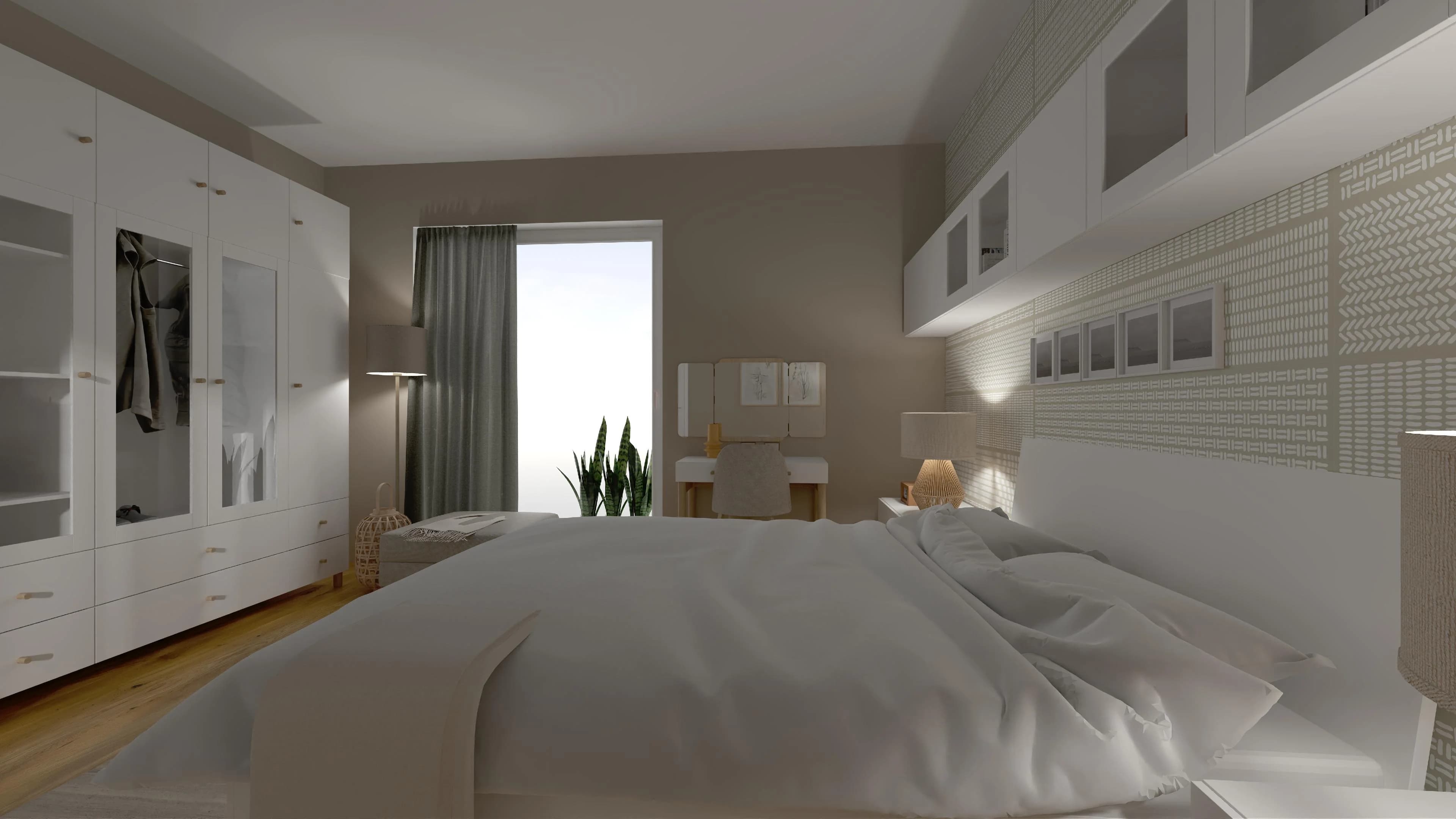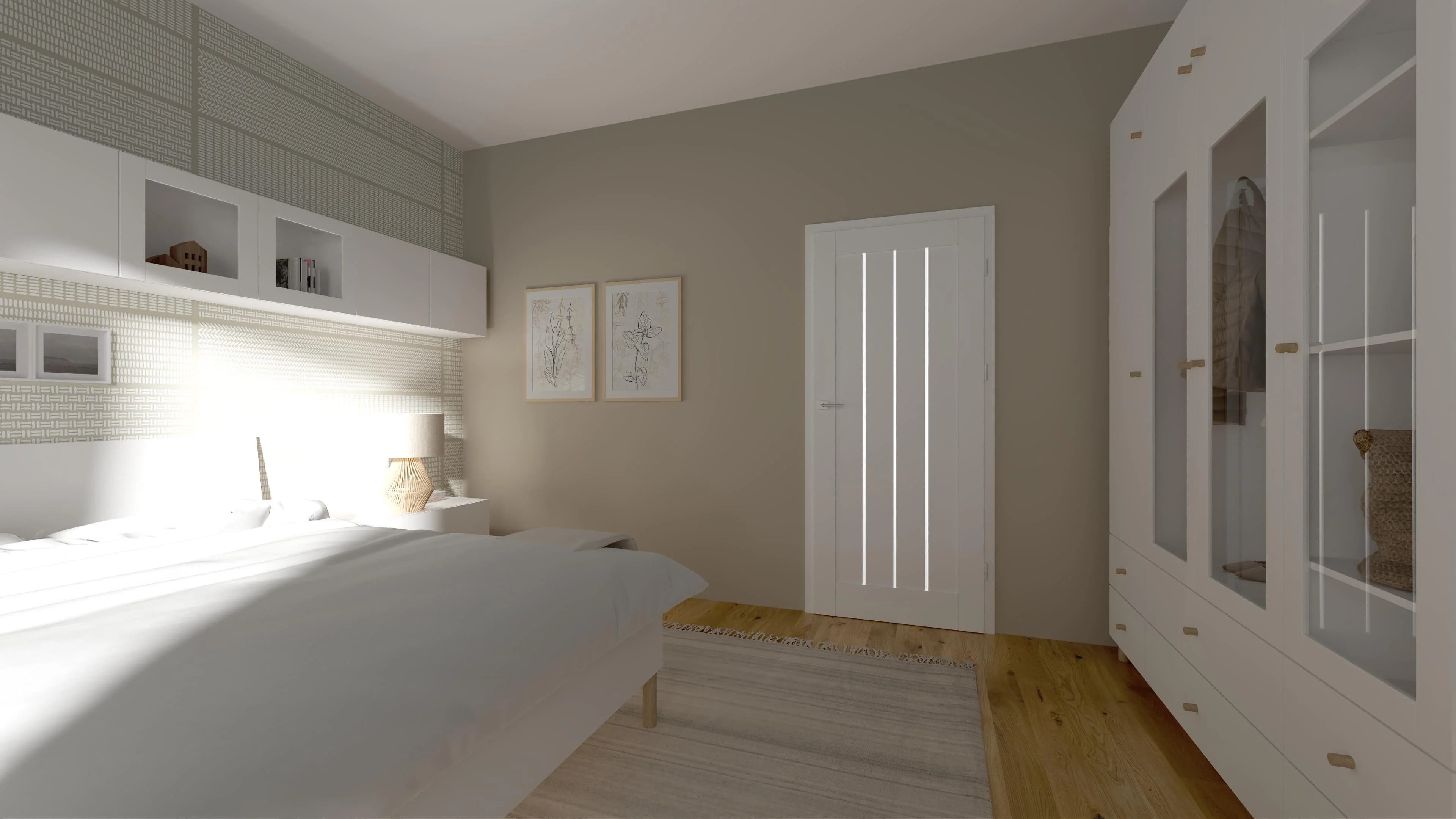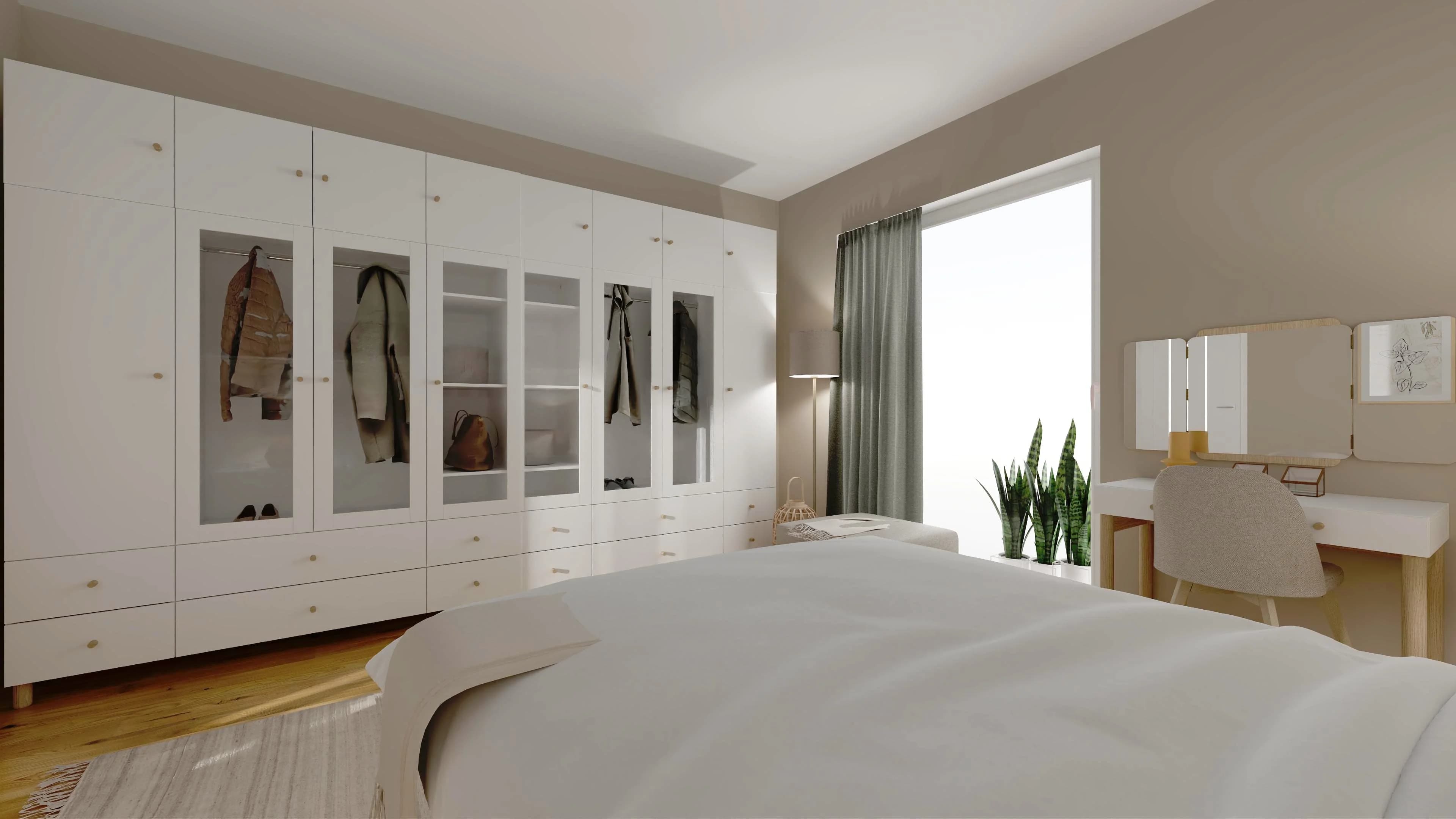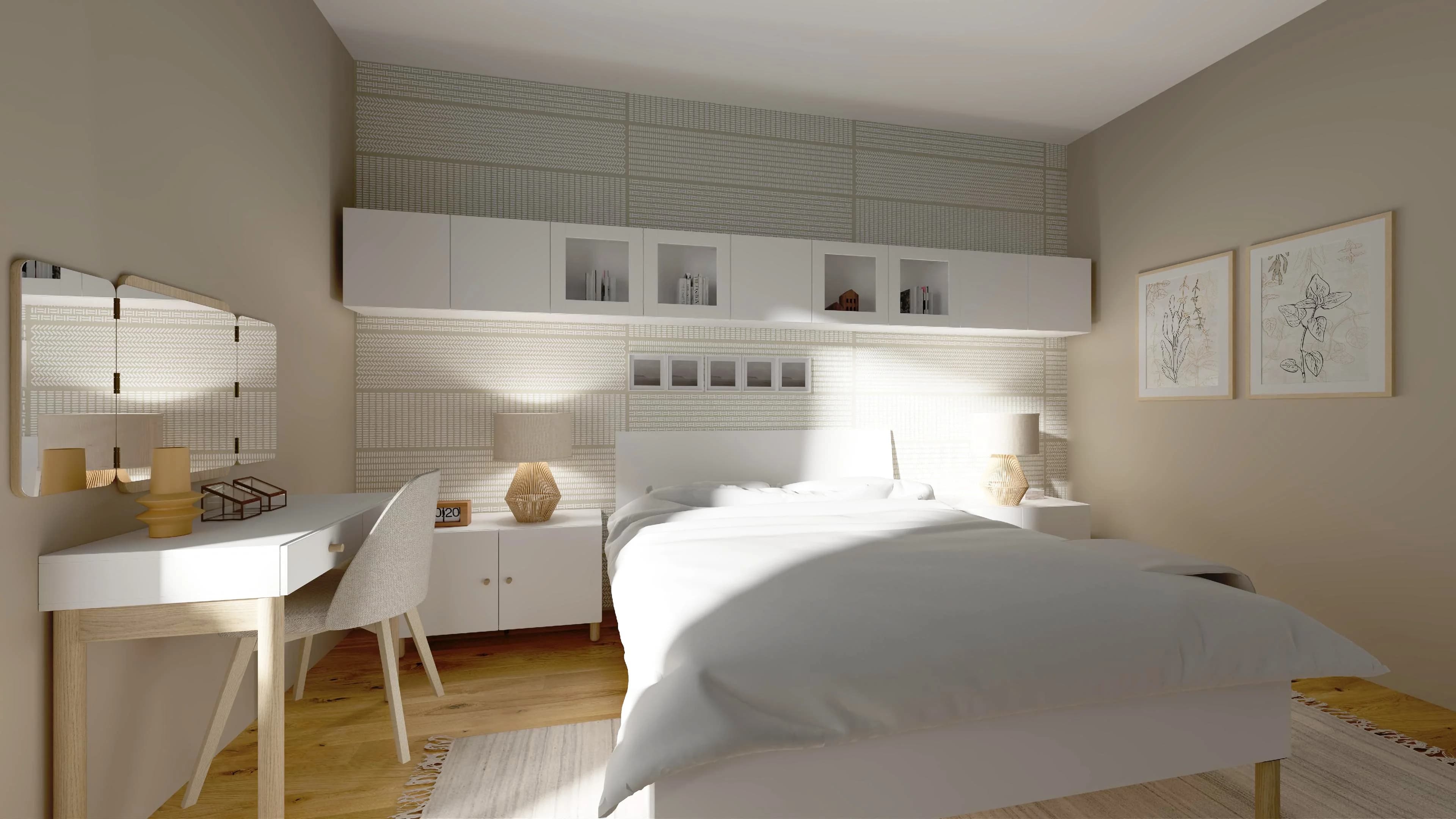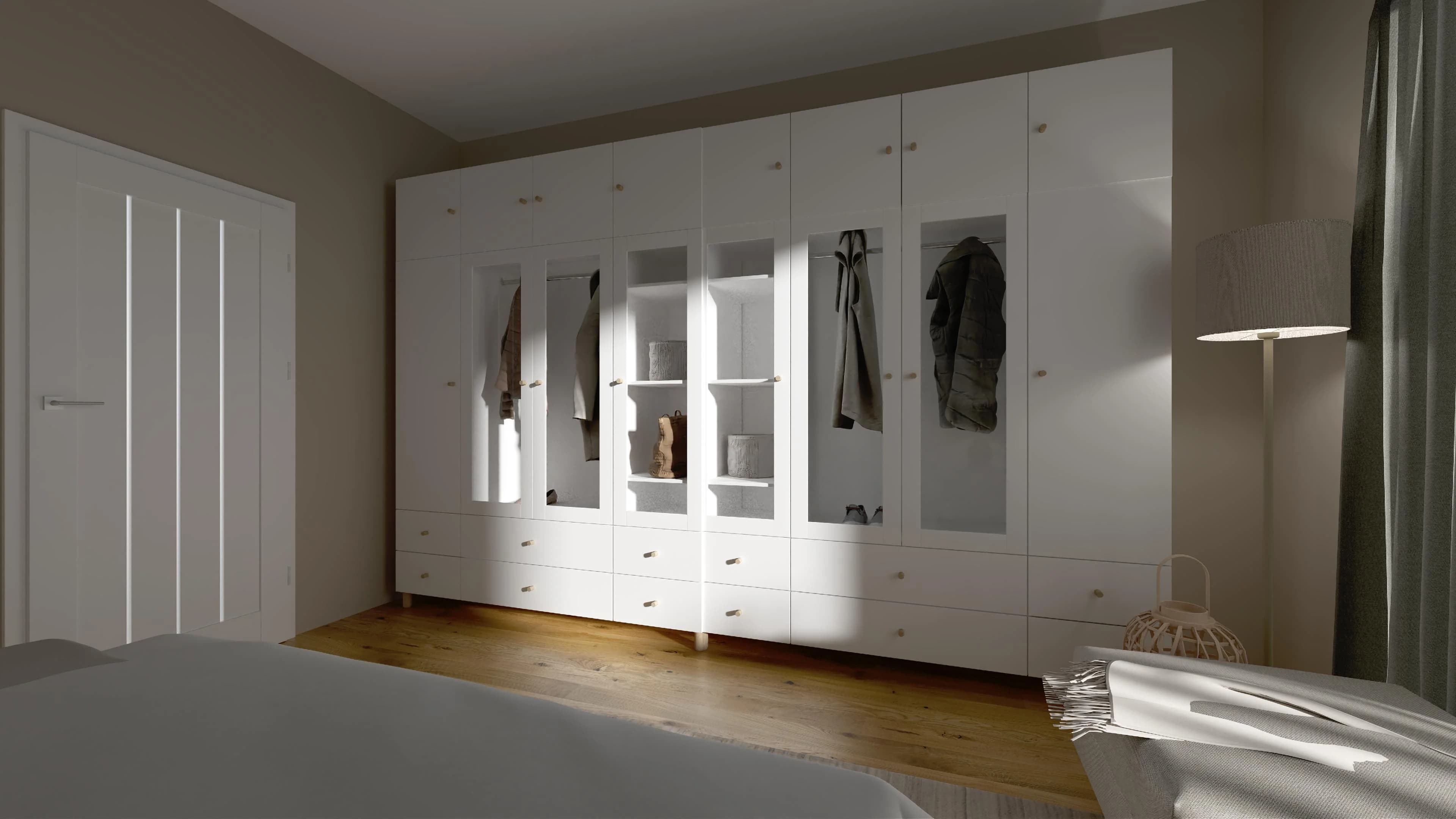Otulona bielą sypialnia to wnętrze, które koi wszystkie zmysły. Porządek pozwalają utrzymać pakowne meble z przeszklonymi frontami, w których zmieści się cała garderoba. Wieczornej pielęgnacji i przygotowaniom do wyjścia sprzyja toaletka z teatralnym lustrem. Duże łóżko zyskuje na wygodzie dzięki pochylonemu wezgłowiu, o które można się oprzeć.
