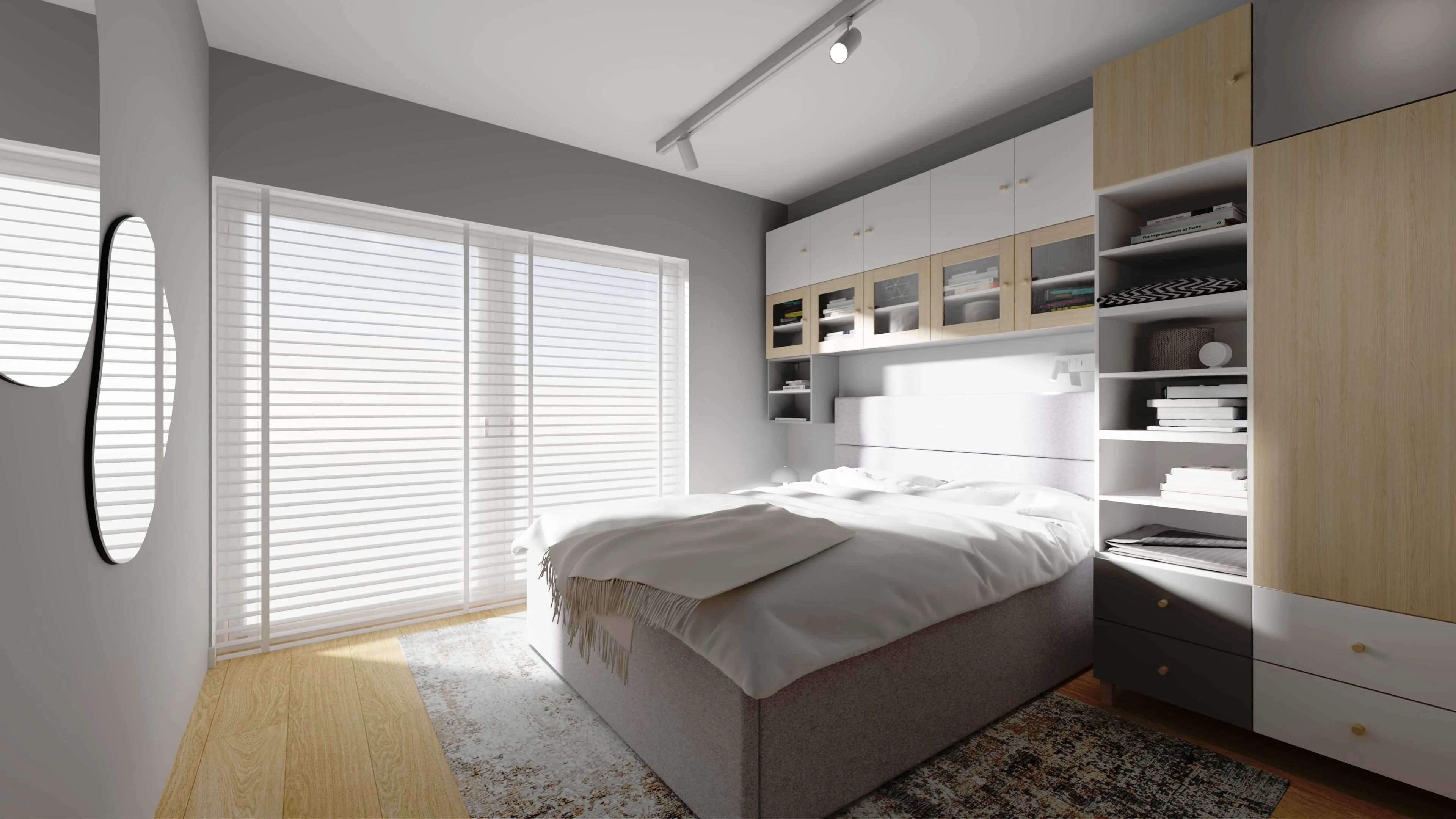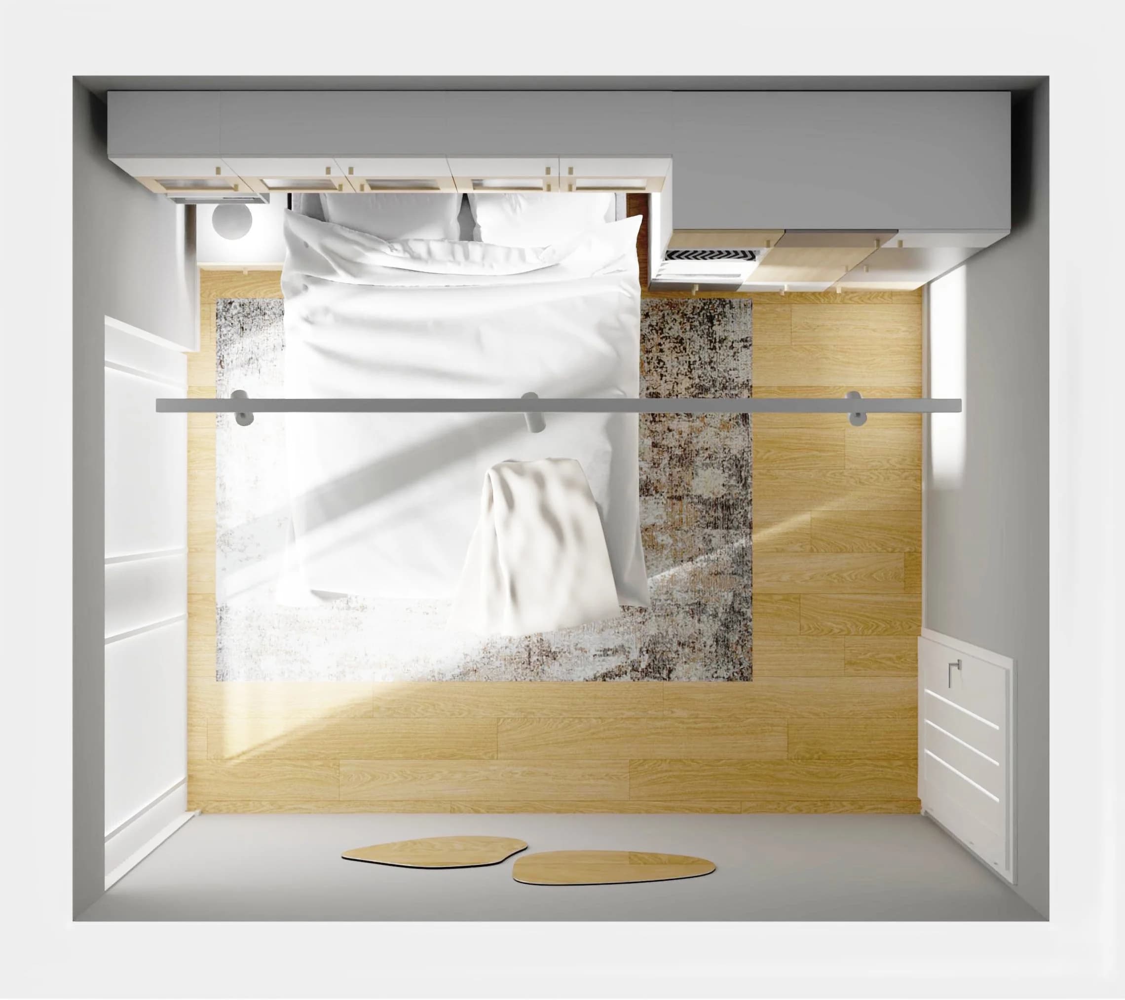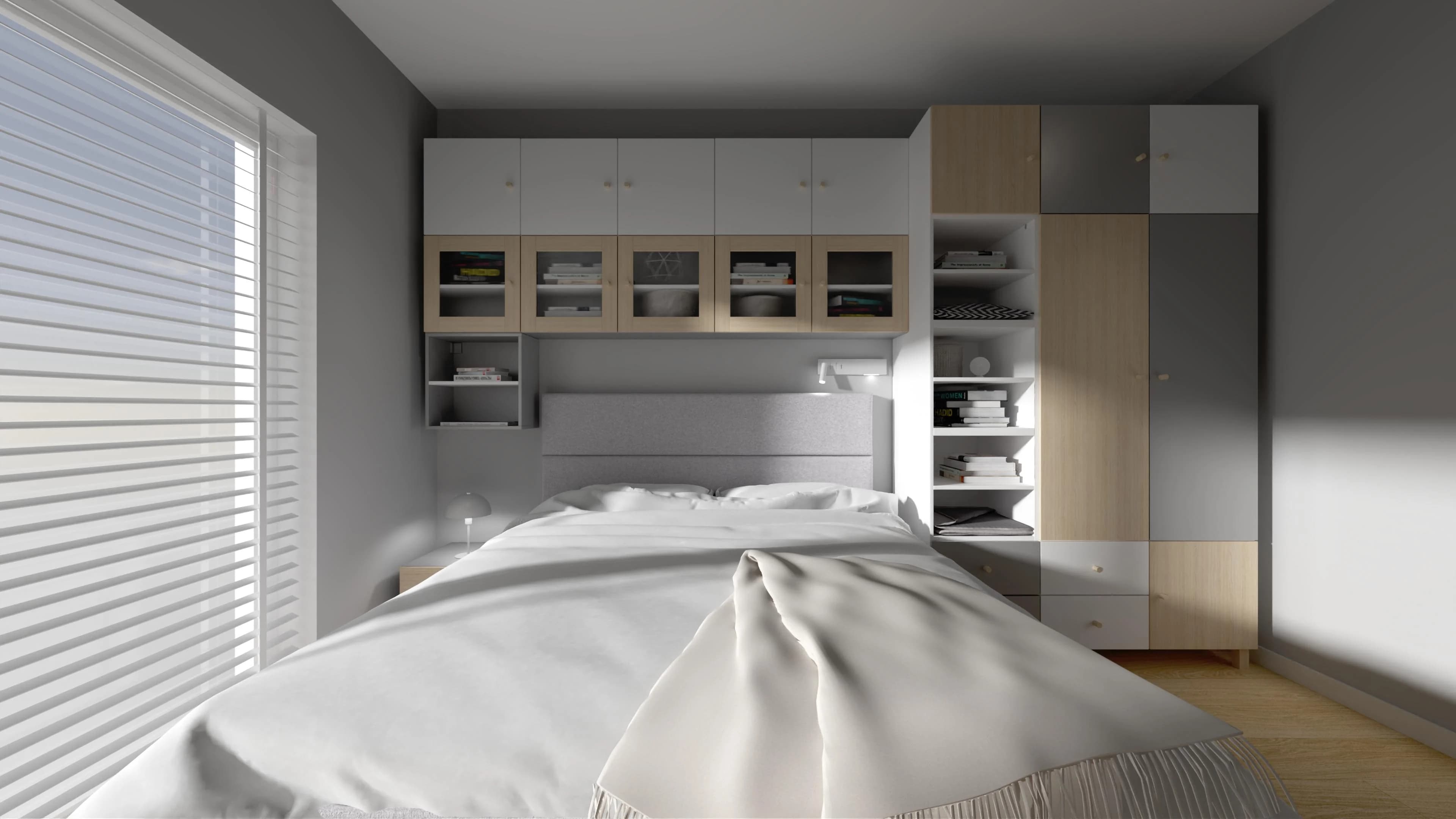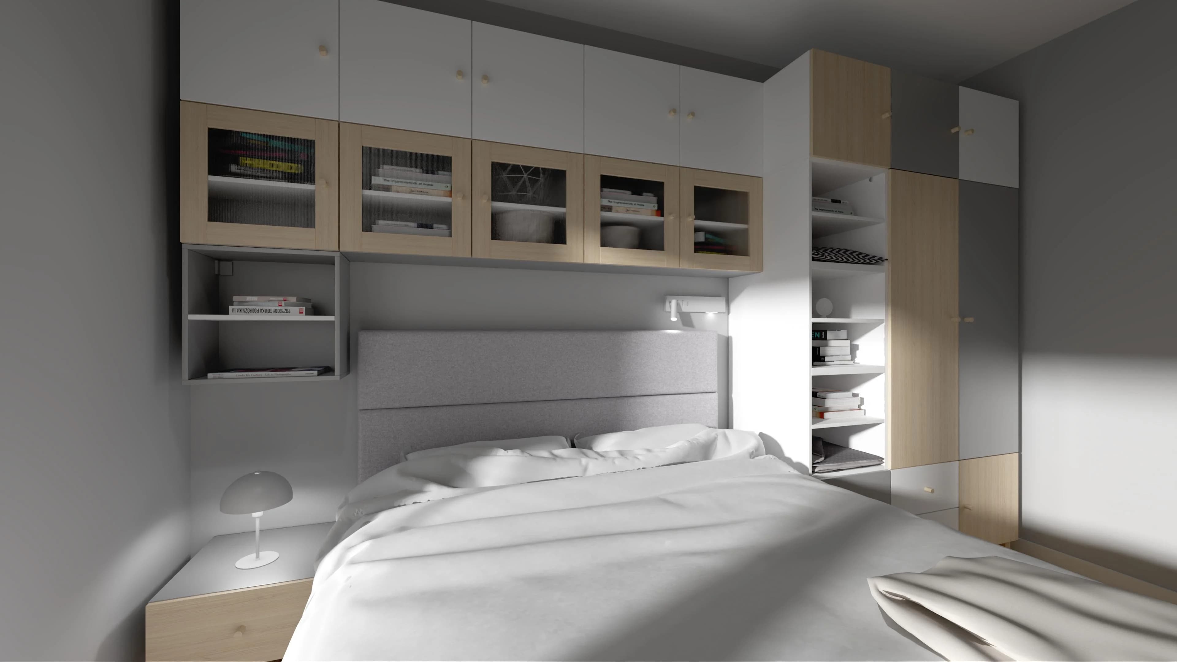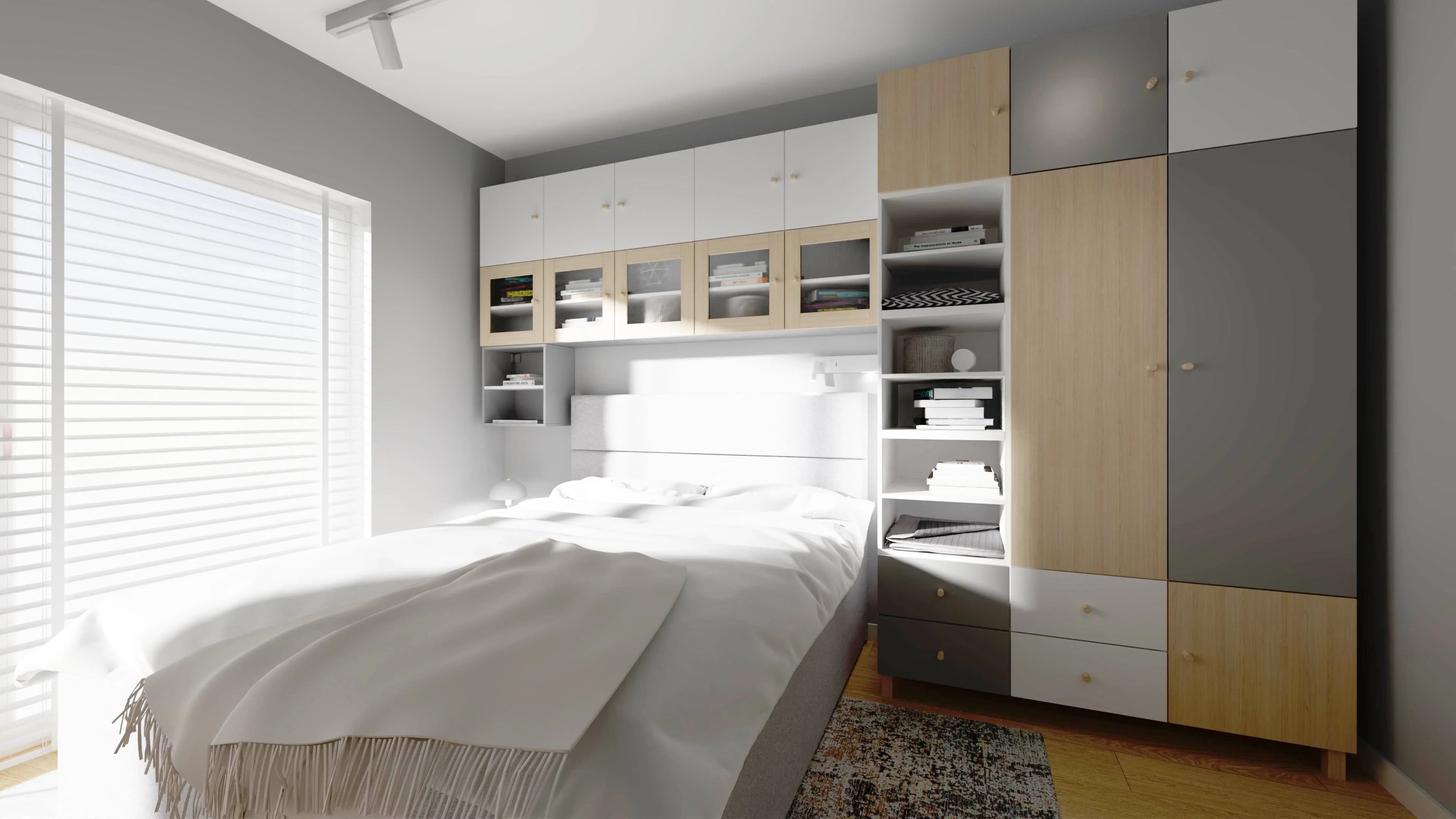 Ta mała sypialnia pełna jest rozwiązań, które pozwalają wykorzystać każdy centymetr. Zawieszone nad łóżkiem szafki płynnie łączą się z dużą szafą i regałem, które sprzyjają utrzymaniu porządku. Na tapicerowanym łóżku mogą wygodnie wyspać się dwie osoby. Stonowana kolorystyka i miękkie tkaniny sprawiają, że wnętrze zyskuje ciepły, przytulny charakter.