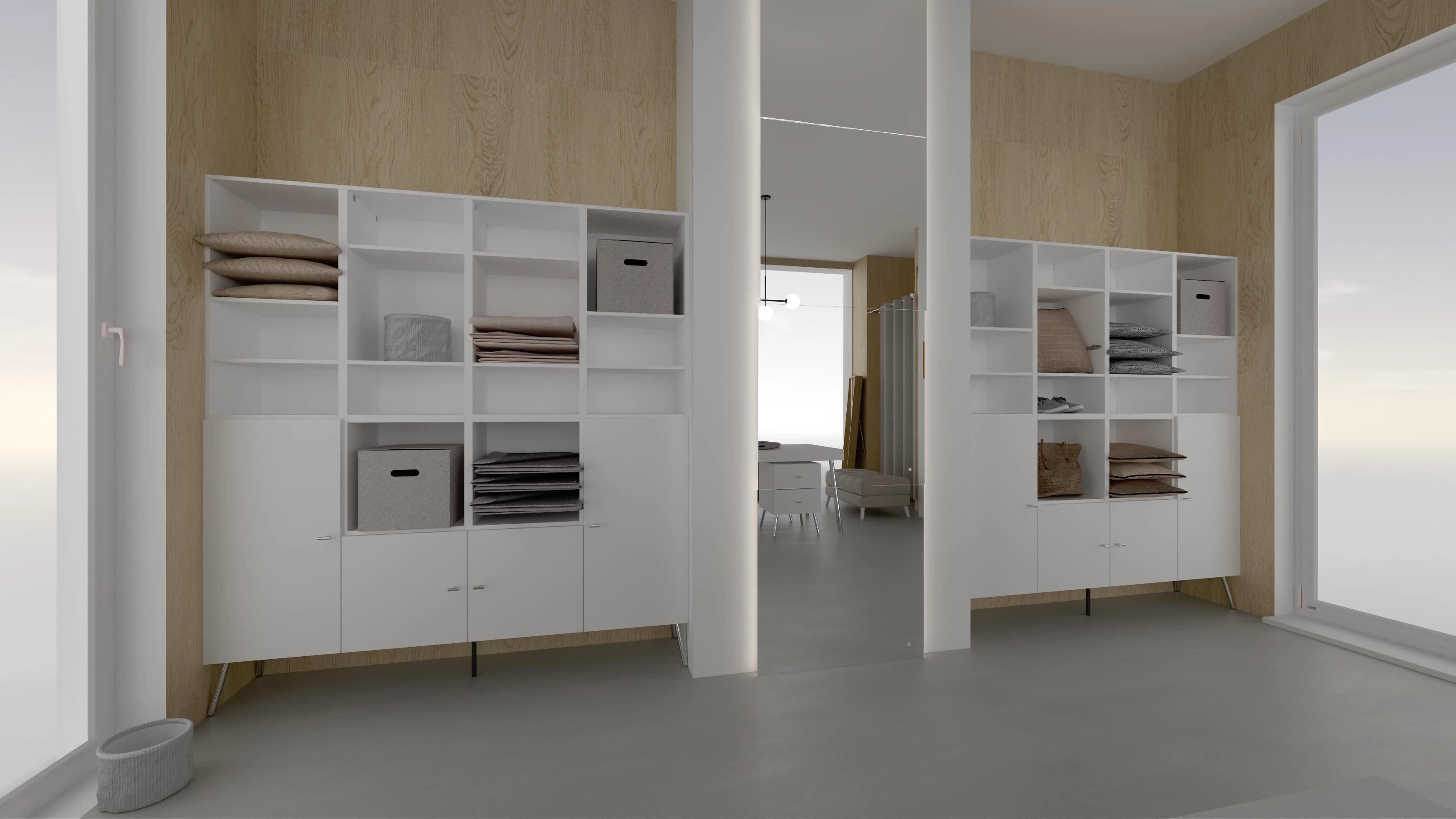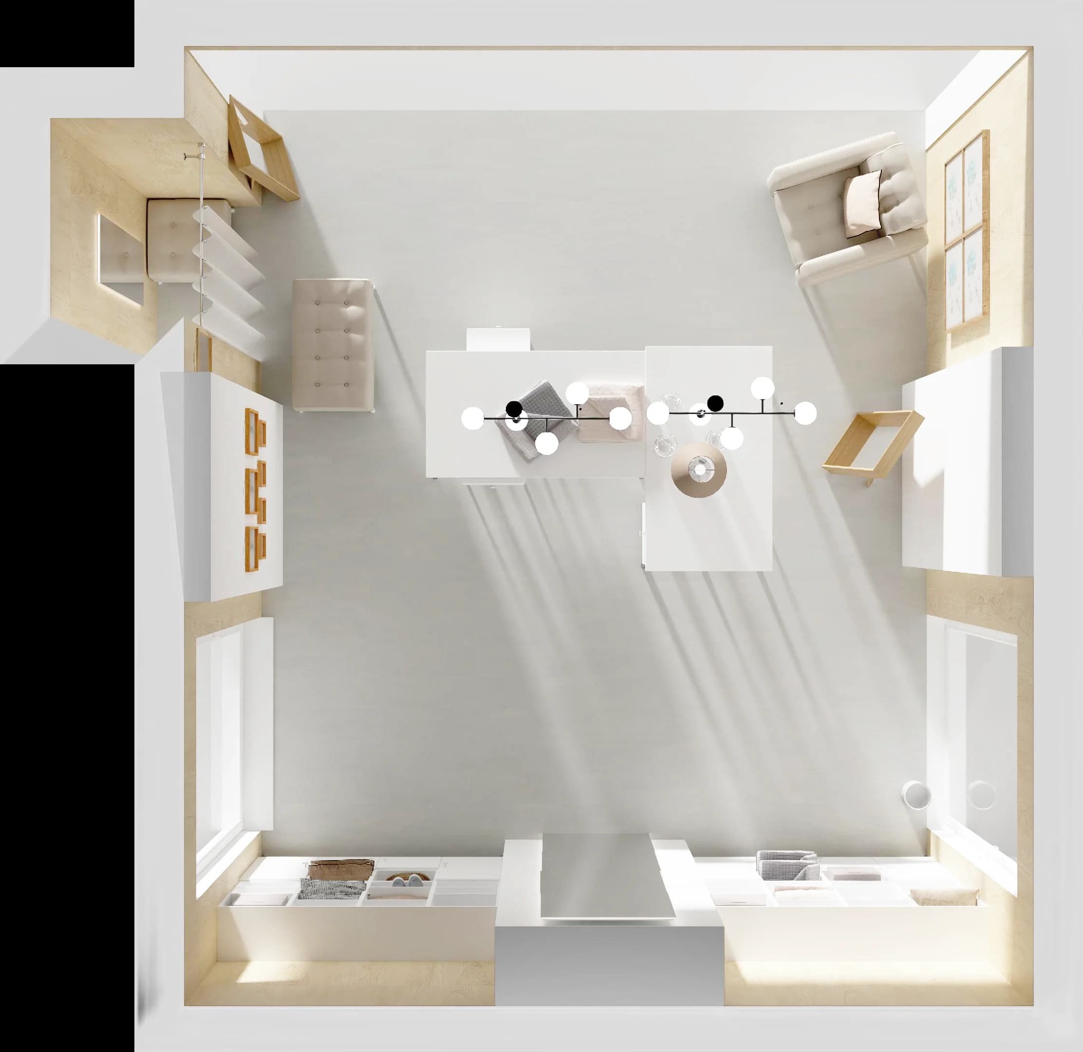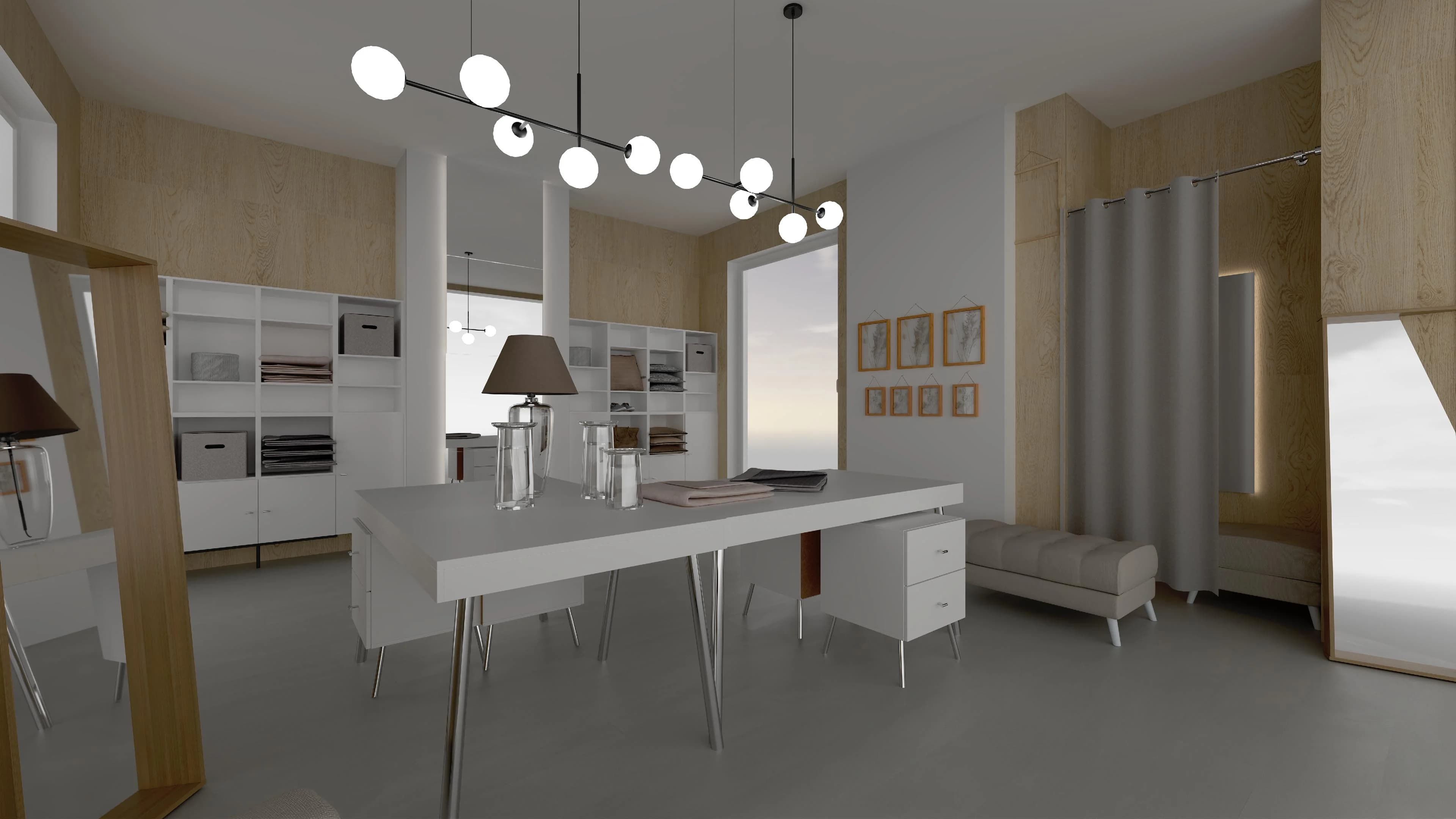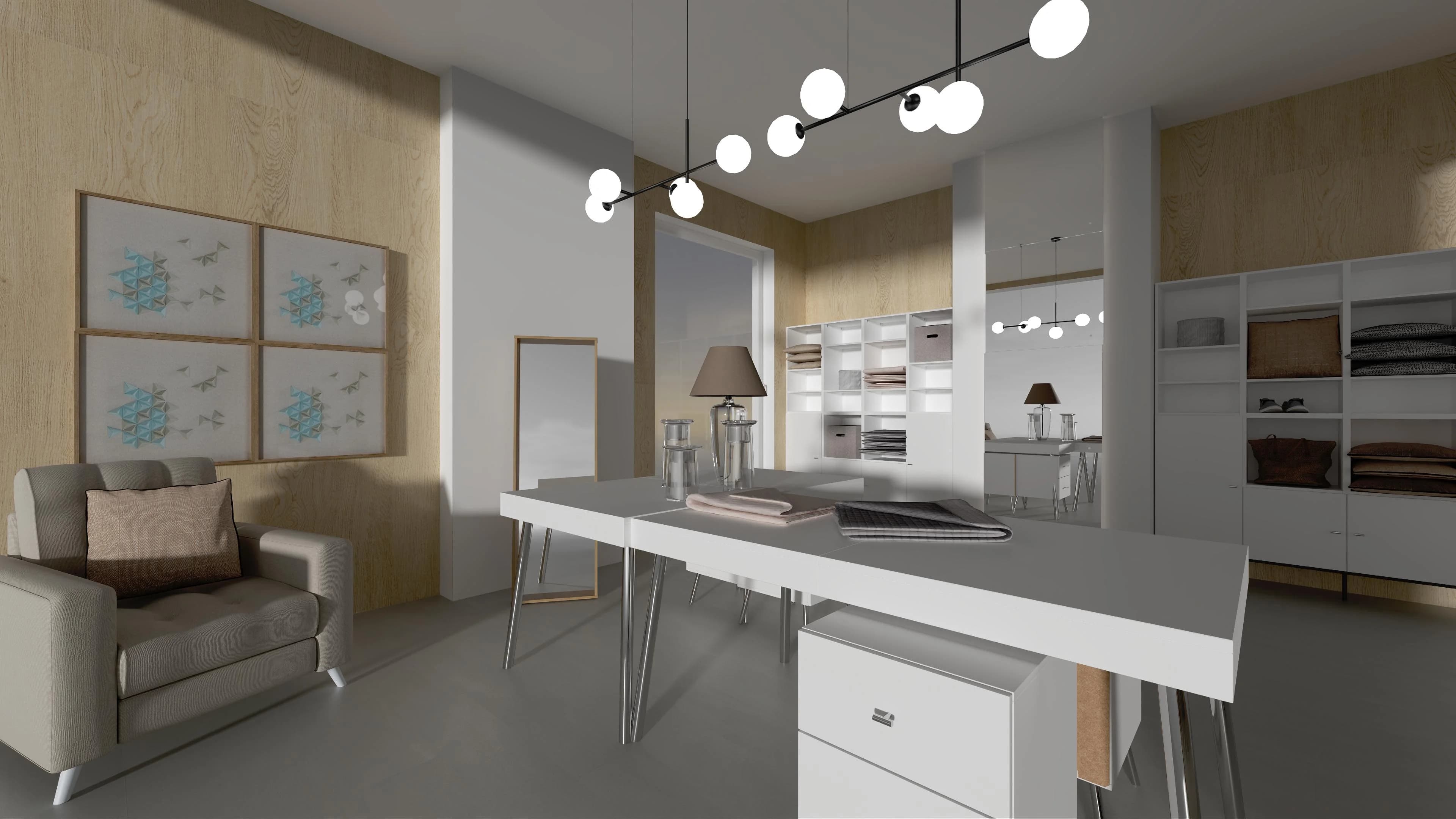 Przestrzeni tego butiku nadaje harmonii ponadczasowe połączenie barw – ciepłego drewna z elegancką bielą. Dzięki prostym meblom, osadzonym na metalowych nóżkach, wnętrze sprzyja dobrej organizacji i ekspozycji produktów. Ustawiona w centrum narożna kompozycja stołów to miejsce do obsługi klientów. Komfortową przerwę w zakupach umożliwiają wygodny fotel i puf.