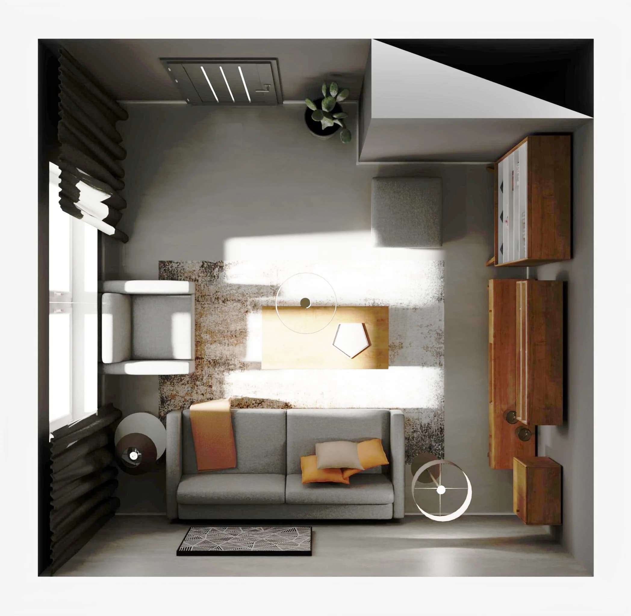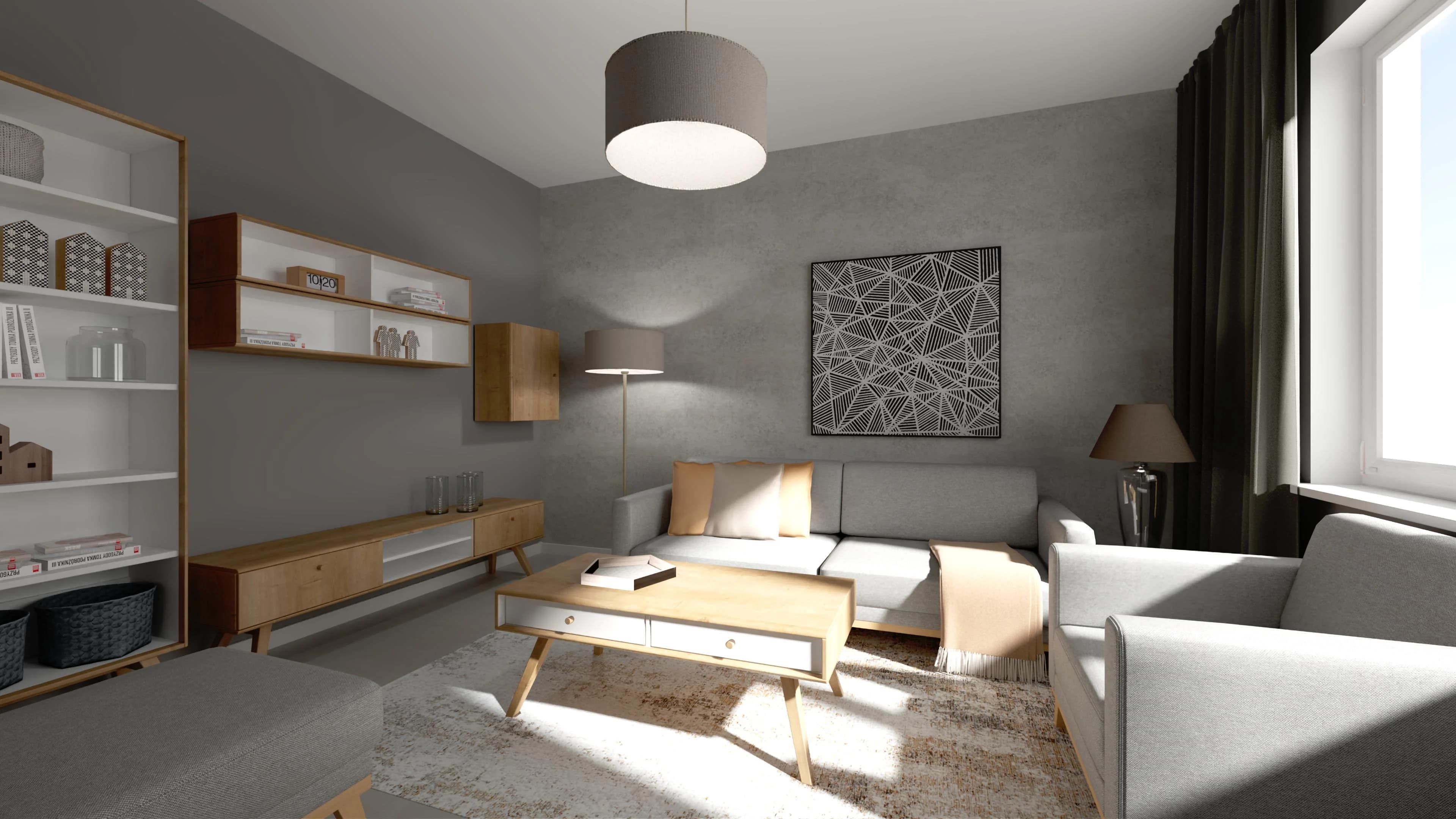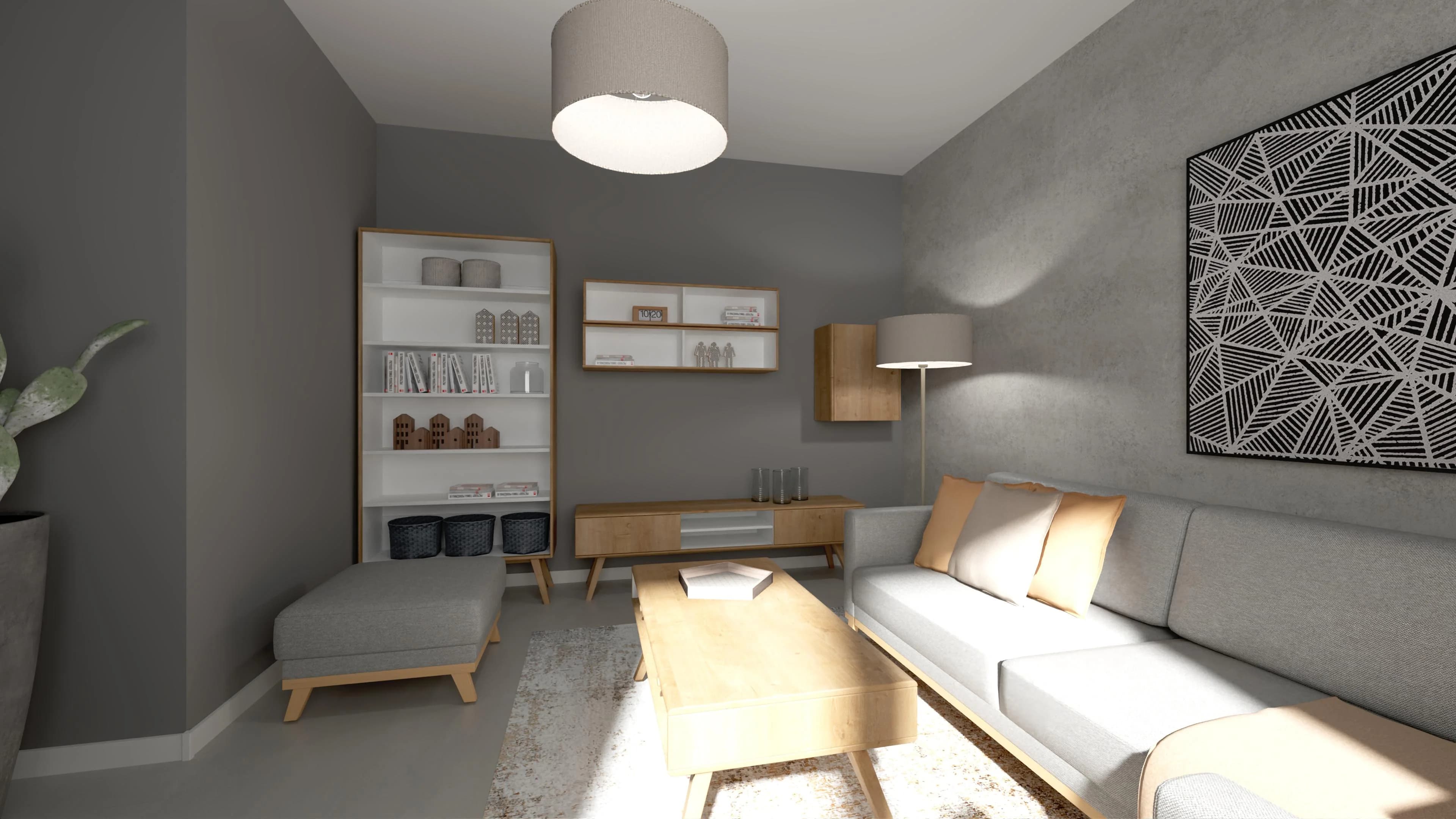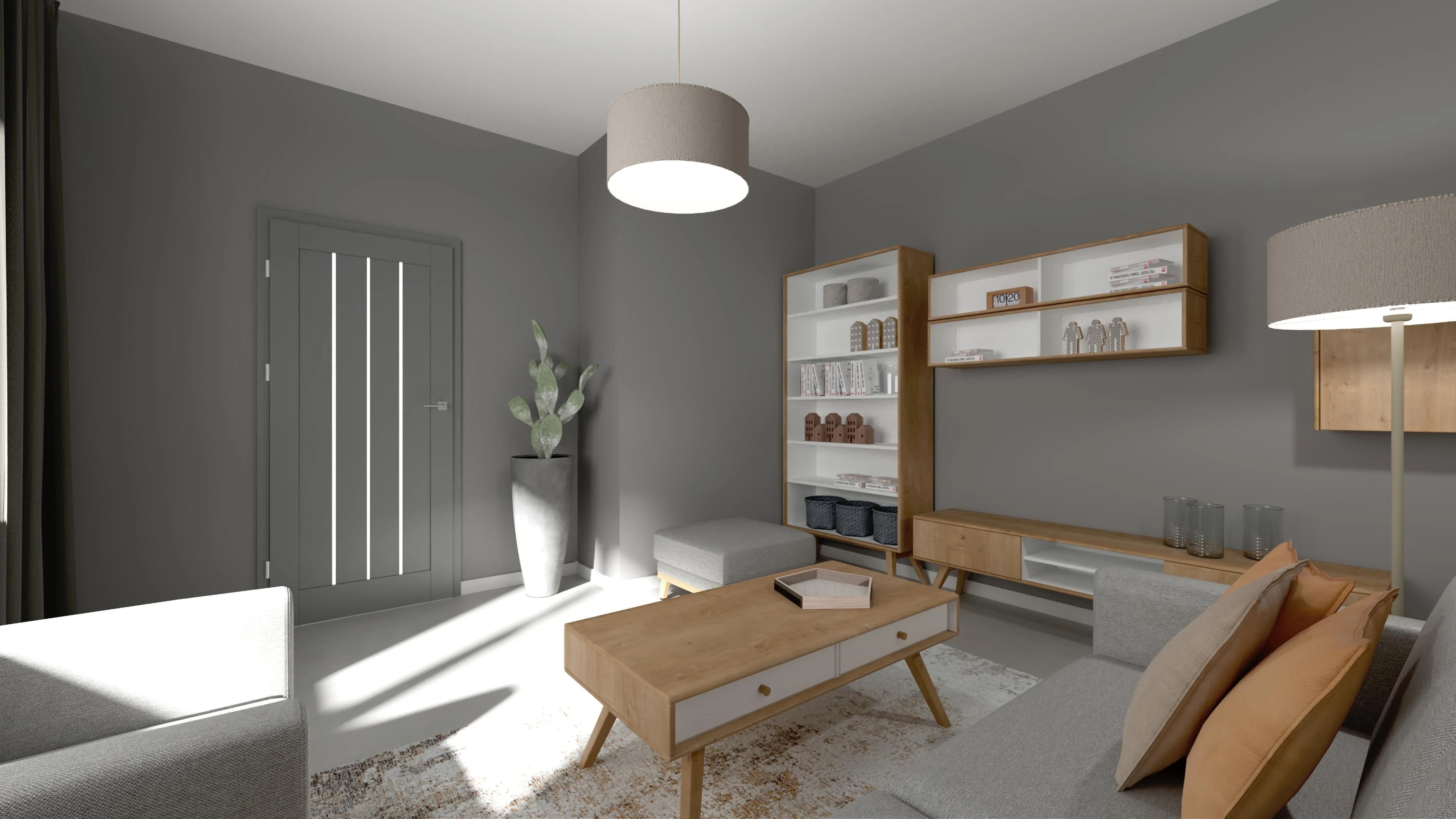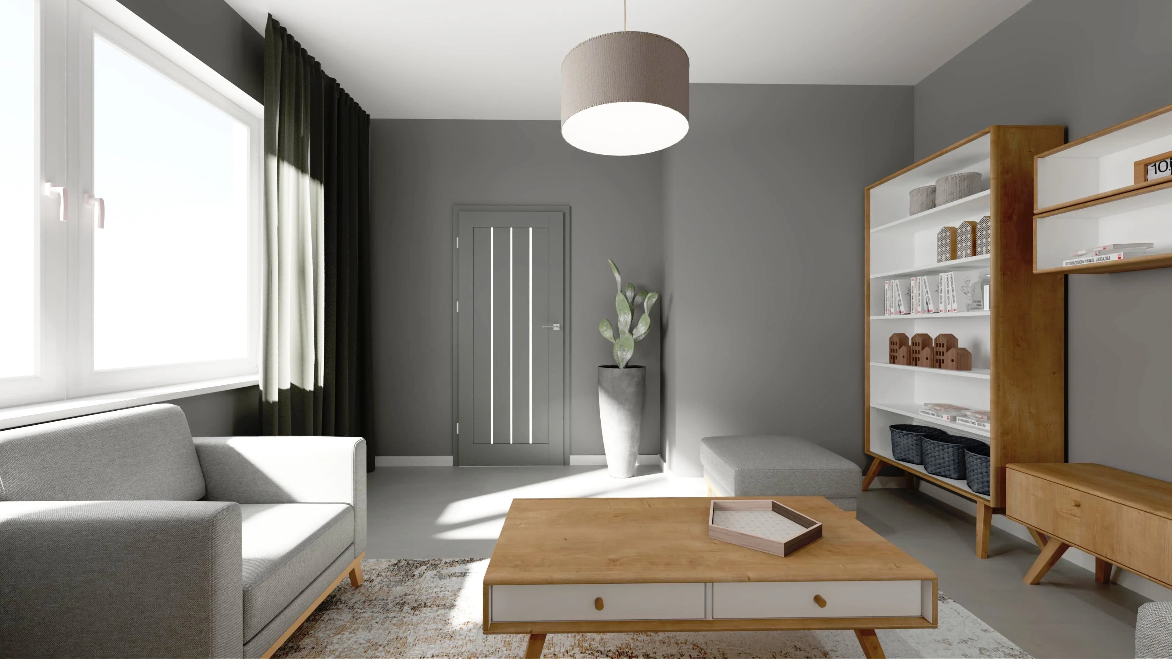 Salon utrzymany jest w eleganckiej palecie szarości, z wygodnym narożnikiem i pufą, które tworzą spójną, nowoczesną całość. Szare ściany stanowią stonowane tło dla mebli w kolorze naturalnego drewna i bieli, które wprowadzają do wnętrza lekkość i ciepło. Ciemne zasłony dodają aranżacji głębi oraz podkreślają jej wyrafinowany charakter. Całość sprzyja zarówno codziennemu relaksowi, jak i spokojnym wieczorom w domowym zaciszu.