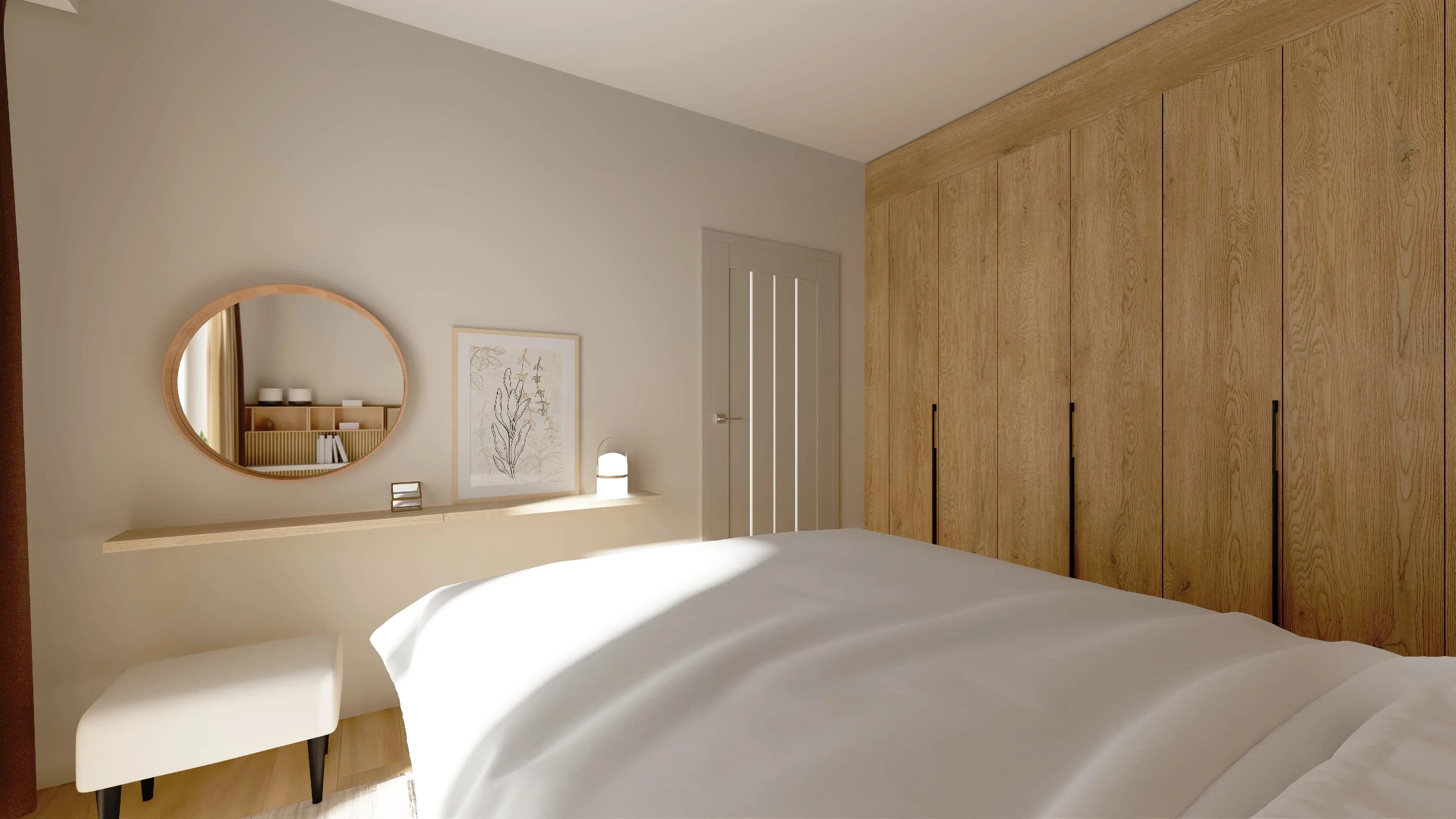 Sypialnia, choć niewielka, pełni rolę miejsca do odpoczynku i garderoby. Dwie szafy 140x240 cm tworzą pojemną zabudowę, a dzięki dopasowanym blendom wyglądają jak wykonane na wymiar. Na tapicerowanym łóżku z wezgłowiem można spokojnie się wyspać. Powieszone na ścianie półki spełniają funkcję szafki nocnej i toaletki, pozwalając zaoszczędzić przestrzeń.