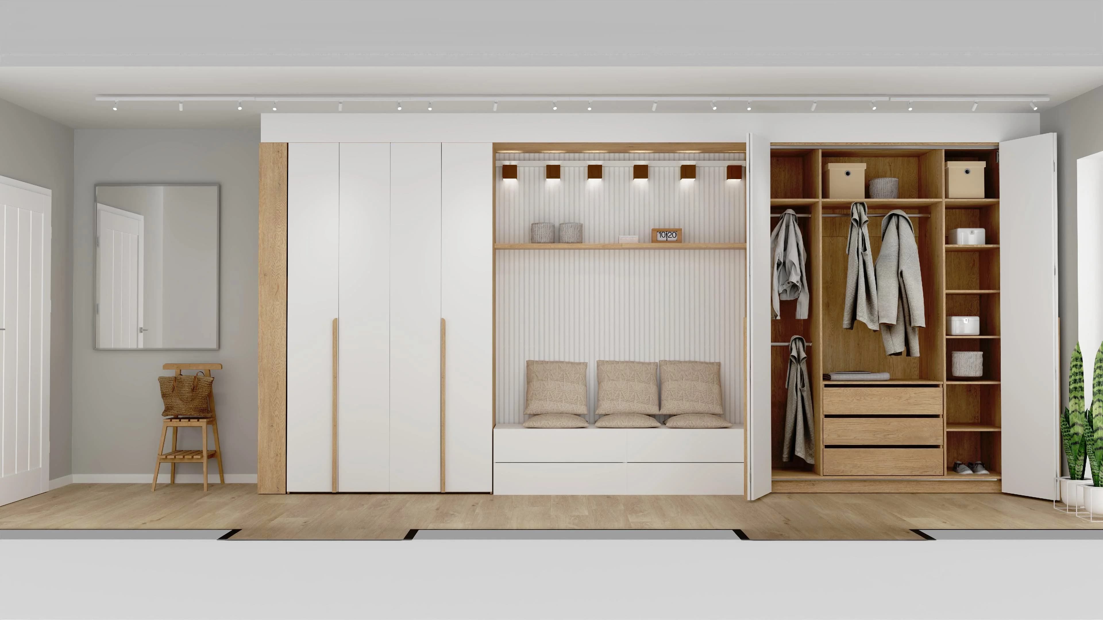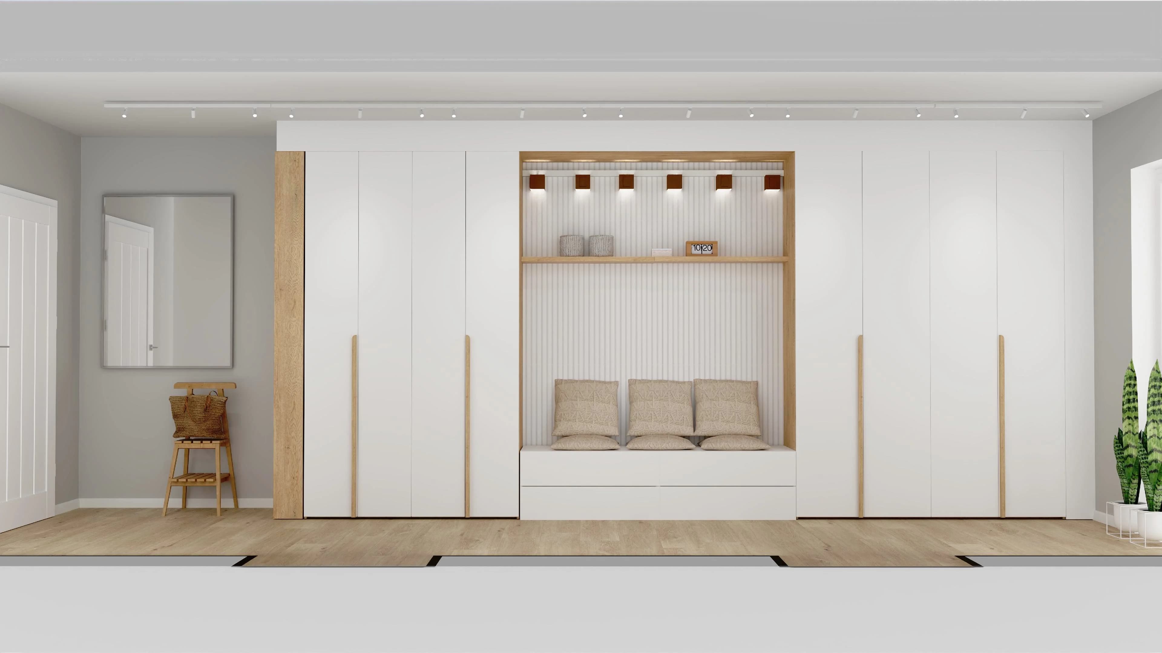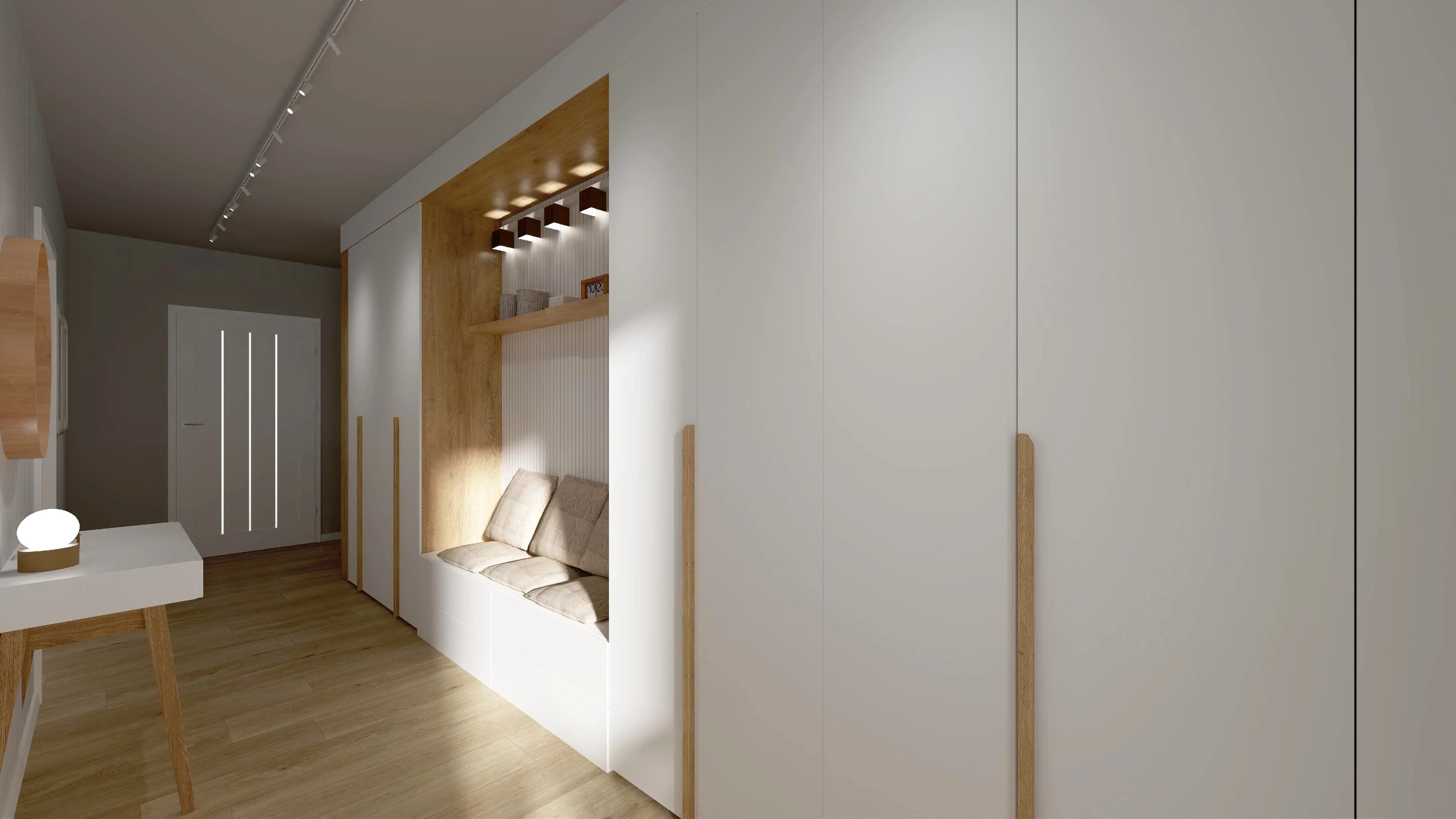 Wąska garderoba z zabudową z białych szaf