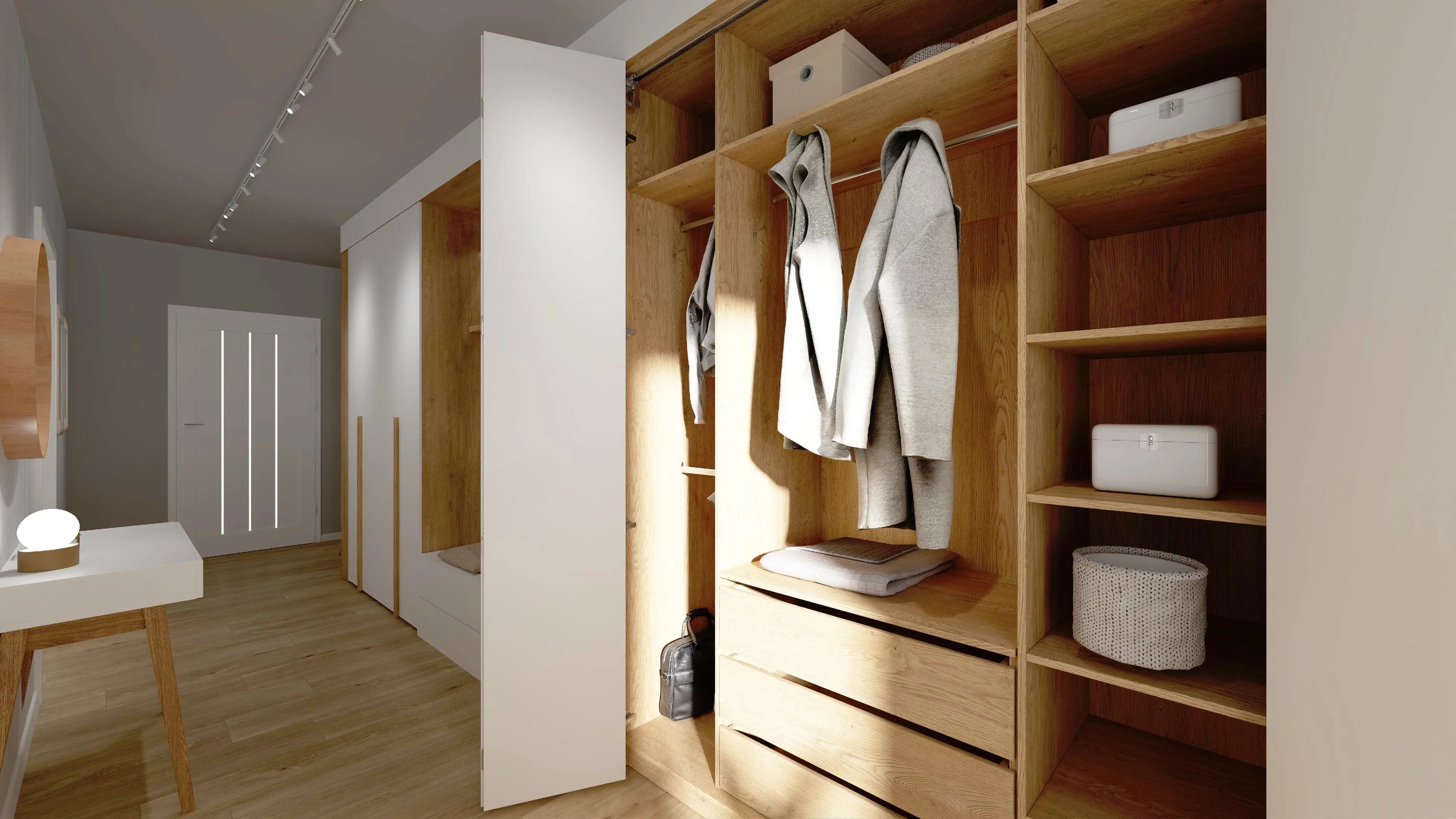 Długi, nieustawny pokój został funkcjonalnie zaaranżowany. Najważniejszą rolę pełni w nim zabudowa, składająca się z dwóch pakowanych szaf (140x240 i 175x240 cm) oraz jednej bocznej, estetycznie wpasowana dzięki blendom. Jasna podłoga w ciepłym odcieniu dębu dodaje wnętrzu przytulności. Aranżację uzupełnia duże lustro na ścianie i wygodna toaletka.