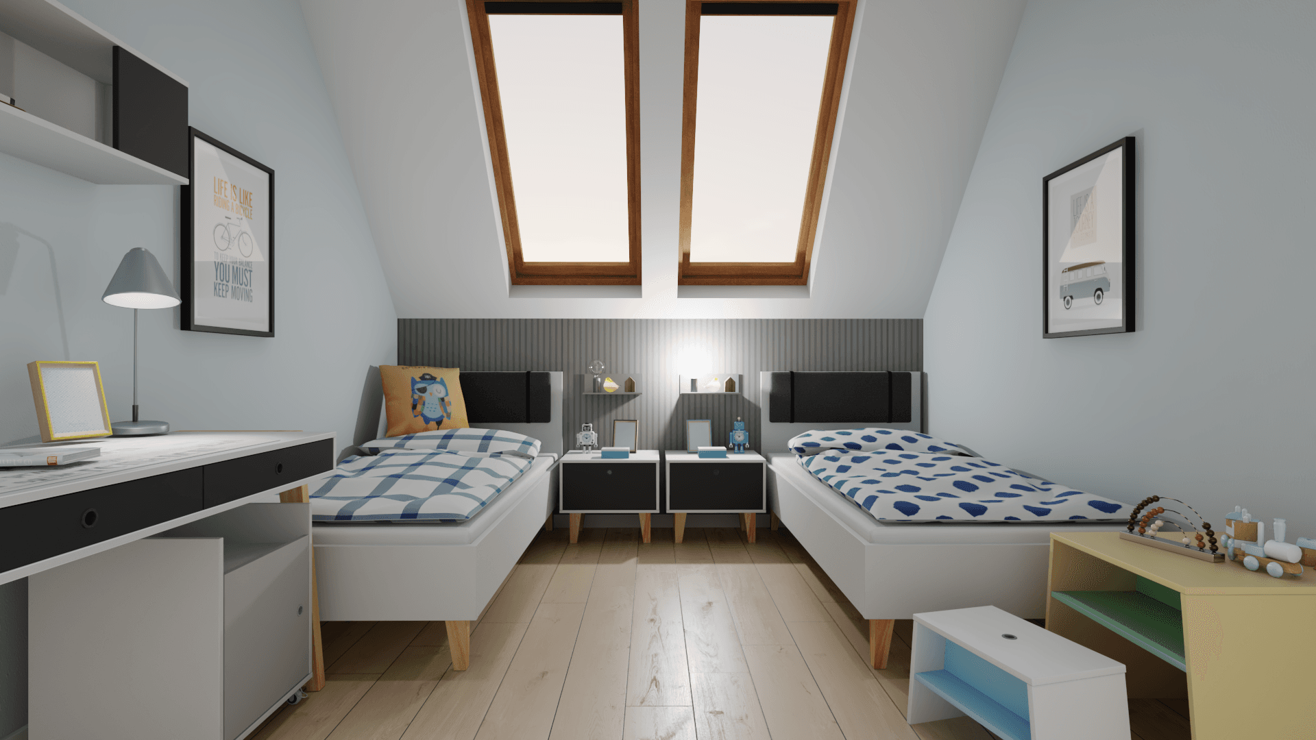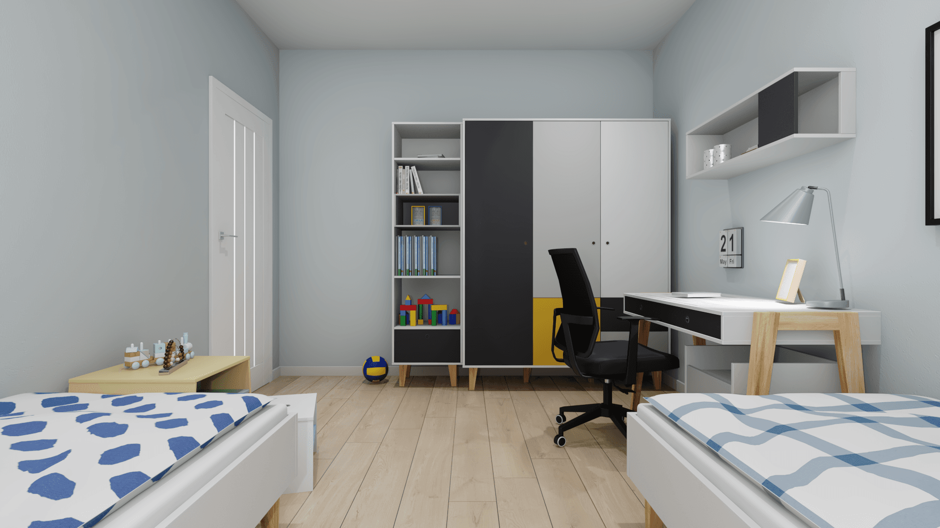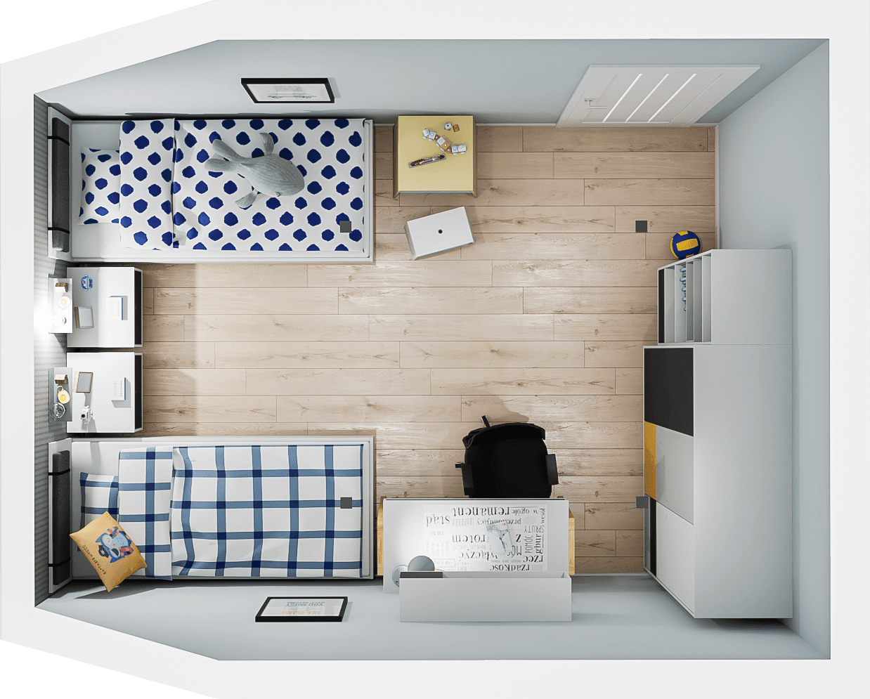 Dzięki praktycznym meblom pokój starszaków może dorastać wraz z nimi. Gdy dzieci zapragną zmiany, wystarczy wymienić kolorowe fronty i nowa aranżacja gotowa. Przy biurku znajdzie się wiele przestrzeni do kreatywnej zabawy, a liczne szafki pomieszczą ubrania i zabawki. Komfortowemu snu sprzyjają dwa niezależne łóżka i szafki nocne.