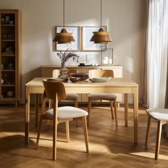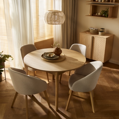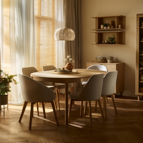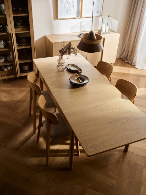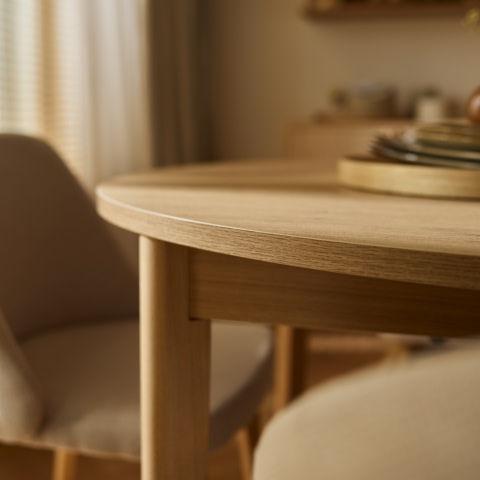 Stoły, dostępne w dwóch wersjach – okrągłej i prostokątnej – zostały wyposażone w wyjątkowo intuicyjny i łatwy system rozkładania, który pozwala w kilka chwil zmienić kameralny mebel w miejsce dla większego grona. Ich spokojna forma i wyważone proporcje sprawiają, że dobrze odnajdują się zarówno w mniejszych przestrzeniach, jak i w otwartych strefach dziennych.