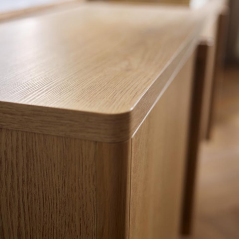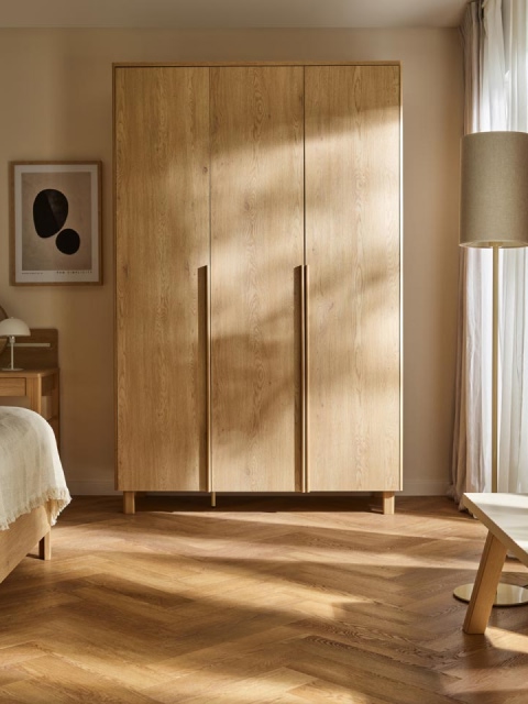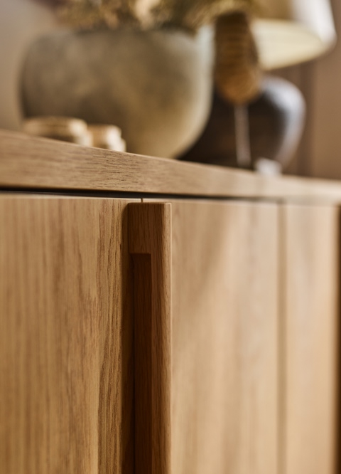Wybrany przez nas dębowy dekor z widocznym rysunkiem drewna podkreśla szlachetność materiału i tworzy subtelną grę faktur, która dopełnia wnętrze. Dodatkowo, pasuje idealnie do szaf z systemu Stor w dębowym kolorze, dając jeszcze więcej możliwości aranżacyjnych.