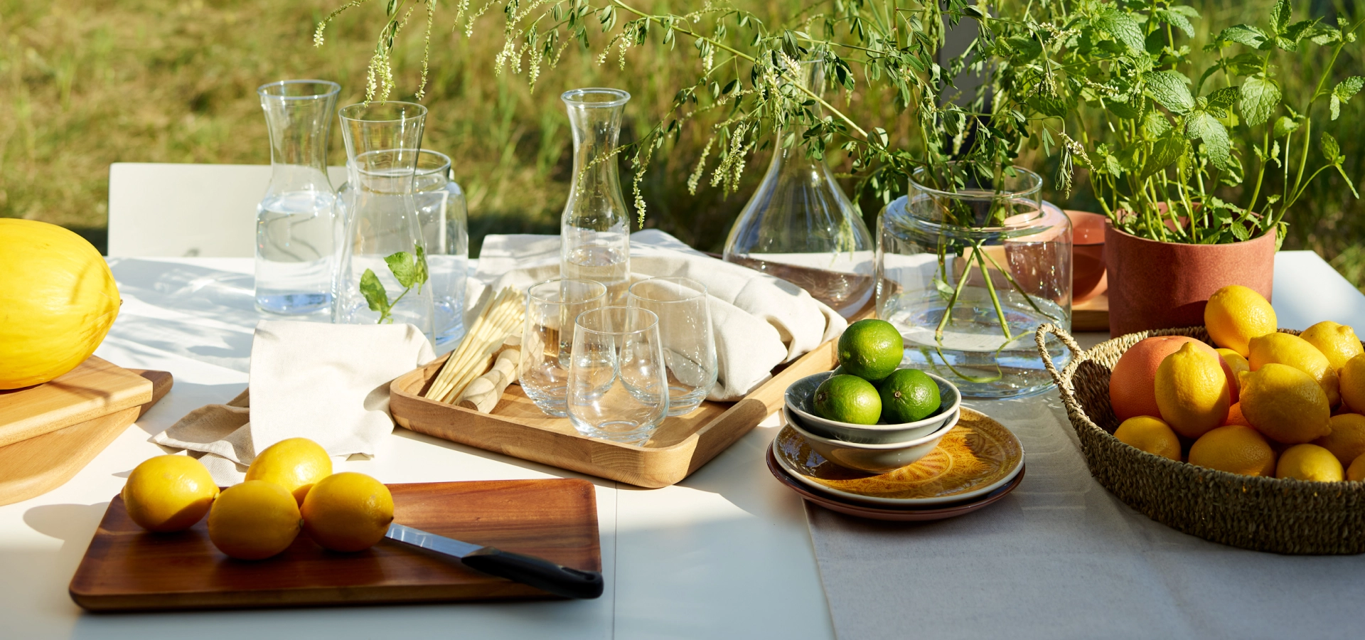 Rodzinny obiad na tarasie możemy przygotować z użyciem barwnych talerzy, szklanych karafek na wodę i misek na owoce. Z kolei przekąski podczas balkonowego party możemy zaserwować na drewnianych albo rattanowych tacach.