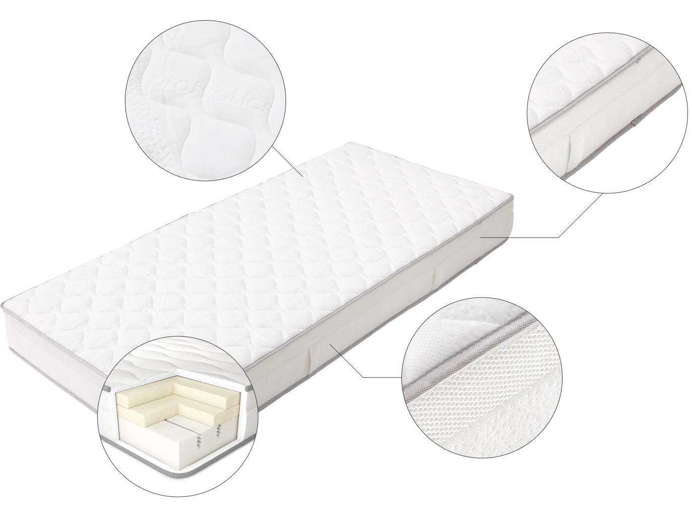 Materac Solti • pokrowiec ma właściwości antybakteryjne • uchwyty ułatwiają podnoszenie materaca, a pokrowiec można ściągnąć do prania • taśma 3D wspomaga wentylację materaca • lekka pianka o wysokiej elastyczności pozwala stosować materac z regulowanymi stelażami