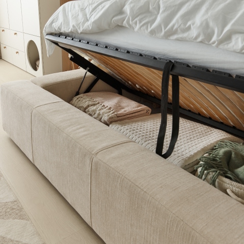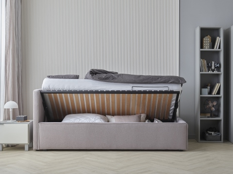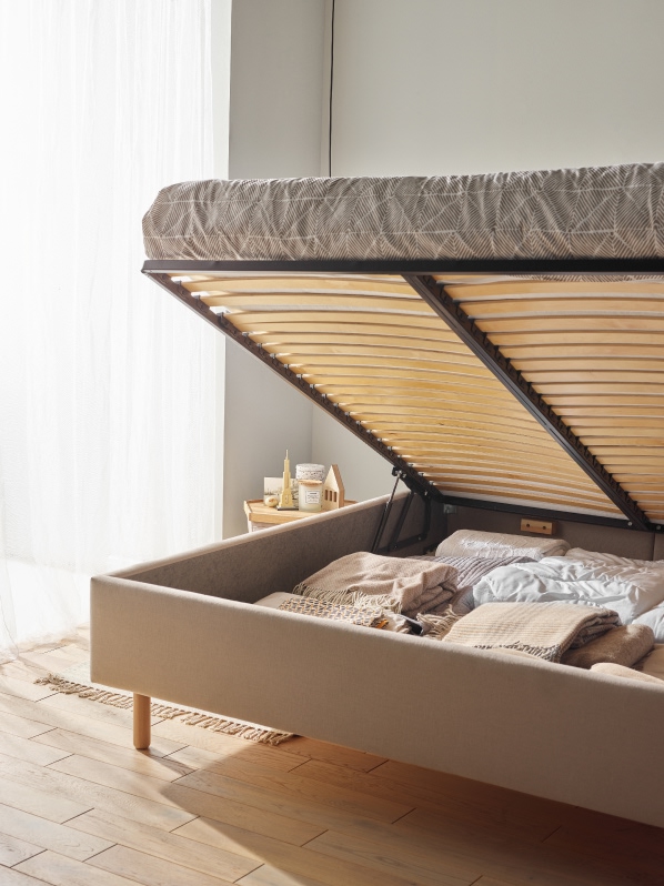 Pod uchylnym stelażem w wielu modelach łóżek VOX kryje się pojemny schowek, idealny na pościel, walizki czy sezonową odzież, który pomaga utrzymać sypialnię w porządku i maksymalnie wykorzystać przestrzeń.