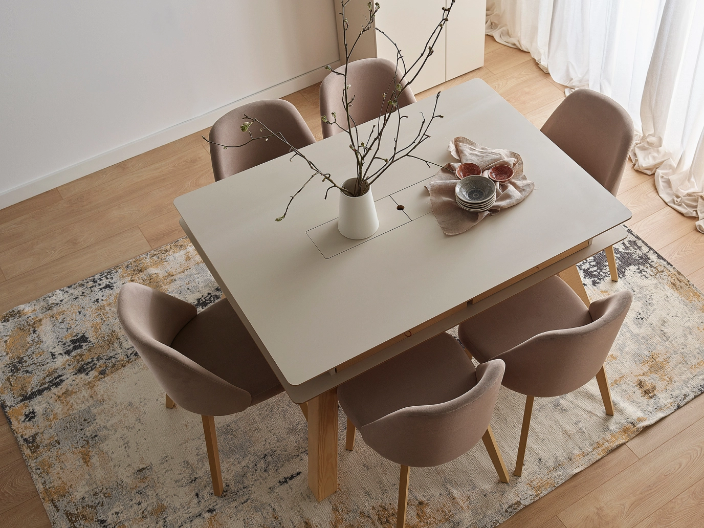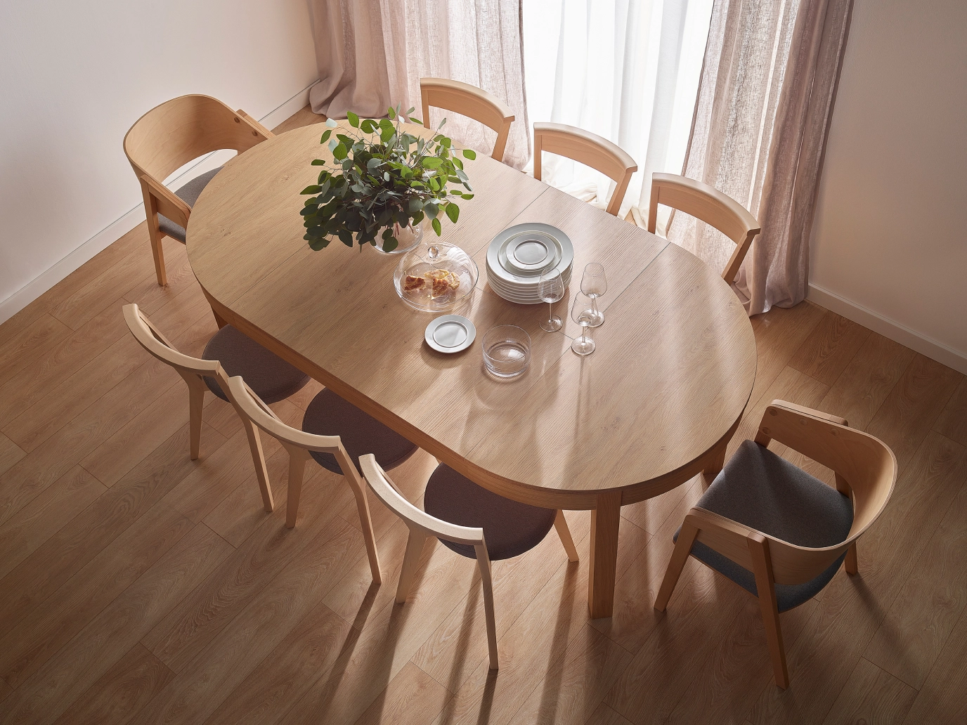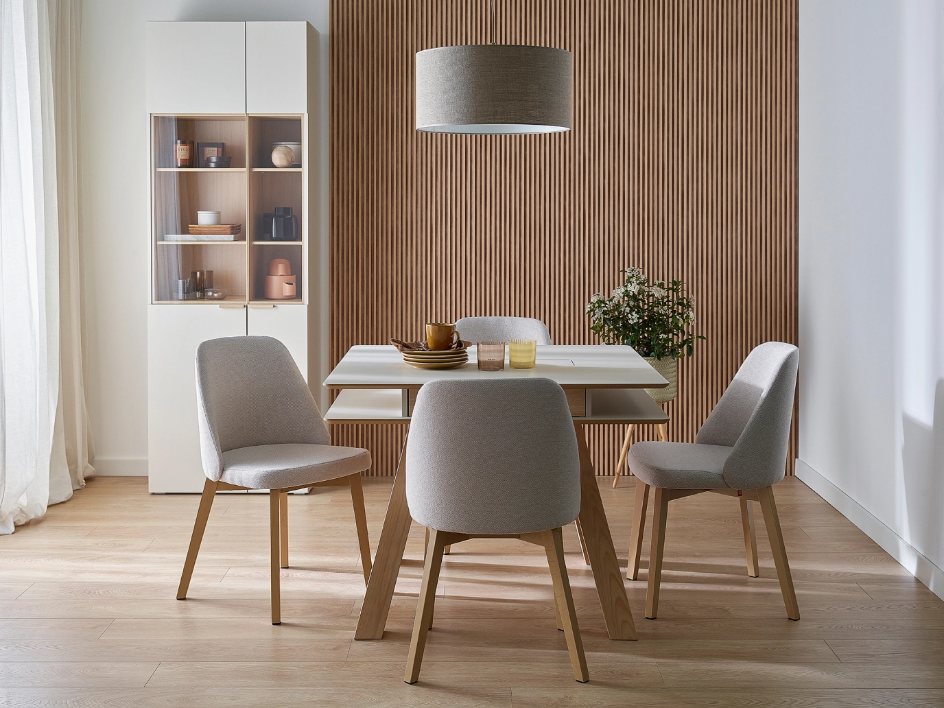Idealnym dopełnieniem stołu 4 You Fresh będą komfortowe krzesła tapicerowane Komm. Siedziska w kolorze piaskowego beżu i nogi z bukowego drewna stworzą spójną całość z kolorystyką stołu.