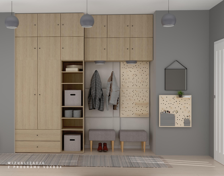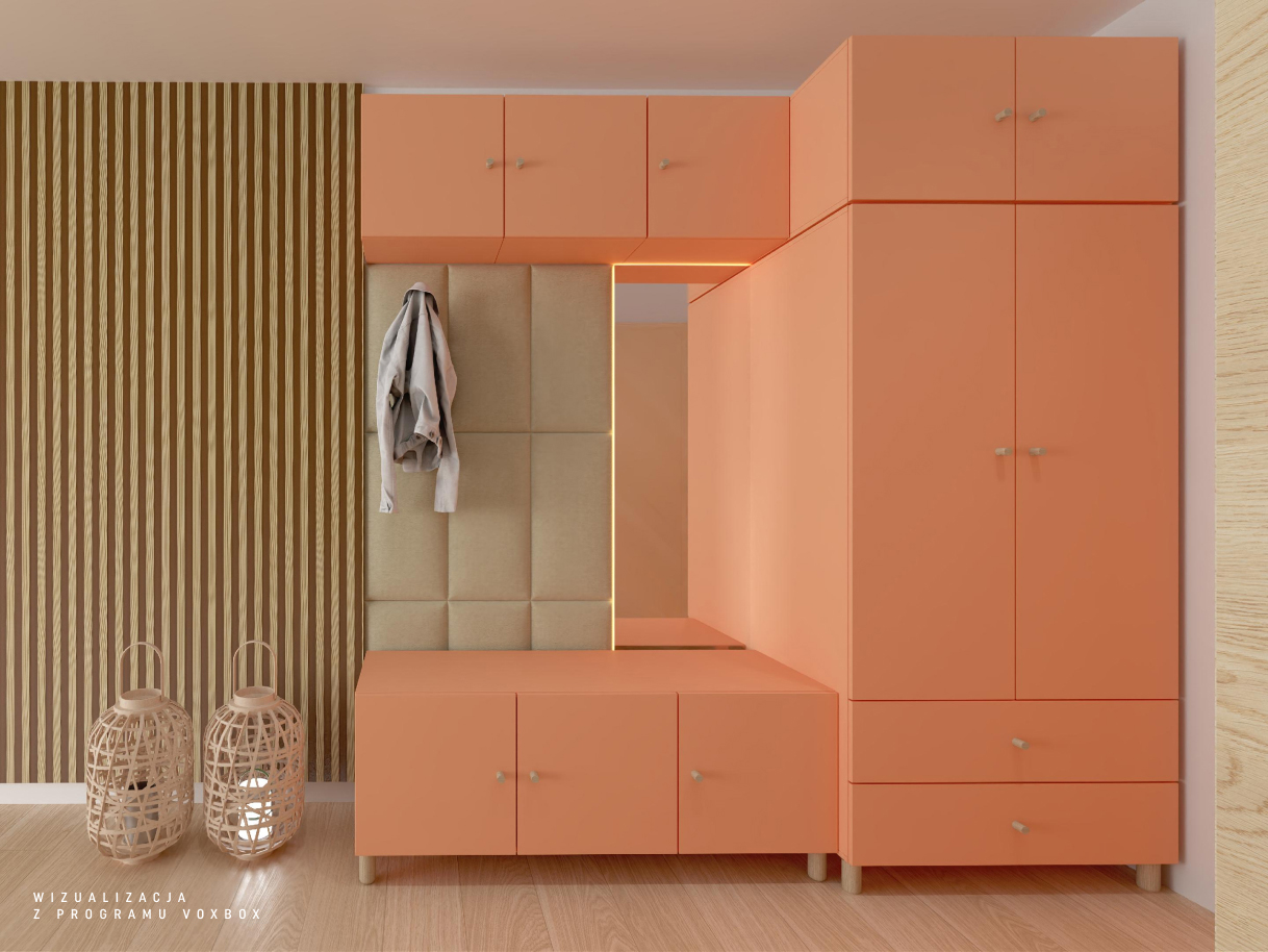 W tej niewielkiej przestrzeni zastosowano sprytne rozwiązania sprzyjające jak najlepszej organizacji. Sięgające sufitu meble, dzięki szufladom, drążkom z wieszakami i zamykanym półkom, mieszczą najróżniejsze przedmioty. W utrzymaniu porządku pomaga również przestronna komoda. Kącik we wnęce między meblami został wyposażony w miękkie oparcie z paneli tapicerowanych Soform oraz wygodny puf, idealny do komfortowego zakładania butów.