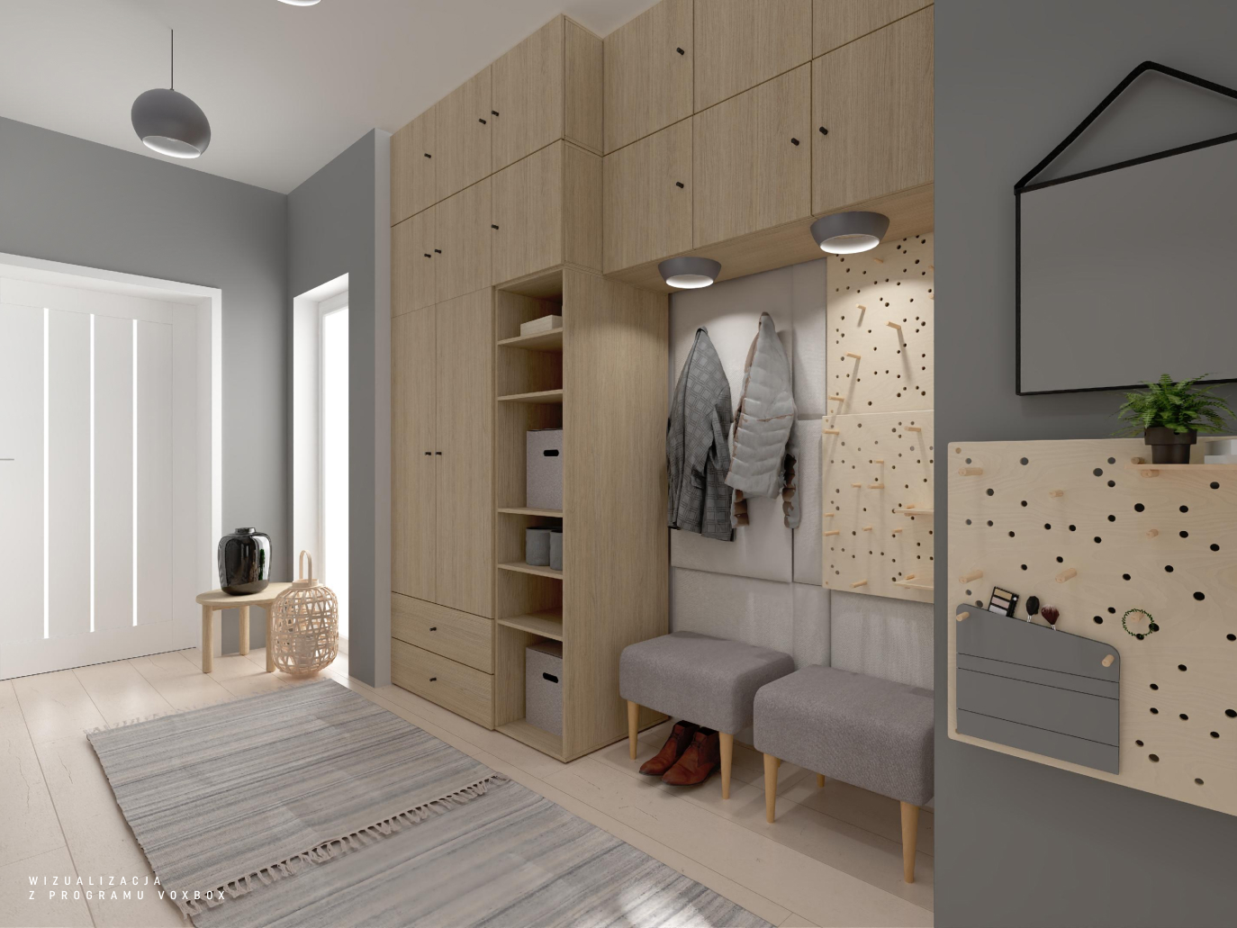 Dzięki funkcjonalnym meblom i akcesoriom wąski korytarz zamienił się w elegancko zaaranżowaną przestrzeń z miejscem do przechowywania. Pakowne szafy oferują liczne schowki na odzież, obuwie i dodatki. Organizację drobiazgów ułatwiają tablice Slot wykończone brzozowym fornirem. Ciepły kolor drewna harmonijnie łączy się z jasną szarością i bielą.
