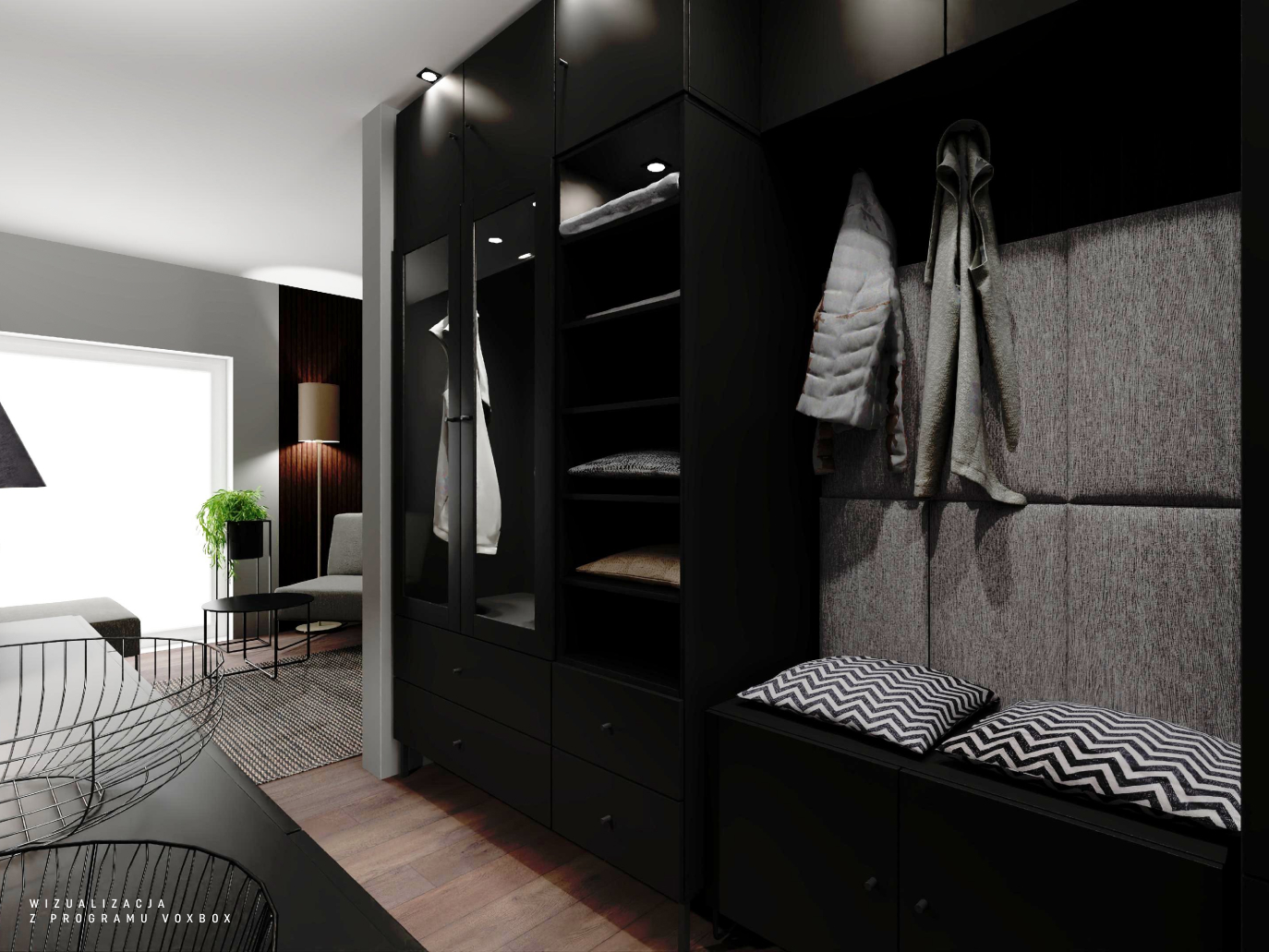 Dzięki zastosowaniu ciemnej palety barw korytarz prezentuje się bardzo szykownie. Przeszklone szafy służą do organizacji garderoby domowników, a elegancka toaletka oferuje miejsce na najważniejsze drobiazgi. Szykowanie do wyjścia ułatwiają niskie, wygodne fotele. Po powrocie do domu wystarczy umieścić kurtkę i torebkę we wnęce z tapicerowaną ścianą.