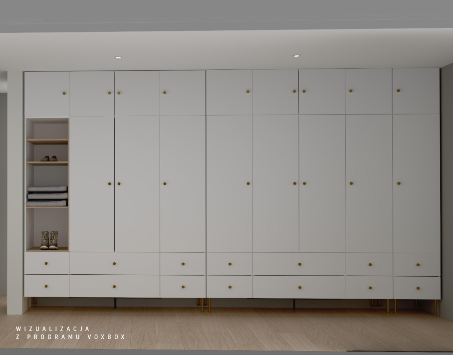 Dzięki estetycznej zabudowie ściany długi korytarz stał się bardzo praktyczny. Pakowne szafy zapewniają wiele przestrzeni do przechowywania odzieży, a w otwartych wnękach można poukładać przedmioty, które chce się mieć pod ręką. Luksusowy akcent stanowią nóżki i uchwyty mebli w złotym kolorze.