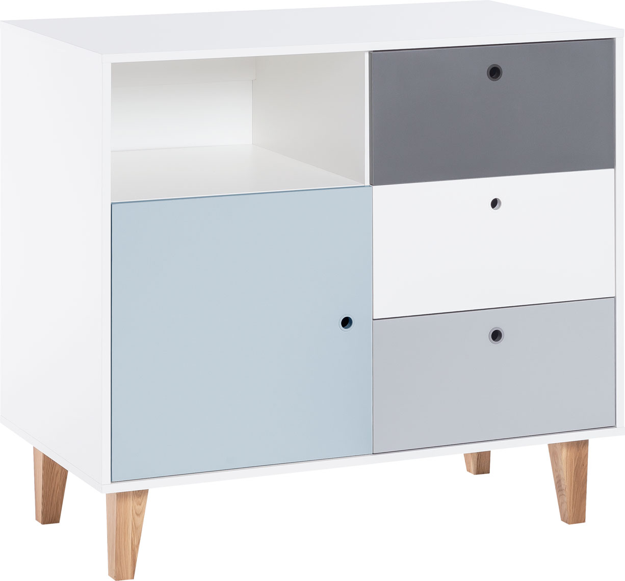 - W lewej górnej części komody znajduje się poręczna, otwarta przestrzeń – pomieści ulubioną serię książek, wybrane zabawki lub funkcjonalne organizery.