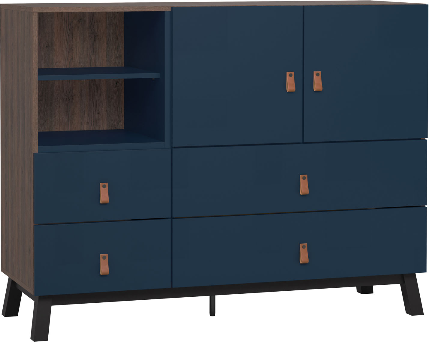 - Do komody możesz wstawić różnej wielkości drzwi, fronty szklane, półki lub szuflady. Alternatywnie pozostaw otwarte przestrzenie, by bez problemu pomieścić większe przedmioty.