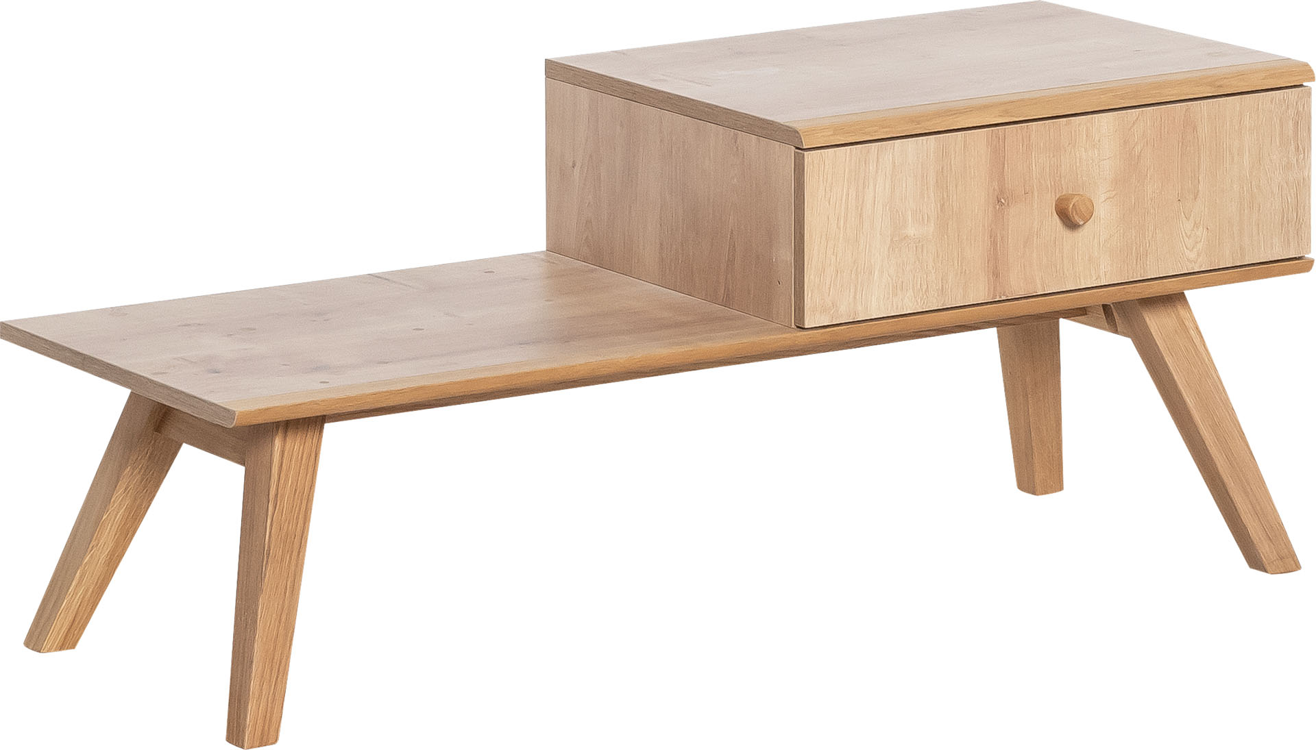 - Blat ławki oraz korpus szuflady mają kolor dębowy dzięki okleinie z drewnianym dekorem. Wnętrze szuflady ma z kolei kolor biały.