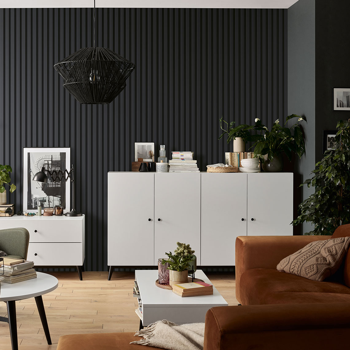 - Panele w antracytowym kolorze świetnie sprawdzą się w kameralnych aranżacjach. Harmonijnie zgrają się z ciemnymi meblami i dodatkami. Zestawiając je z jasnym wyposażeniem, uzyskamy ciekawy kontrast.