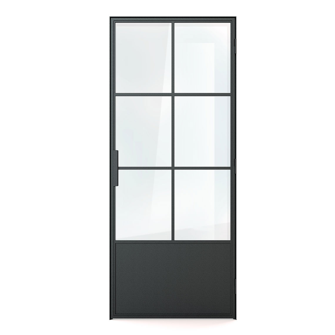 Drzwi Barcelona to klasyczne drzwi loftowe z górną częścią szklaną 3x2 i dolną częścią stałą ze stali.