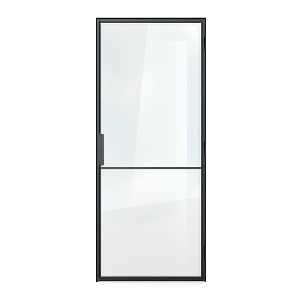 - Drzwi stalowe o profilu zamkniętym. W przypadku wersji ze szprosem, szpros jest konstrukcyjny 20 mm, obustronnie spawany - nie jest naklejany. Z jednej strony są śruby montażowe, które umożliwiają ewentualną zmianę lub wymianę szyby. Śruby są malowane na czarno, estetycznie wykończone. Drzwi wyposażone są w domyk na magnes oraz pochwyt w postaci kątownika.