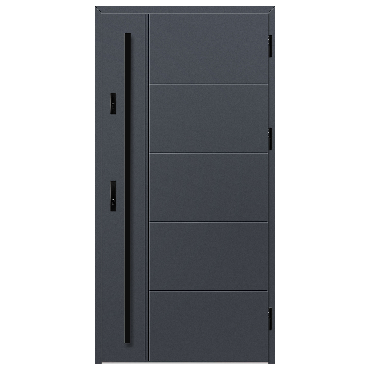 Ościeżnica aluminiowa, malowana na czarno i oklejona w kolorze skrzydła drzwiowego wyposażona w ciepły próg aluminiowy i pełną listwę zaczepową z regulacją docisku.