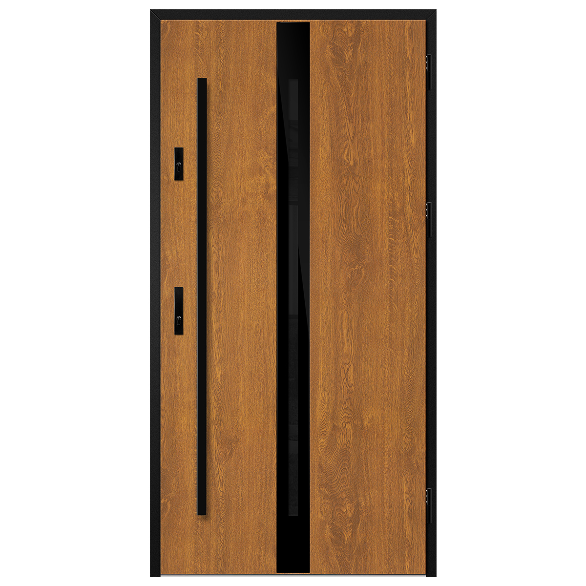 Ościeżnica aluminiowa, malowana na czarno i oklejona w kolorze skrzydła drzwiowego wyposażona w ciepły próg aluminiowy i pełną listwę zaczepową z regulacją docisku.