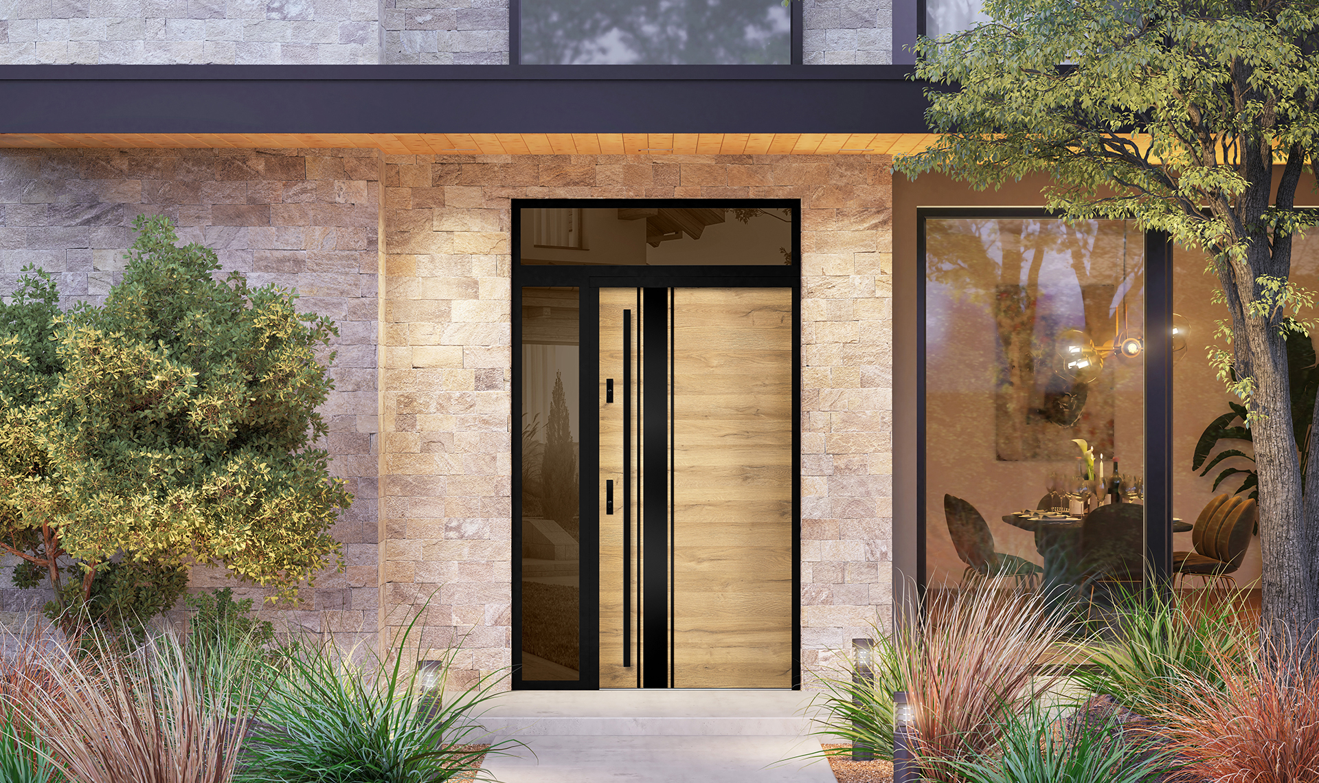 Ościeżnica aluminiowa, malowana na czarno i oklejona w kolorze skrzydła drzwiowego wyposażona w ciepły próg aluminiowy i pełną listwę zaczepową z regulacją docisku.