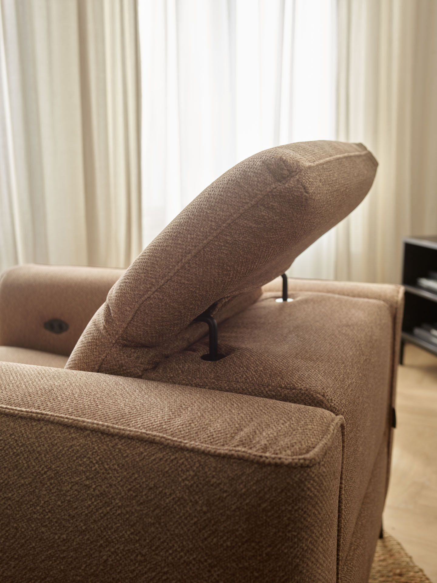 - Jego zagłówek można ustawić w dowolnej pozycji. Podniesienie go zapewni wygodną podporę dla odcinka szyjnego kręgosłupa, a opuszczenie sprawi, że mebel wyda się bardziej kompaktowy.