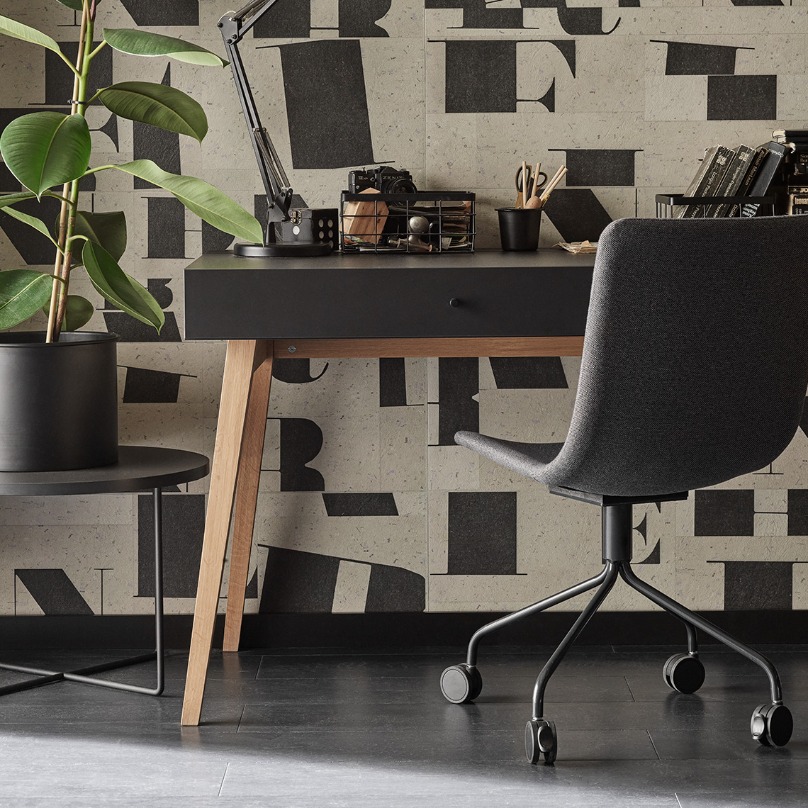 Panele Geometric Typography zdobi motyw liter nakreślonych atramentem na czerpanym papierze. Wytrzymałe wykończenie ściany w stonowanych odcieniach beżu i czerni stanowi inspirujące tło do pracowni, gabinetu lub biura. Charakter wzoru podkreśla wyczuwalna struktura.