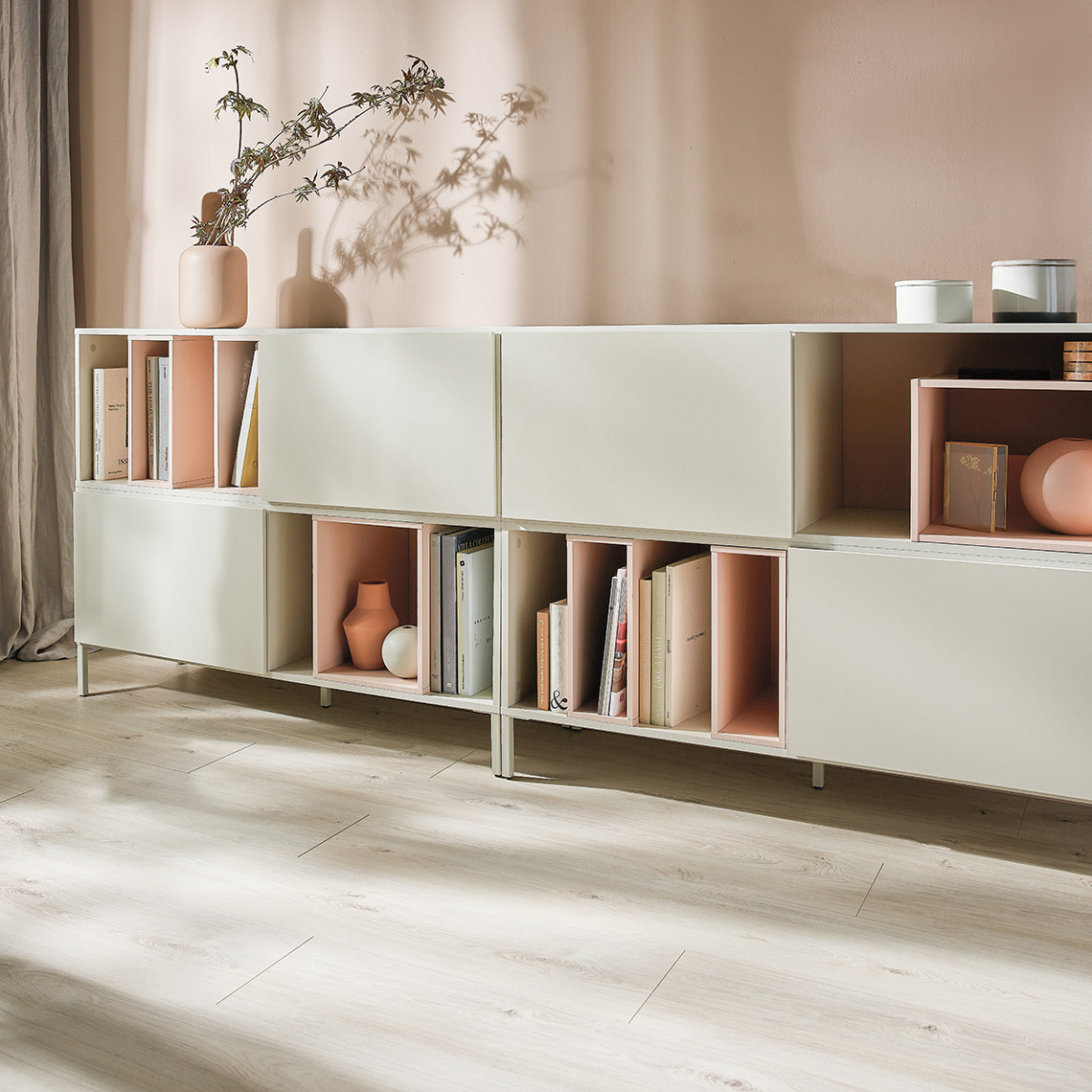 - Skrzynki duże i małe INTO są dostępna w 3 kolorach: cava beż, pudrowy róż oraz dekor dębowy.