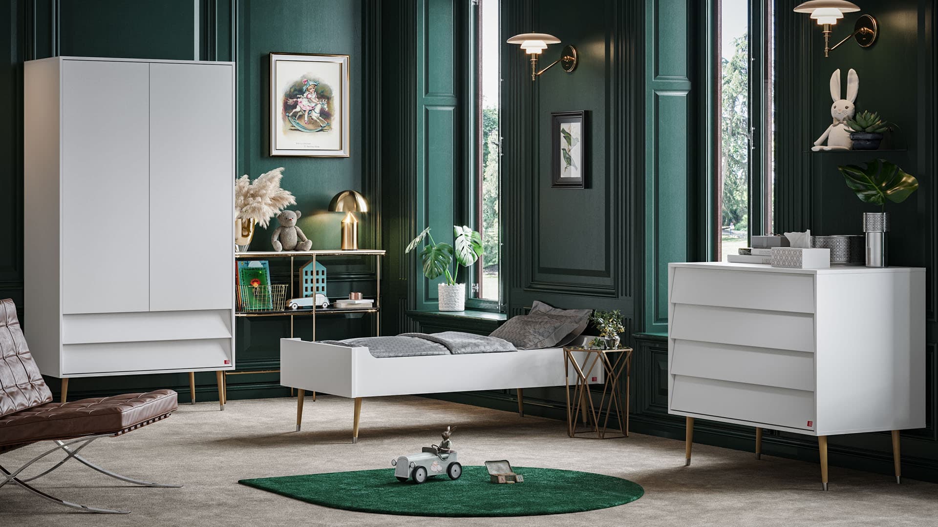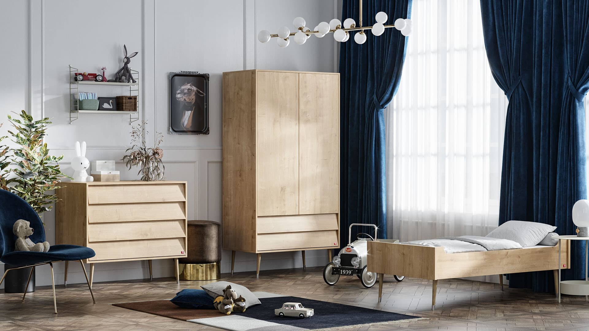 - Pokój dziecięcy warto wyposażyć także w dopasowaną stylistycznie szafę i łóżeczko.