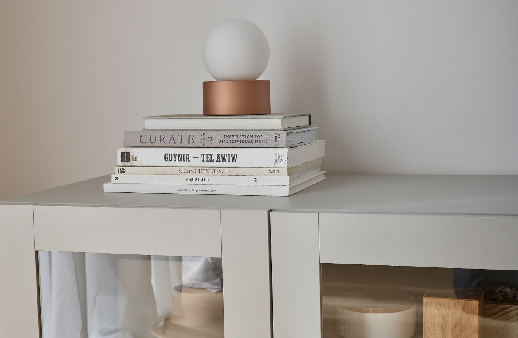 - Podstawa o kawowym odcieniu brązu idealnie łączy się z mlecznym, szklanym kloszem, tworząc harmonijną, a zarazem ciepłą kompozycję.